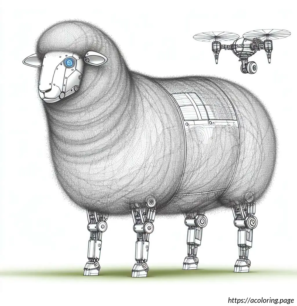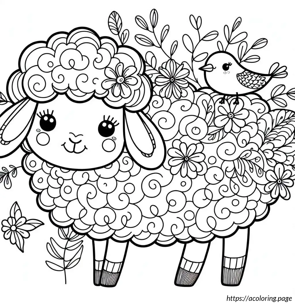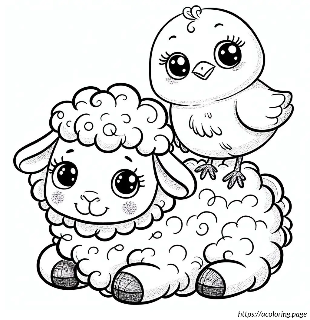 Perched on the sheep’s back is a small bird, which appears to be chirping or singing, based on its open beak. The bird has a round body, small wings, and little feet. Both characters are drawn in a cartoonish style, making them appear endearing and approachable, ideal for engaging young children or for decorative purposes.