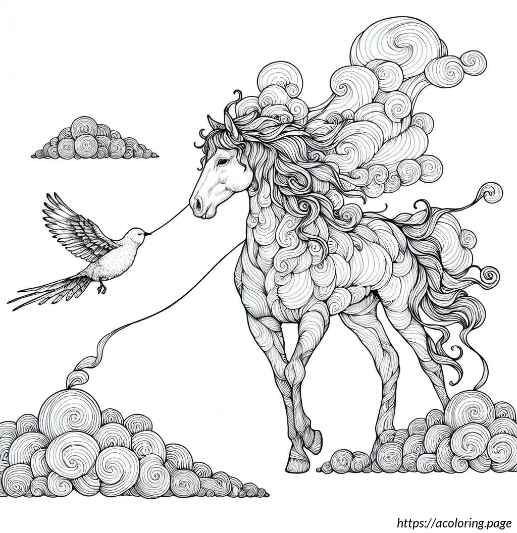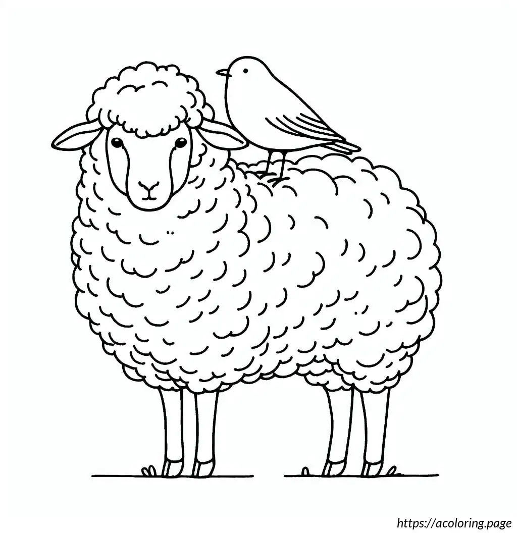 The image depicts a cute and simple line drawing, suitable for a coloring book, featuring a sheep and a bird. The sheep, which is the larger figure, has a fluffy body with a distinct texture that resembles clouds or cotton. It has a friendly and gentle expression, with large eyes and a small smile. The sheep also has four thin legs and a small tail.