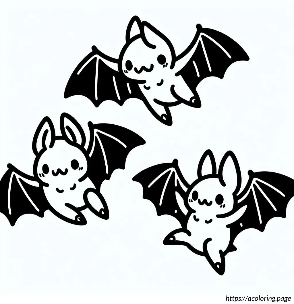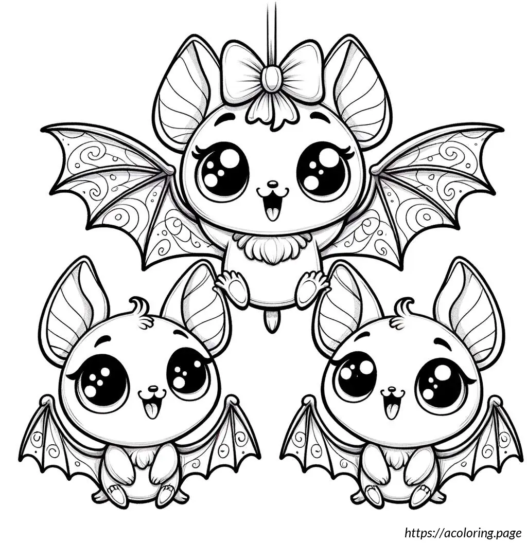 This image is a playful illustration of three cartoon bats depicted in a whimsical and cute style. Each bat has large eyes, giving them an expressive and friendly appearance.