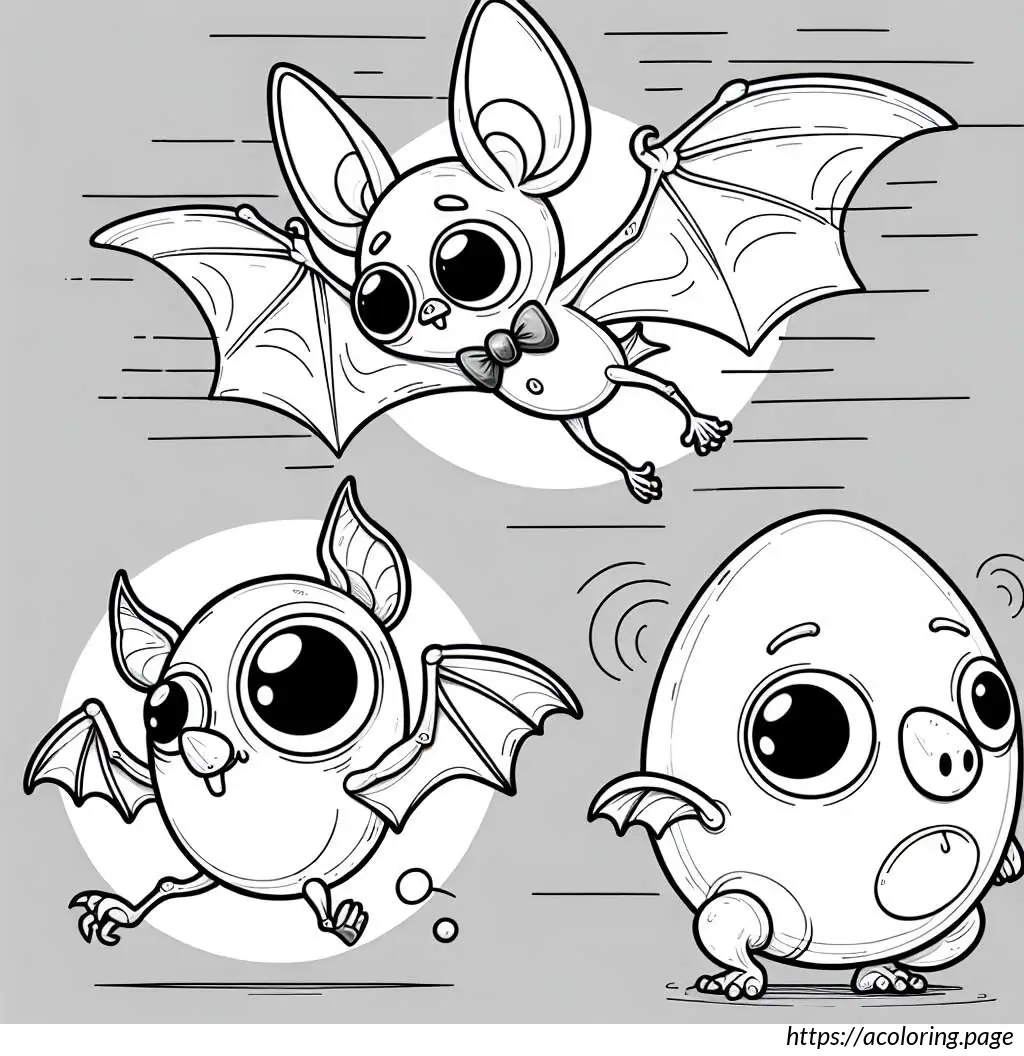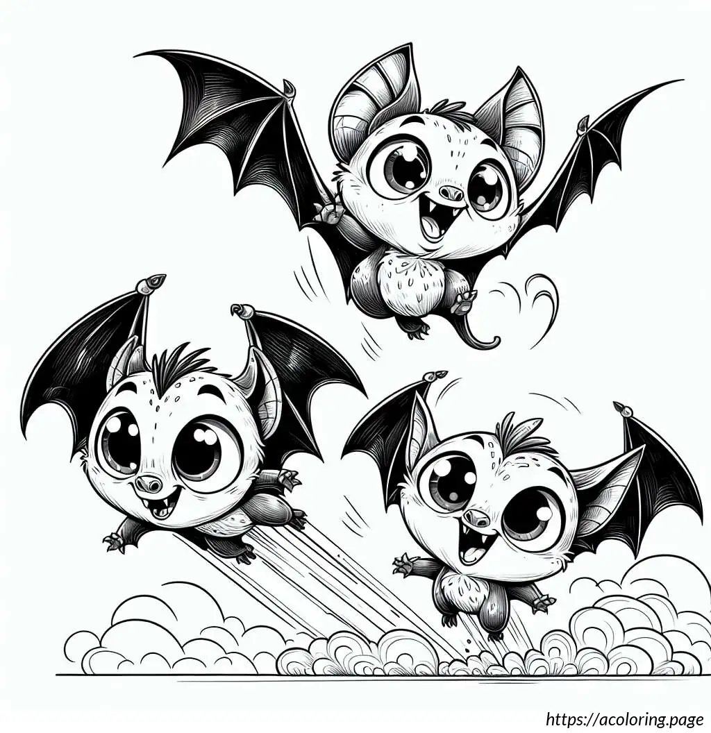 The third bat, depicted at the bottom, has an excited expression with both eyes opened wide and a big, open-mouthed smile showing its teeth. This bat also appears to be in motion, with its posture and the lines beside it suggesting quick movement.