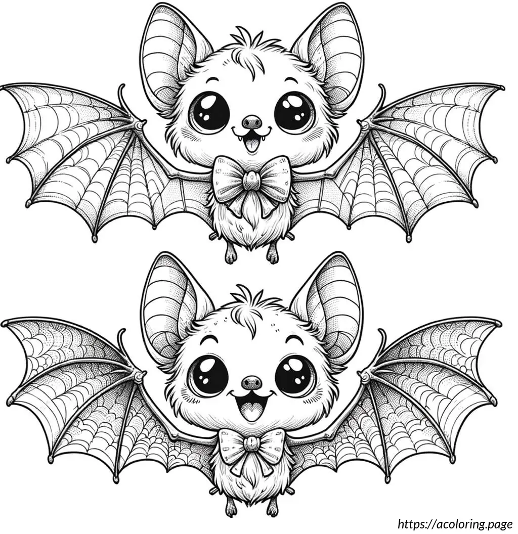 The first bat is portrayed in a slightly tilted position, looking directly at the viewer with one eye bigger than the other, adding to its whimsical charm. It has a perky expression, with its mouth open showing tiny teeth and tongue, and it wears a small bow tie around its neck.