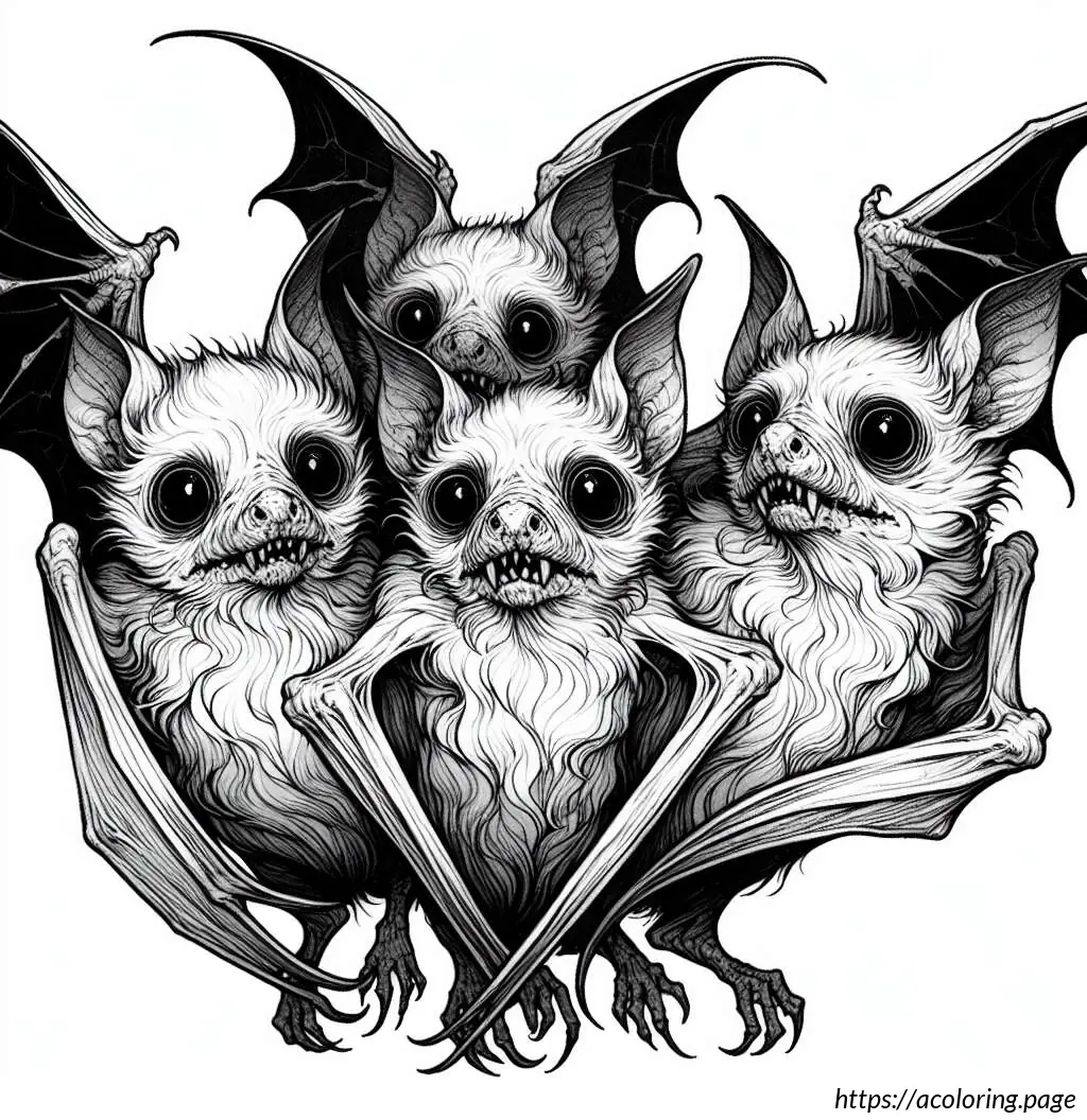 All bats have pointy ears and small bodies with stylized wings that have detailed lines suggesting the texture of bat wings. The drawing uses simple black outlines, and all bats are aligned vertically in a playful, animated manner. This image seems ideal for a children’s book or a friendly educational material on bats.