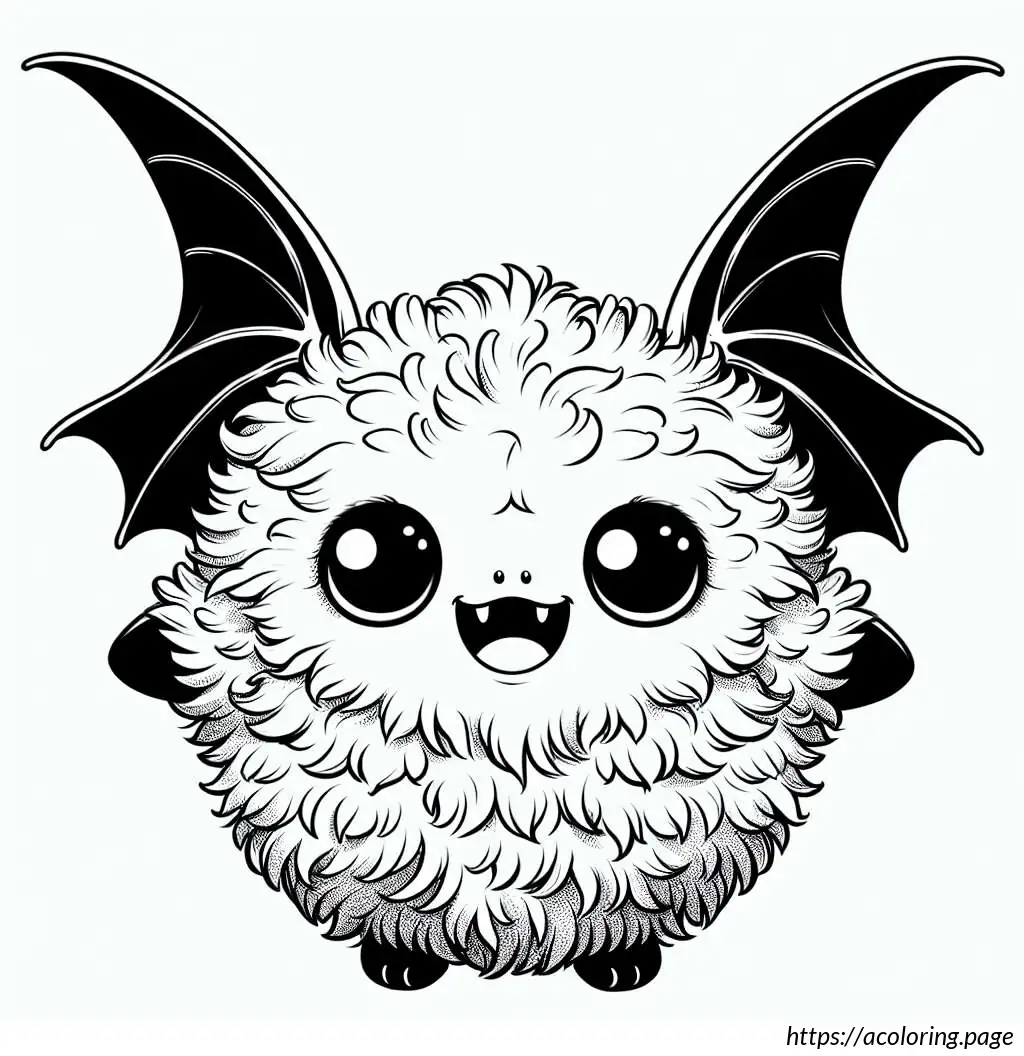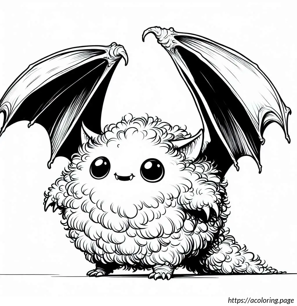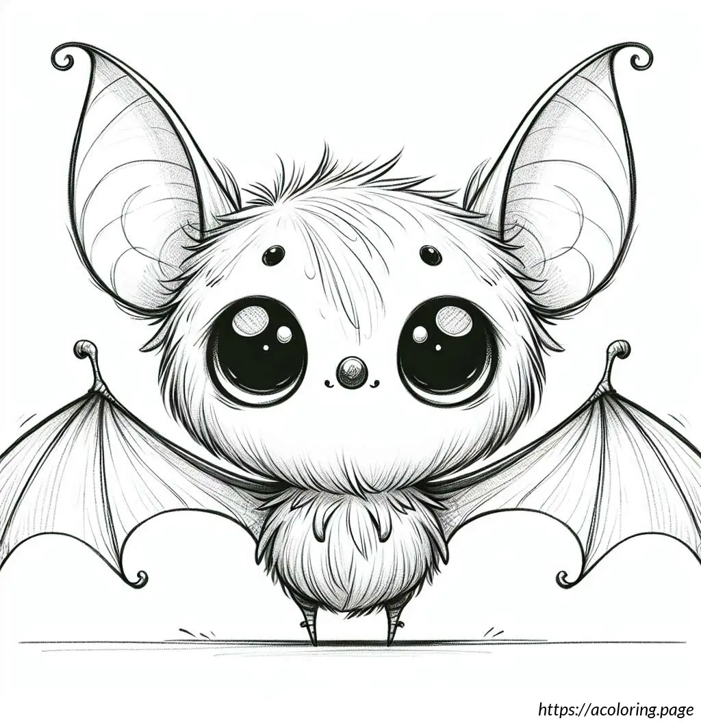 The image depicts a whimsical cartoon of a creature that resembles a bat. The creature has large, pointed ears and big, round eyes which give it a friendly and somewhat goofy expression. Its body is round, fluffy, and covered with fur, featuring two tiny, stick-like legs protruding from the bottom. The bat has expansive wings that are outstretched on both sides, typical of bat anatomy, but styled in a simple, cartoonish manner. The lines used to create the wings are smooth and curving, creating a feel of motion or vibration, emphasized further by little motion lines above the wings. The overall style is very playful and light-hearted, suitable for a children’s book or a cute cartoon character.