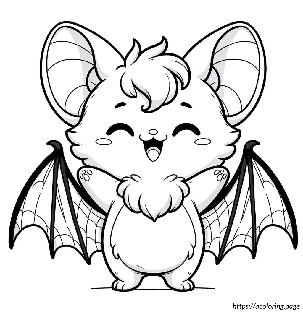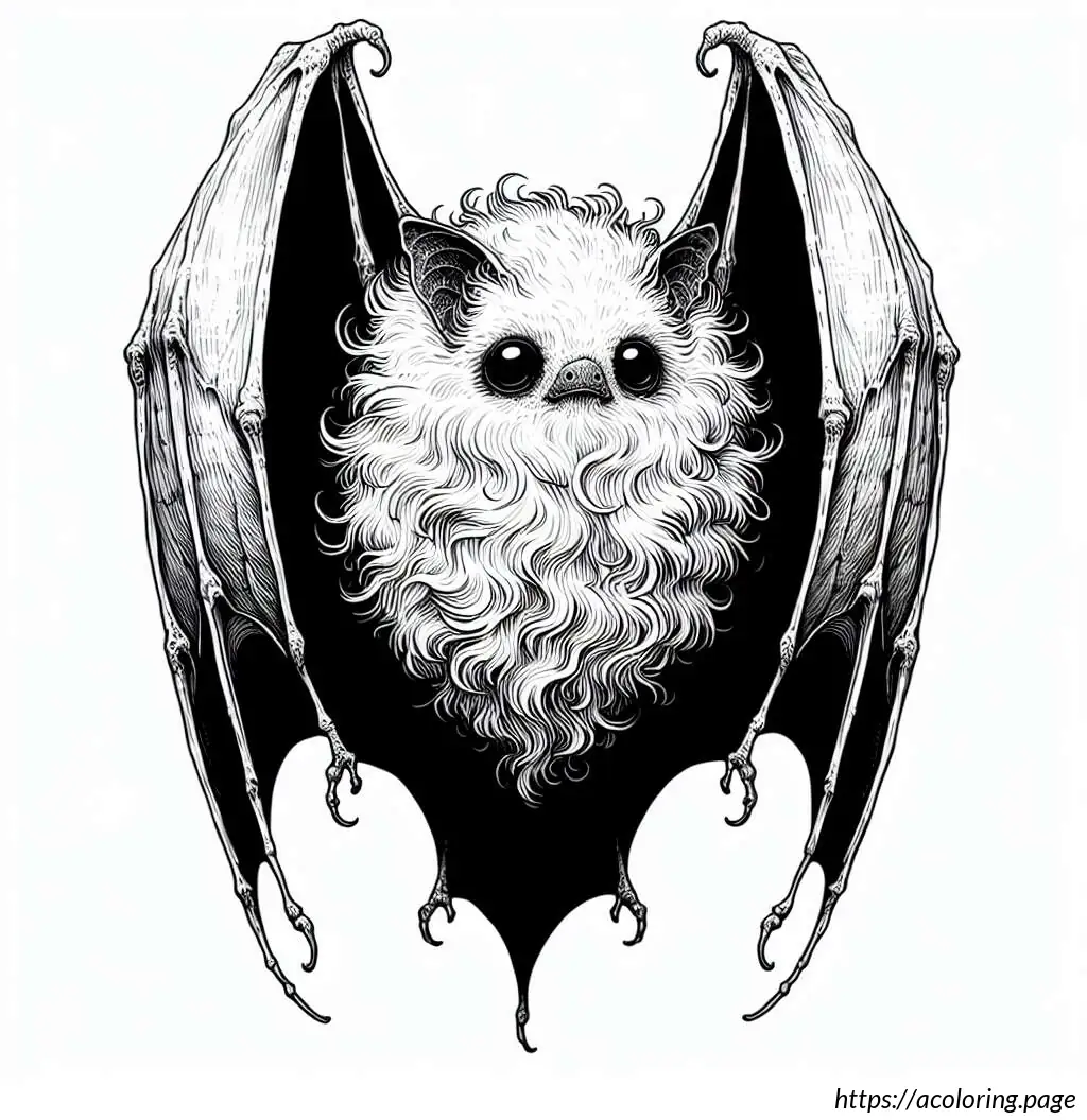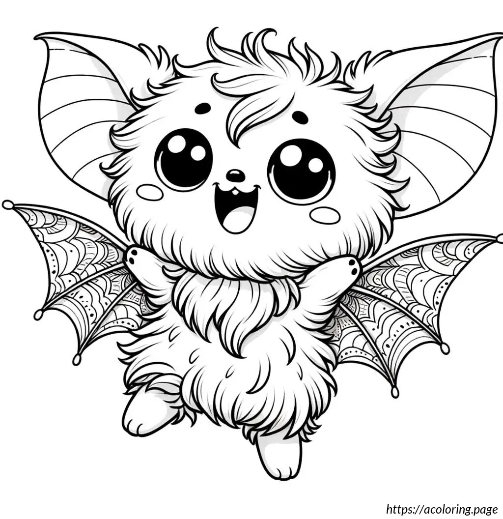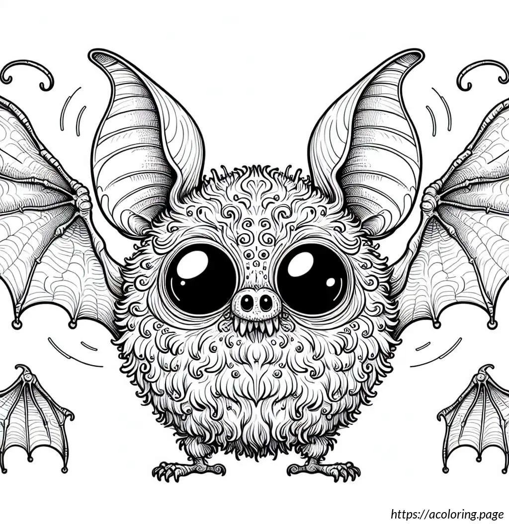 The image depicts a whimsical cartoon of a creature that resembles a bat. The creature has large, pointed ears and big, round eyes which give it a friendly and somewhat goofy expression. Its body is round, fluffy, and covered with fur, featuring two tiny, stick-like legs protruding from the bottom. The bat has expansive wings that are outstretched on both sides, typical of bat anatomy, but styled in a simple, cartoonish manner. The lines used to create the wings are smooth and curving, creating a feel of motion or vibration, emphasized further by little motion lines above the wings. The overall style is very playful and light-hearted, suitable for a children’s book or a cute cartoon character.