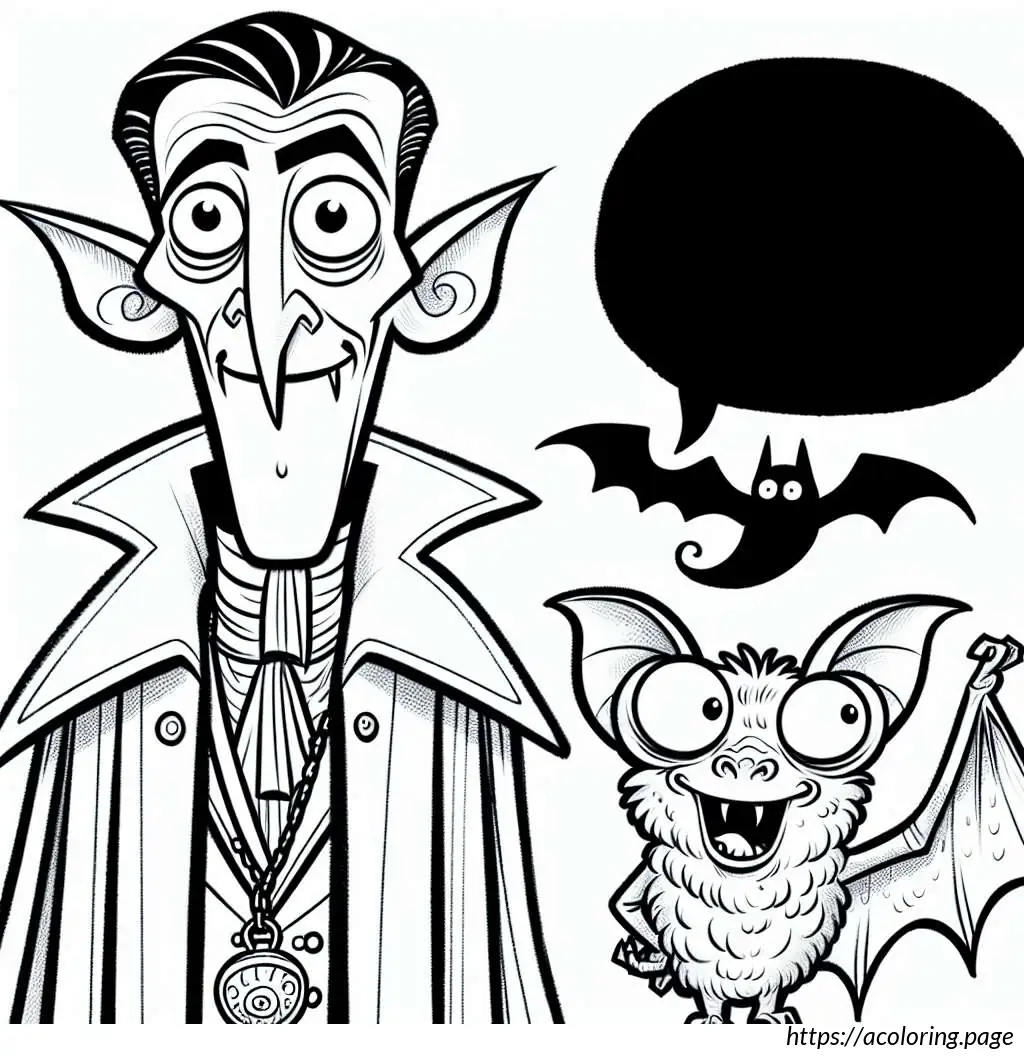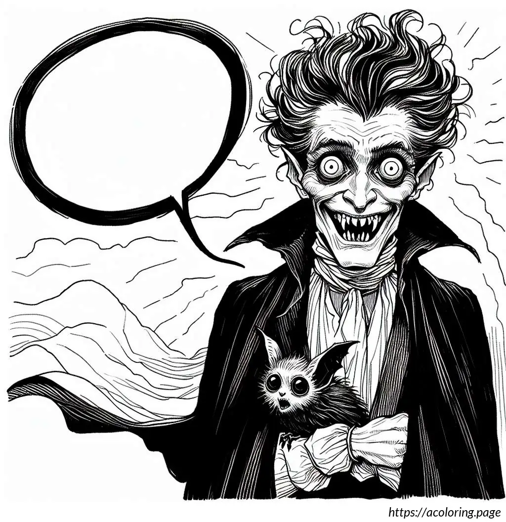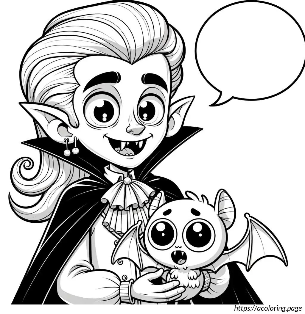 Tucked under the arm of the vampire is a smaller creature, seemingly a bat based on its wings and face. This bat has large, cartoonish eyes and an expression of surprise or alarm, which adds a layer of humor or charm to the depiction. The bat, though clearly subordinate in size to the vampire, complements the theme with its typical association with vampires in folklore.