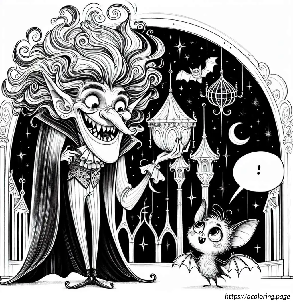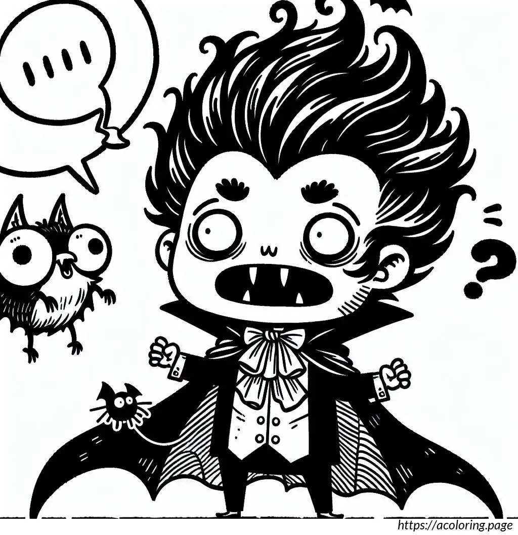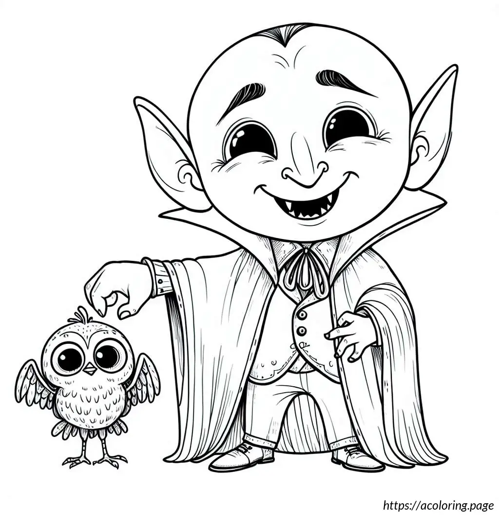 Tucked under the arm of the vampire is a smaller creature, seemingly a bat based on its wings and face. This bat has large, cartoonish eyes and an expression of surprise or alarm, which adds a layer of humor or charm to the depiction. The bat, though clearly subordinate in size to the vampire, complements the theme with its typical association with vampires in folklore.