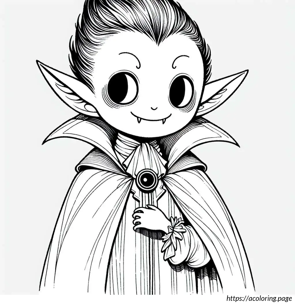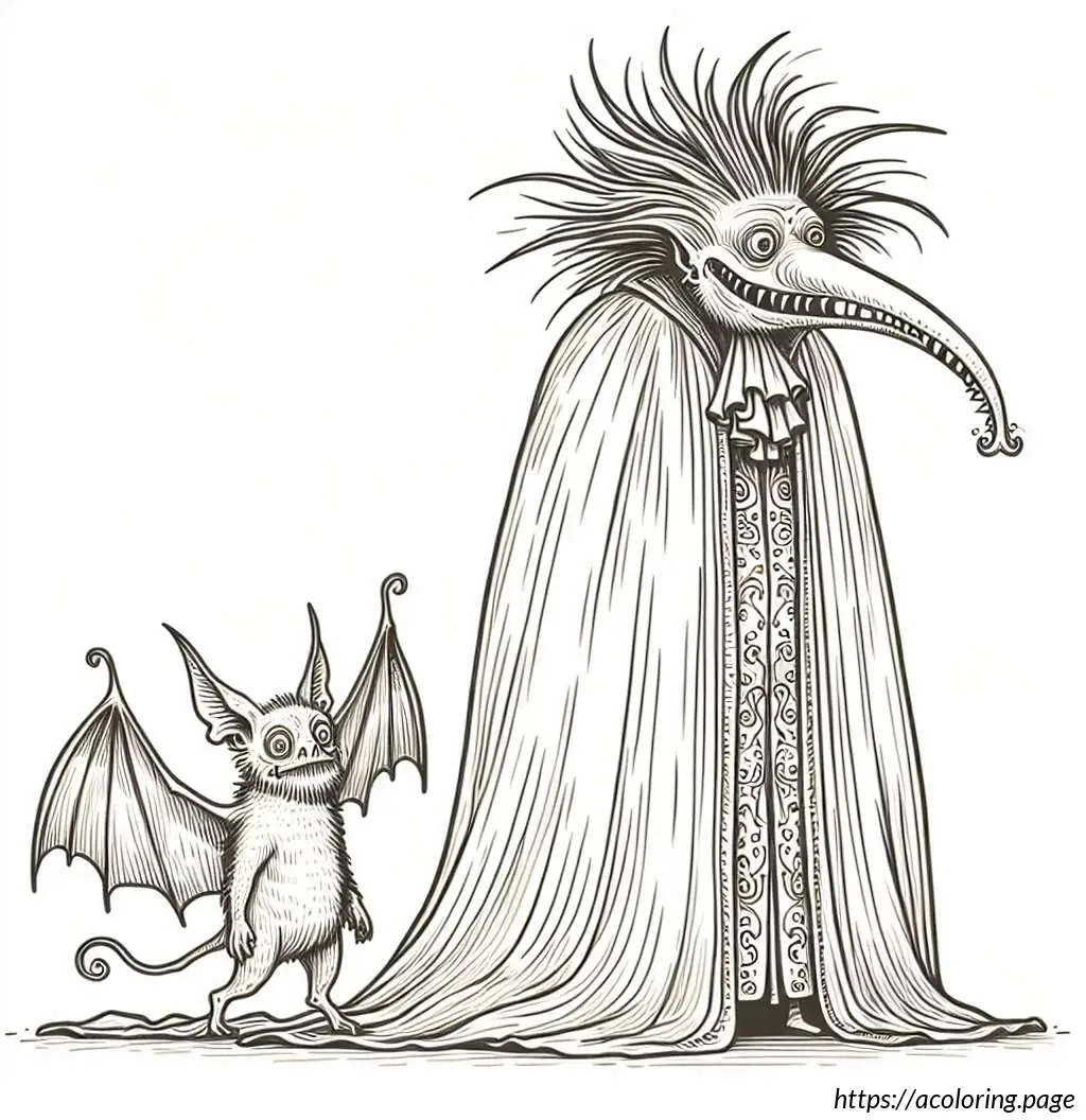 This image features a whimsical cartoon drawing of two characters reminiscent of classic horror or fantastical themes. The first and most prominent figure is a tall, slender vampire character, boasting exaggerated features such as a large pointy nose, wide eyes, tall hair, and pointy ears, which gives him an eccentric and animated appearance. He is wearing a long cape or cloak and is decorated with a small pendant at the neck. He appears to be speaking, as suggested by a speech bubble near his head, which is empty, indicating no text.