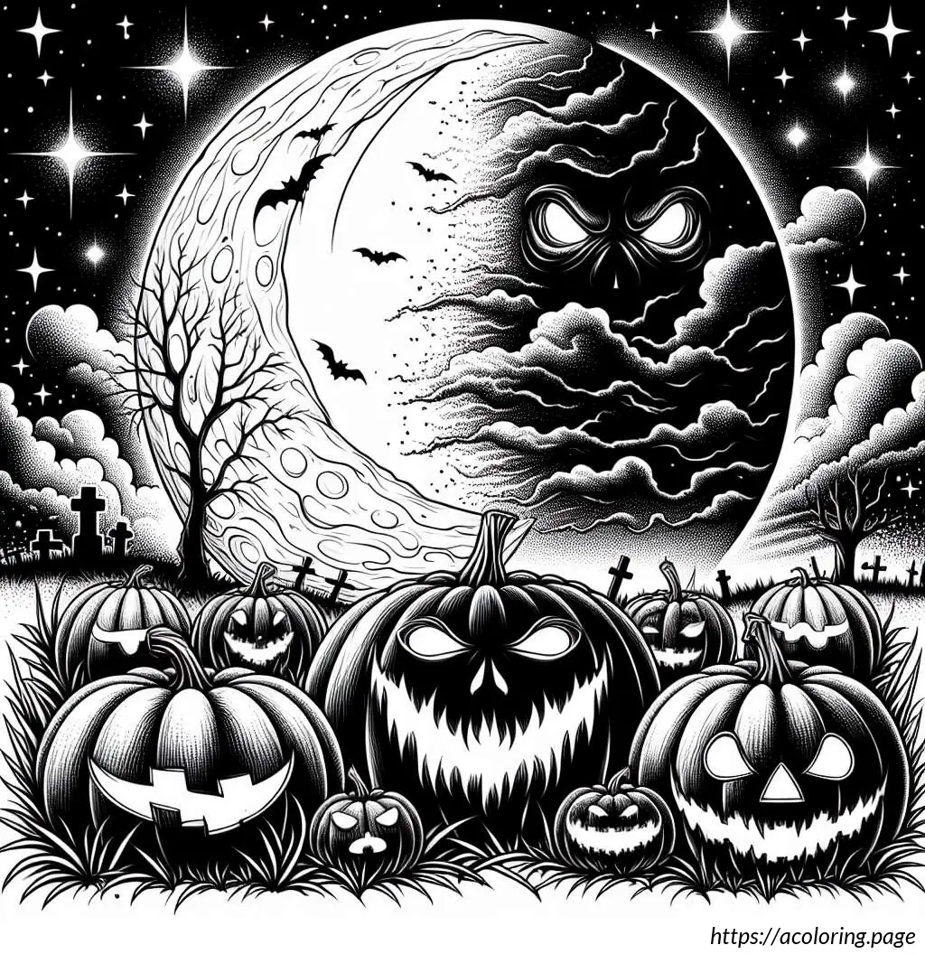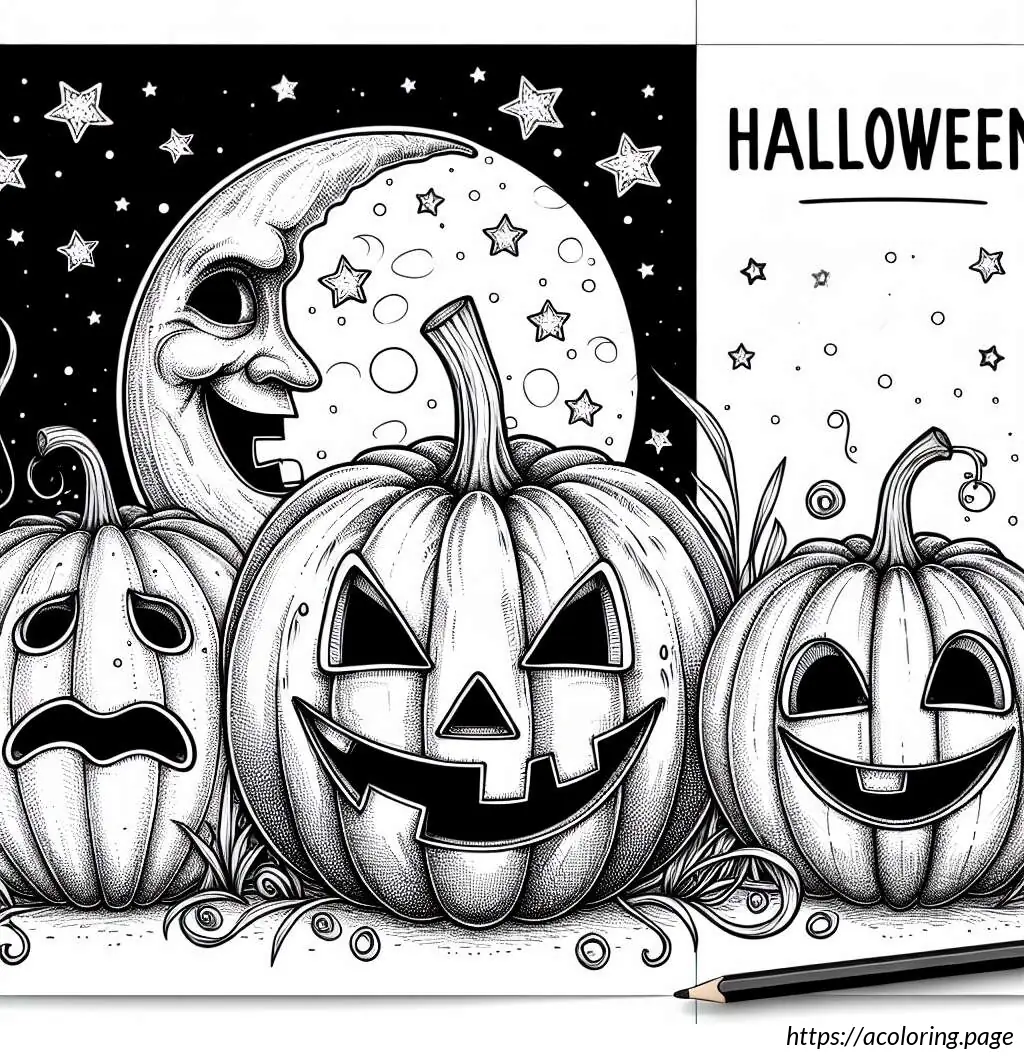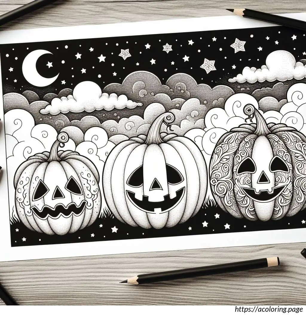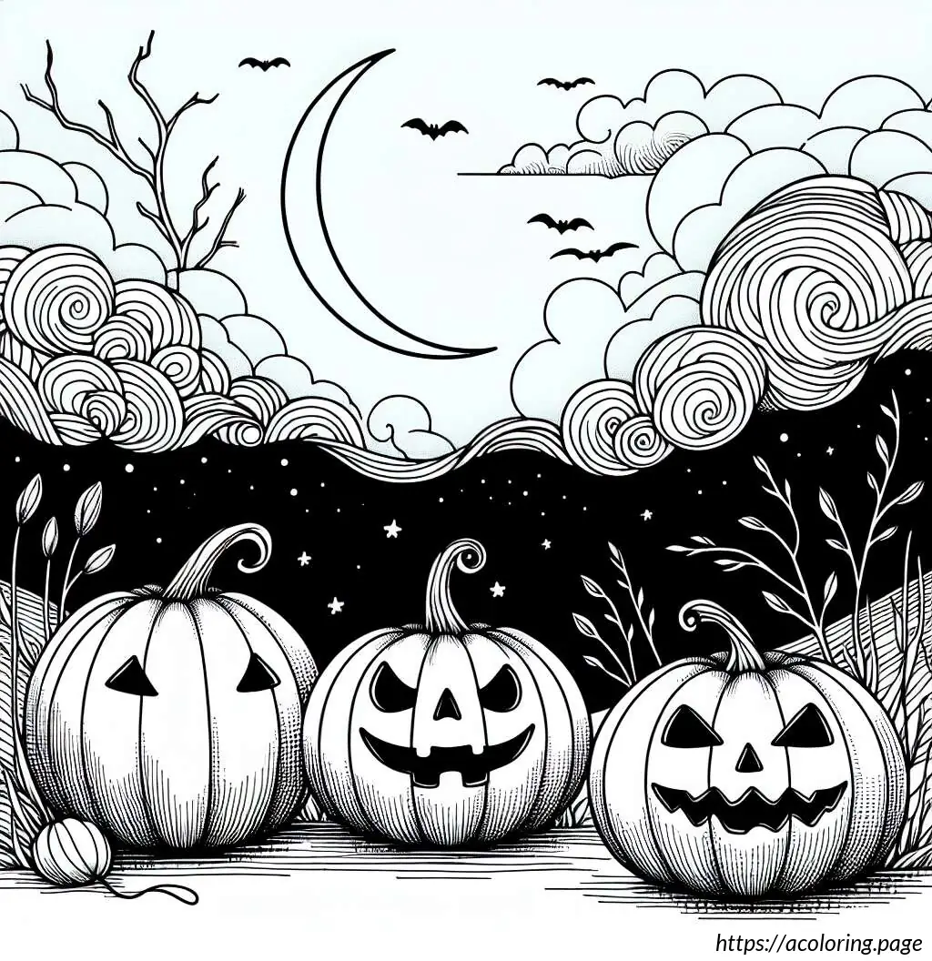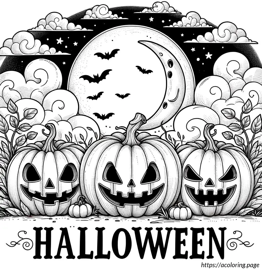 In the background, there are wispy clouds and a night sky adorned with two small stars and a crescent moon. The foreground beneath the pumpkins shows grassy details. The word “Halloween” is prominently displayed at the bottom center of the image in a playful, bold font. The overall composition of the image creates a fun, spooky scene typical of Halloween festivities.