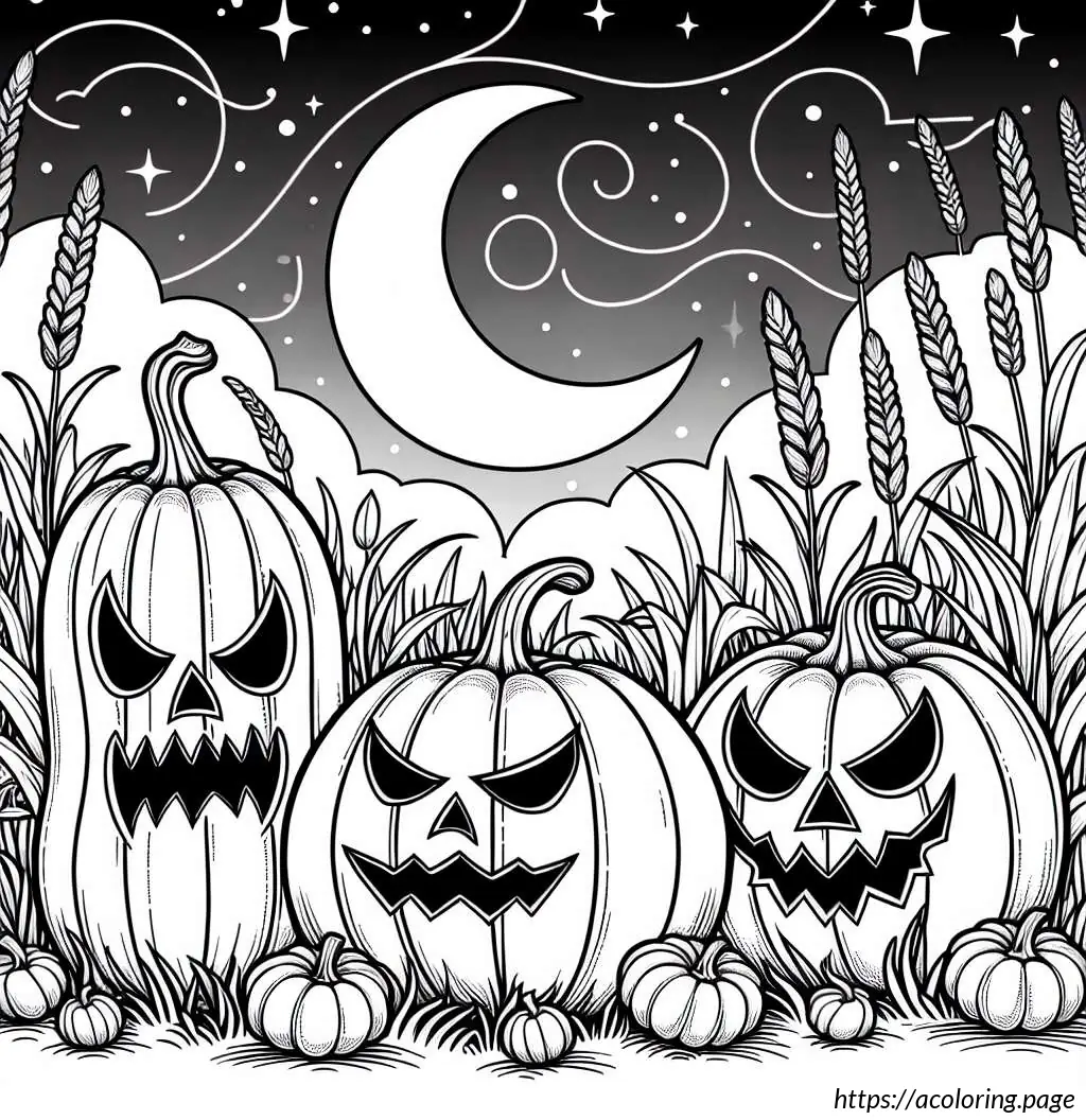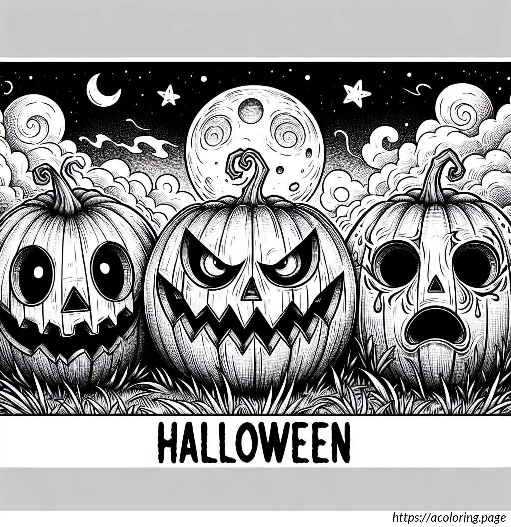 The image displays a Halloween-themed line drawing suitable for coloring. It features three jack-o’-lanterns (carved pumpkins) with distinct expressions placed side by side. The central pumpkin, positioned slightly forward compared to the others, has a malevolent grin with sharp, triangular eyes and a jagged mouth. The pumpkin to the left displays a more sinister smile with swirling carved eyes and a mouth opened wide. The pumpkin on the right shows a scared expression, with circular eyes and a mouth carved in a style that suggests shock or surprise.
