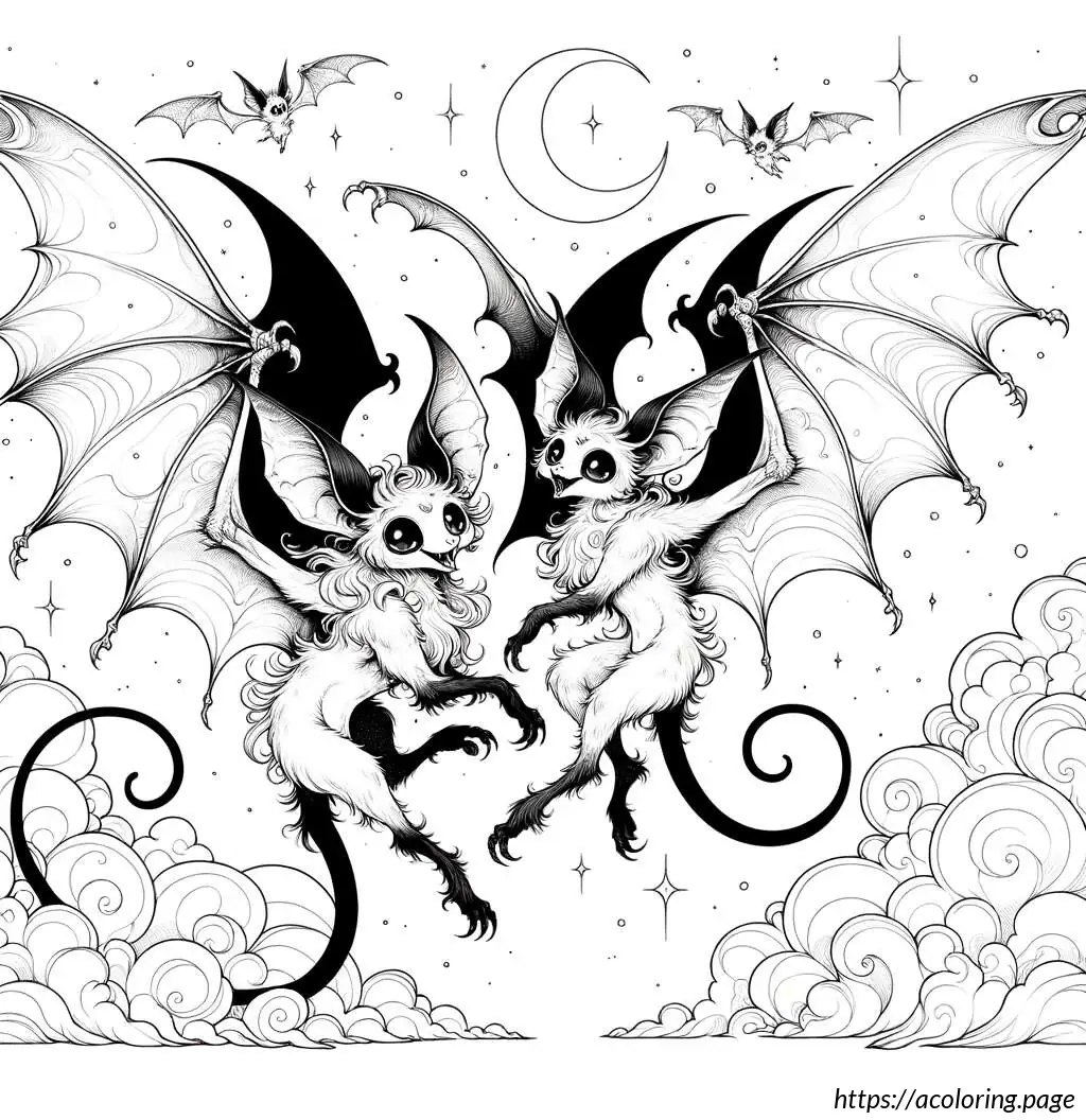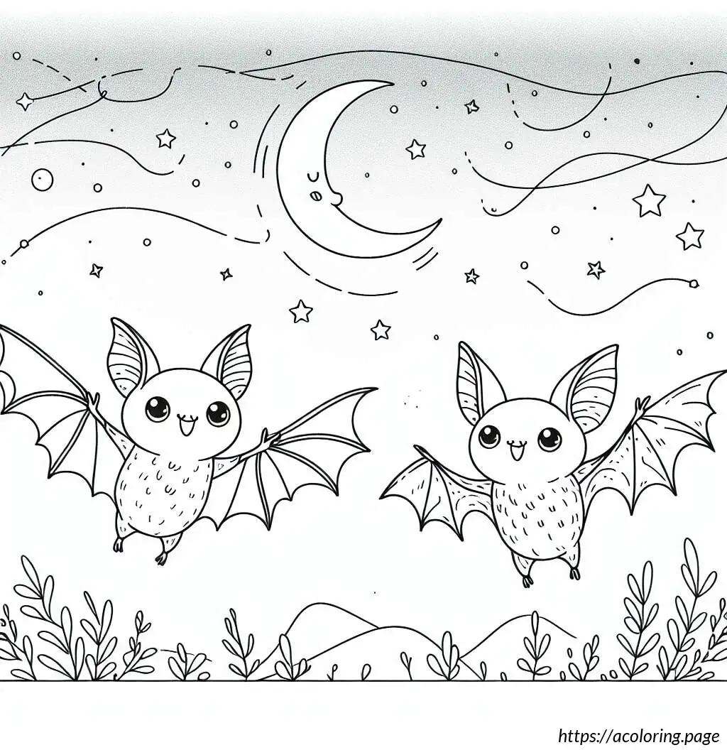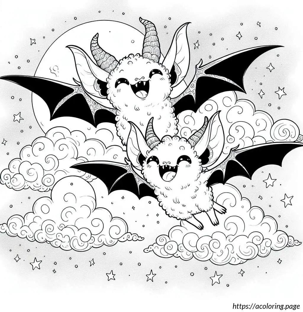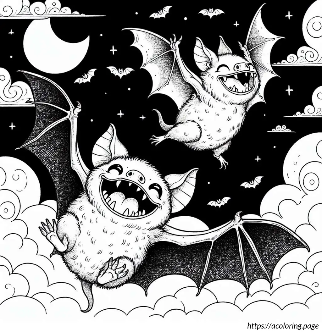 This image is a black and white line drawing featuring two whimsical bat characters. The bats appear cartoonish with exaggerated features, including large eyes, wide grinning mouths with fangs, and oversized ears. Both bats are depicted with their wings spread wide as if in mid-flight. The background includes stylized elements such as clouds and celestial icons, specifically stars and a crescent moon. This style of artwork is reminiscent of a children’s coloring book, focusing on fun and engaging characters that are likely intended to appear friendly and amusing rather than scary.
