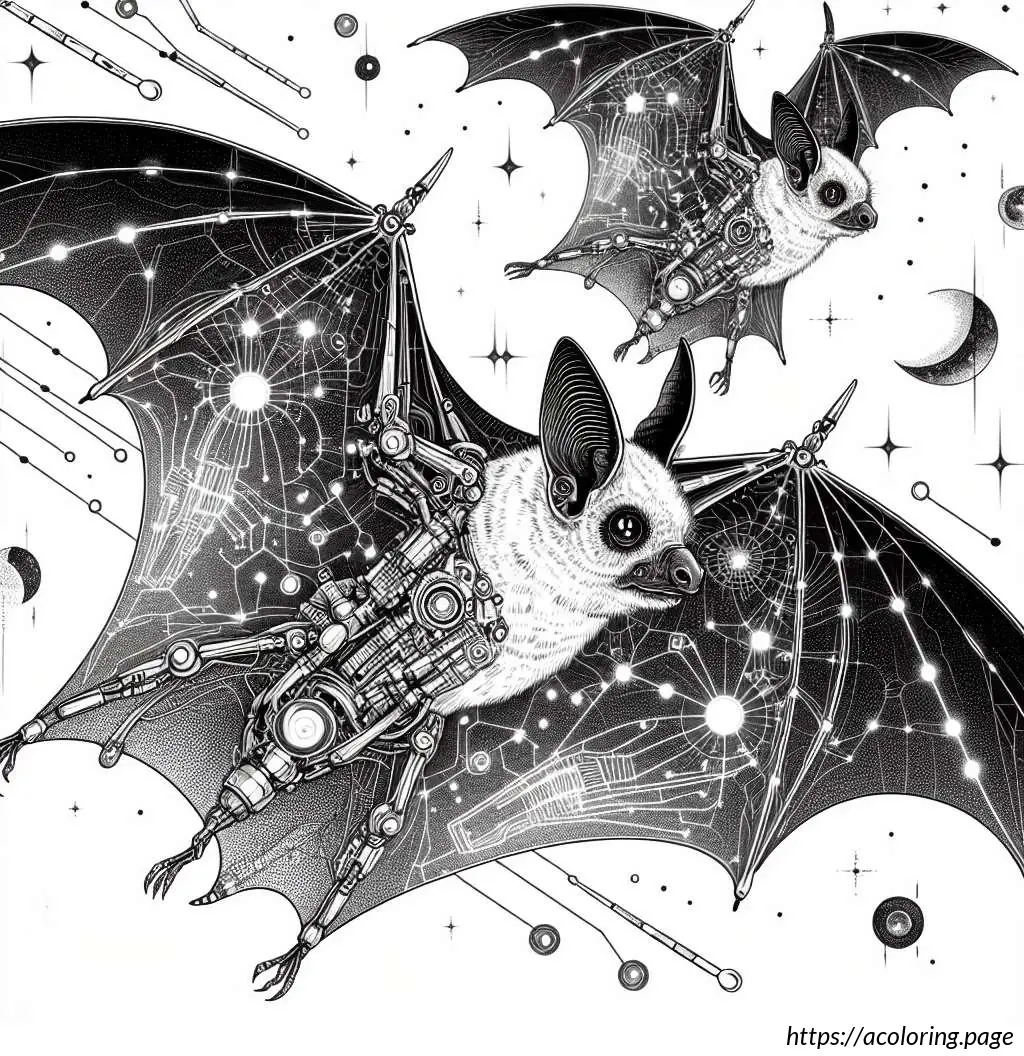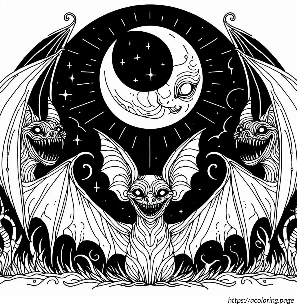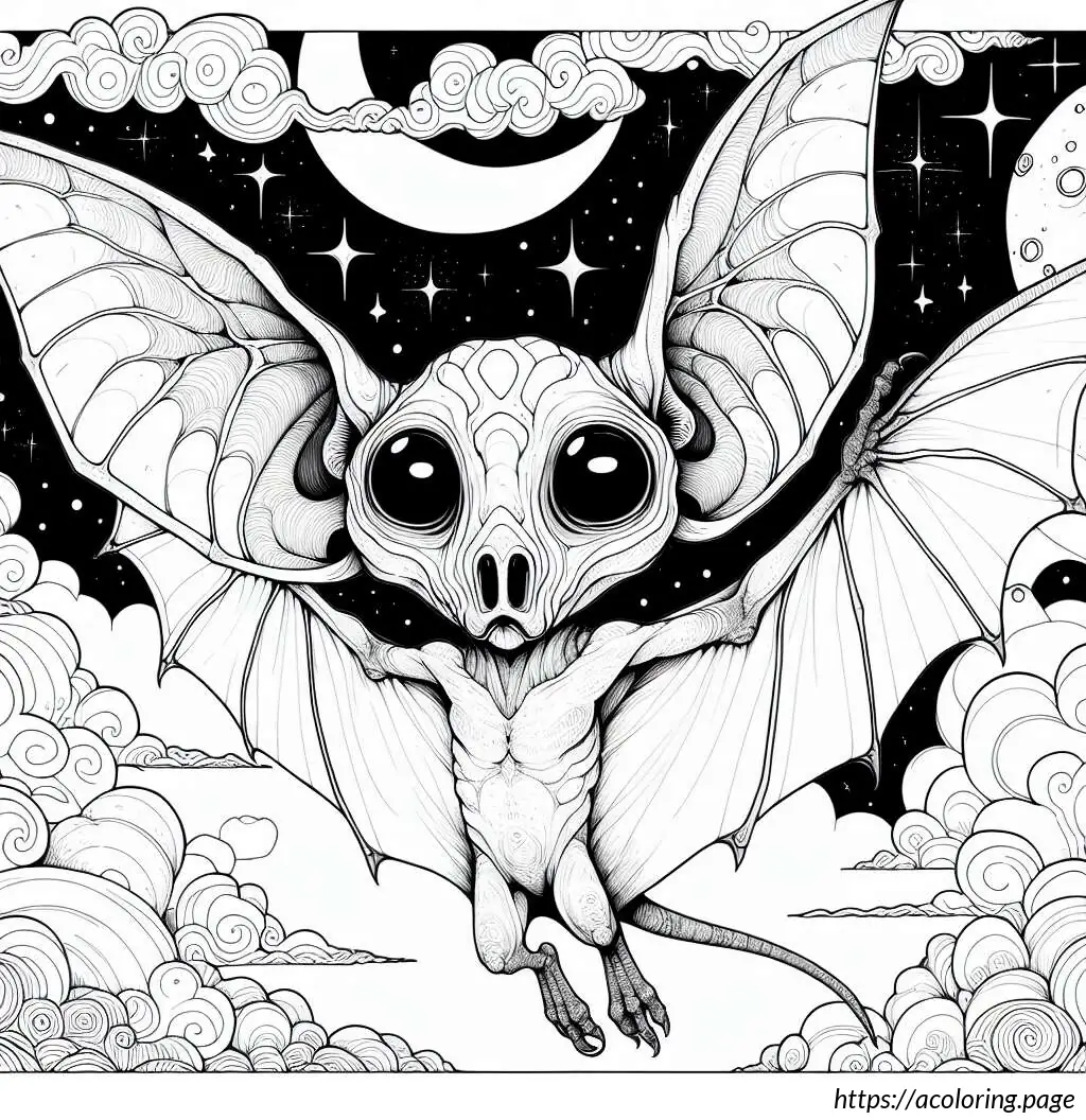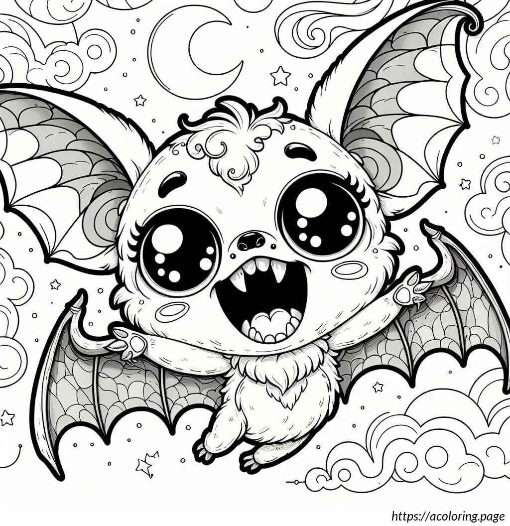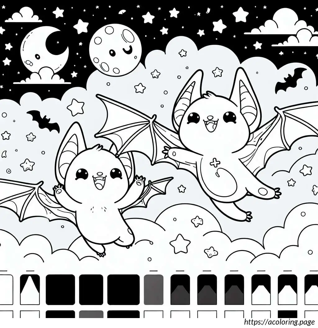 This image is a black and white line drawing featuring two whimsical bat characters. The bats appear cartoonish with exaggerated features, including large eyes, wide grinning mouths with fangs, and oversized ears. Both bats are depicted with their wings spread wide as if in mid-flight. The background includes stylized elements such as clouds and celestial icons, specifically stars and a crescent moon. This style of artwork is reminiscent of a children’s coloring book, focusing on fun and engaging characters that are likely intended to appear friendly and amusing rather than scary.
