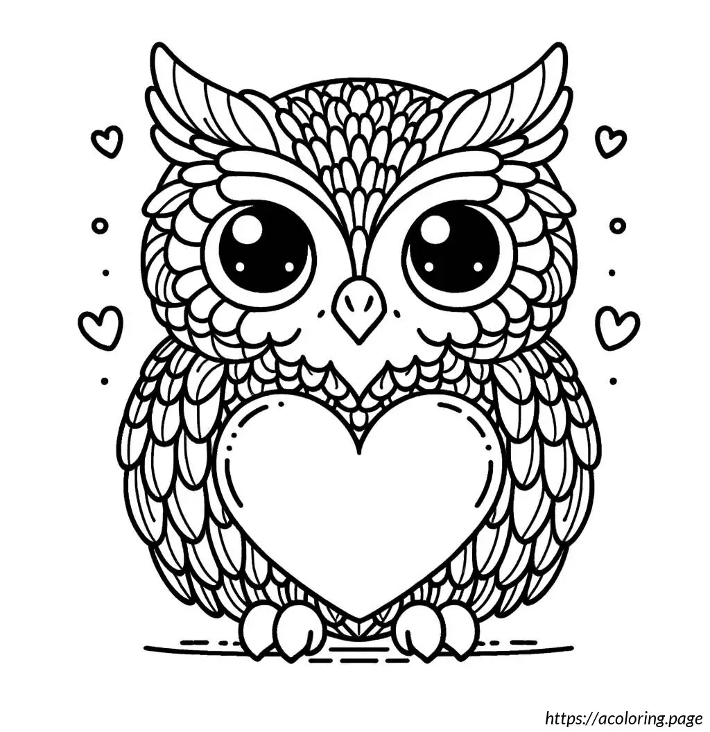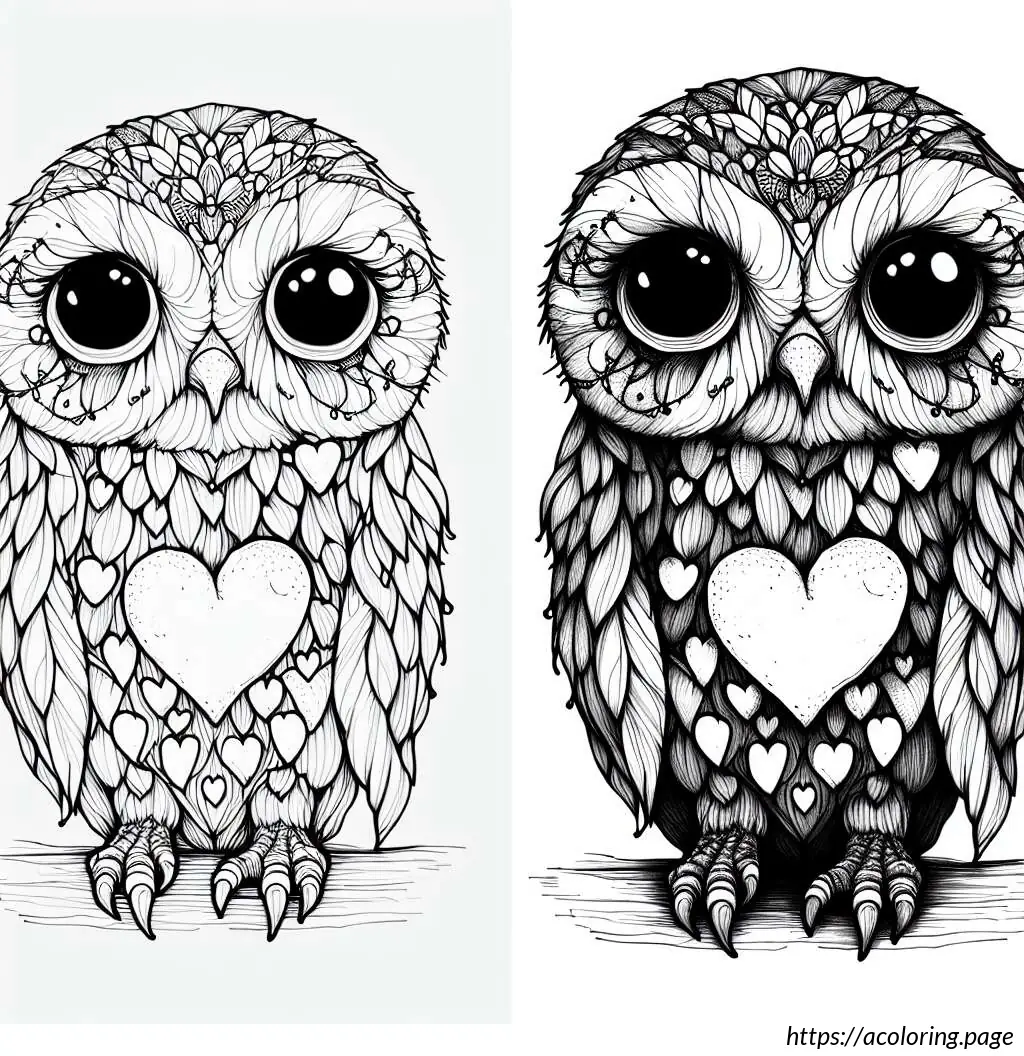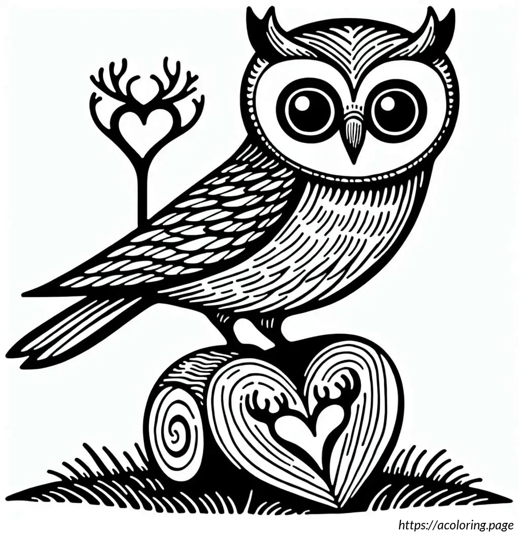 The image features a simple, cartoon-style drawing of an owl perched on a large heart. The owl appears cute and stylized, characterized by large round eyes that dominate its face, small feather details on its body, and little claws gripping the edges of the heart. The heart itself is robust and symmetrical, providing a solid base for the owl. The owl’s expression seems curious or contemplative, contributing to its charming appearance. The entire drawing is outlined in black, with no color fill, giving it a clear and clean look suitable for coloring or use as a simple graphic.