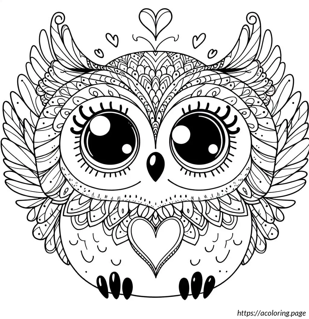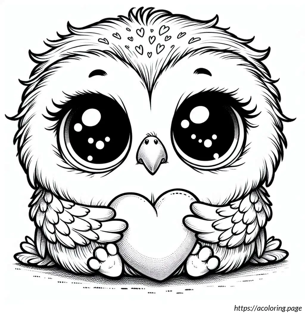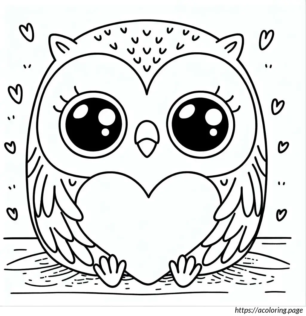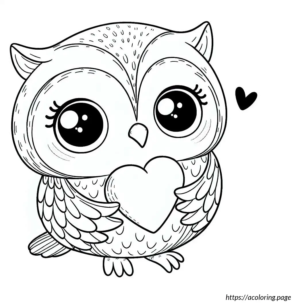The image features a simple, cartoon-style drawing of an owl perched on a large heart. The owl appears cute and stylized, characterized by large round eyes that dominate its face, small feather details on its body, and little claws gripping the edges of the heart. The heart itself is robust and symmetrical, providing a solid base for the owl. The owl’s expression seems curious or contemplative, contributing to its charming appearance. The entire drawing is outlined in black, with no color fill, giving it a clear and clean look suitable for coloring or use as a simple graphic.