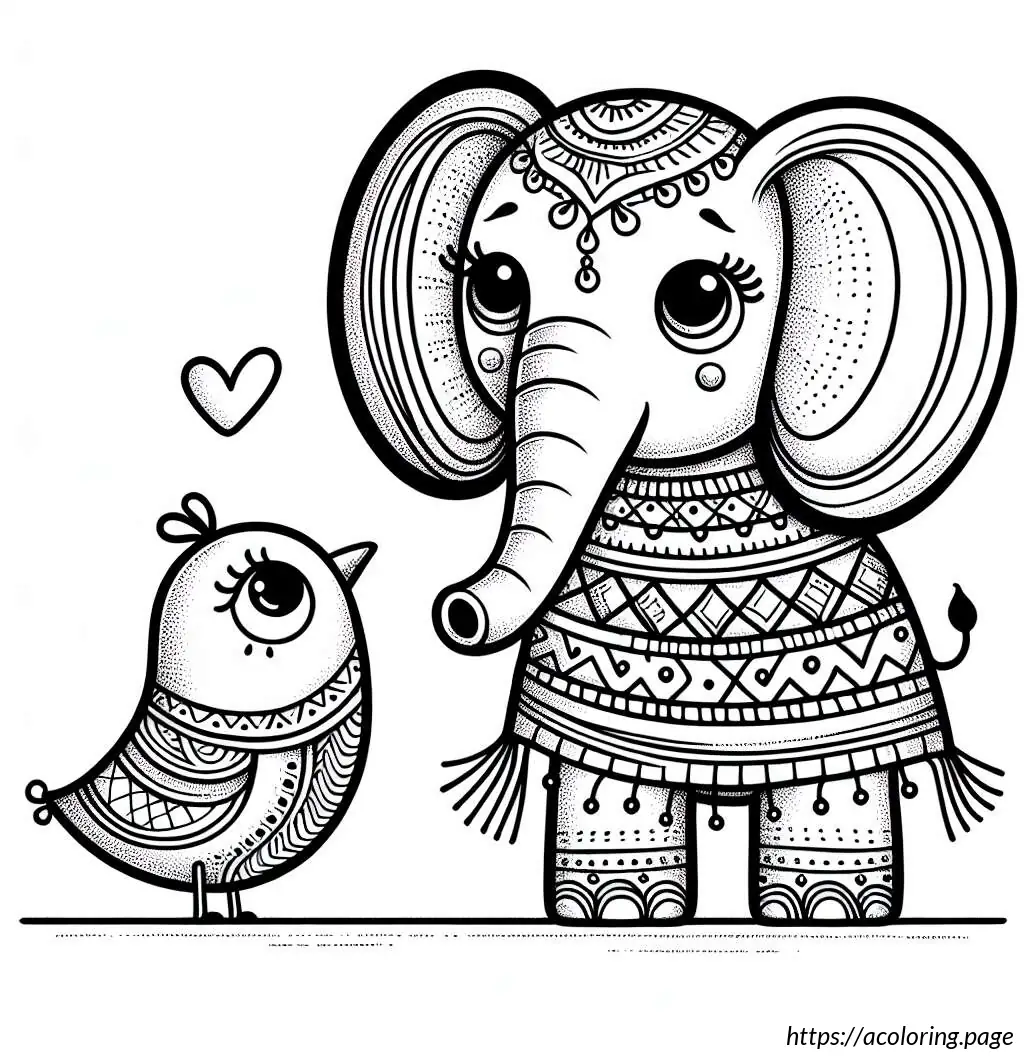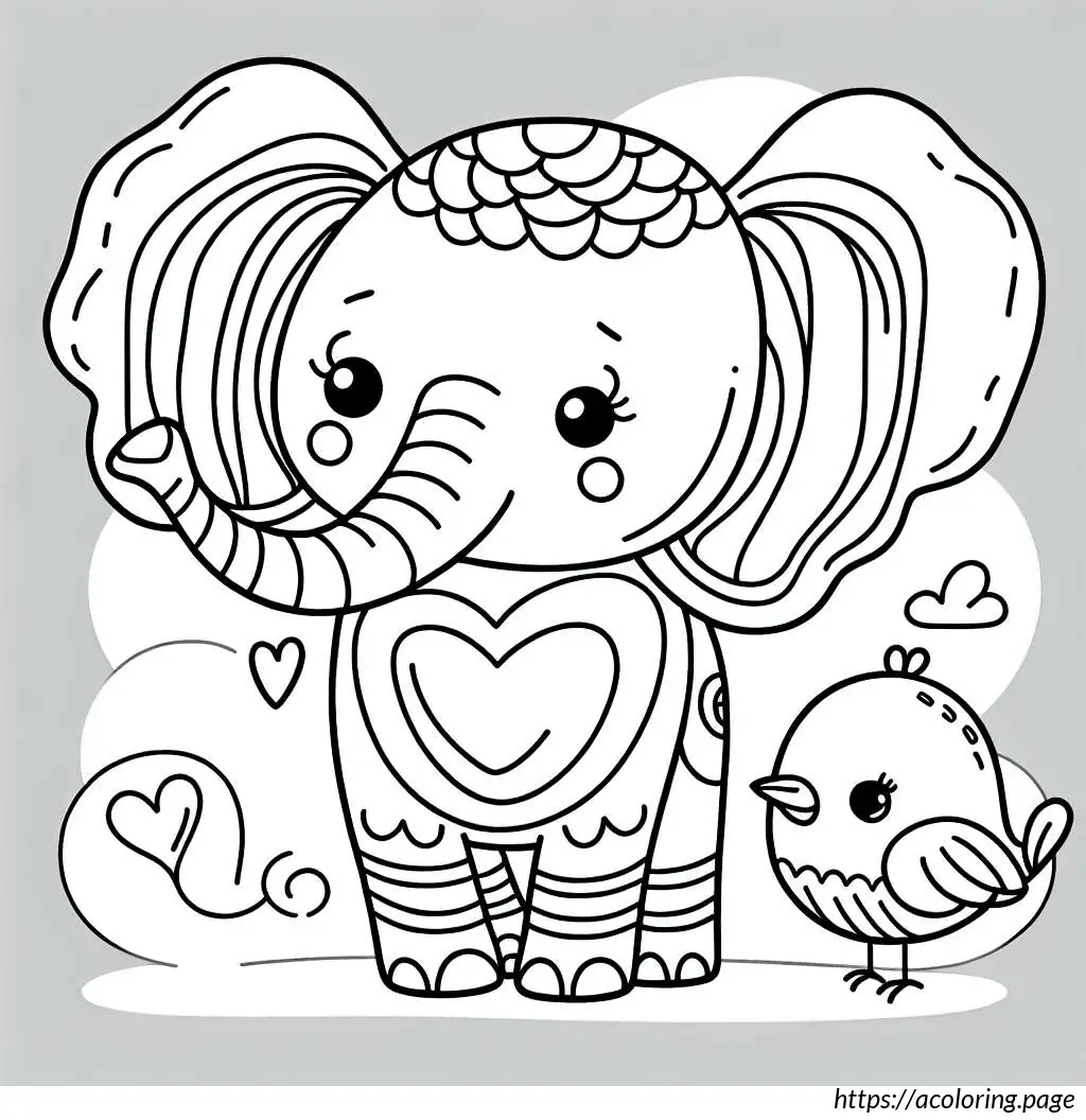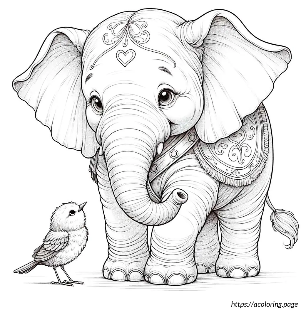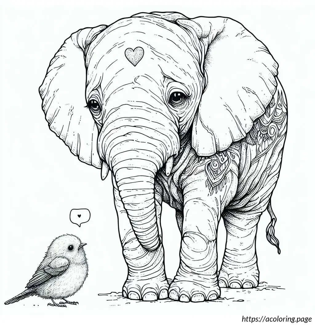 This image features a simple black and white line drawing of an elephant and a small bird. The elephant, drawn in a cartoonish style, is facing the left with large expressive eyes and a friendly smile. It has a blanket on its back, adorned with a heart design in the center. The bird is on the ground to the left of the elephant’s front foot, looking up at the elephant. The bird also has a simplistic, cartoon-like appearance with one visible eye and a rounded body. The overall style of the drawing is playful and suitable for children.