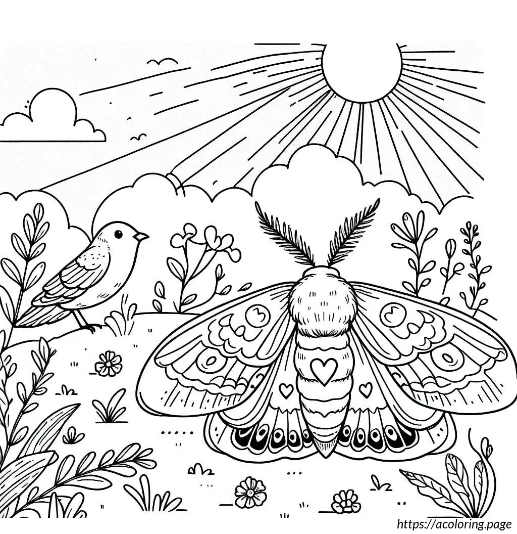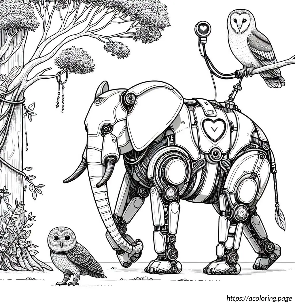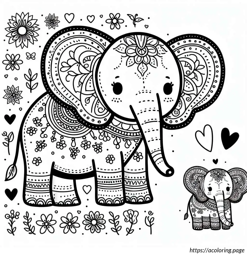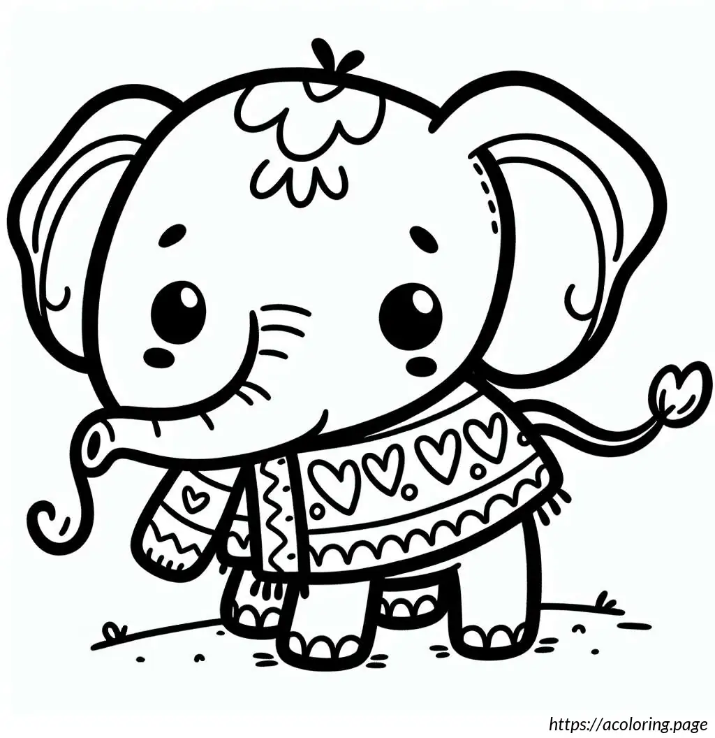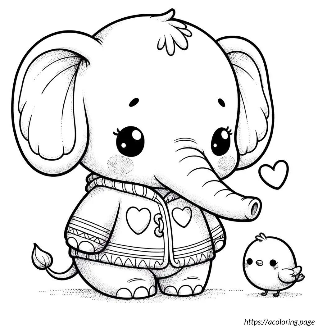This image features a simple black and white line drawing of an elephant and a small bird. The elephant, drawn in a cartoonish style, is facing the left with large expressive eyes and a friendly smile. It has a blanket on its back, adorned with a heart design in the center. The bird is on the ground to the left of the elephant’s front foot, looking up at the elephant. The bird also has a simplistic, cartoon-like appearance with one visible eye and a rounded body. The overall style of the drawing is playful and suitable for children.
