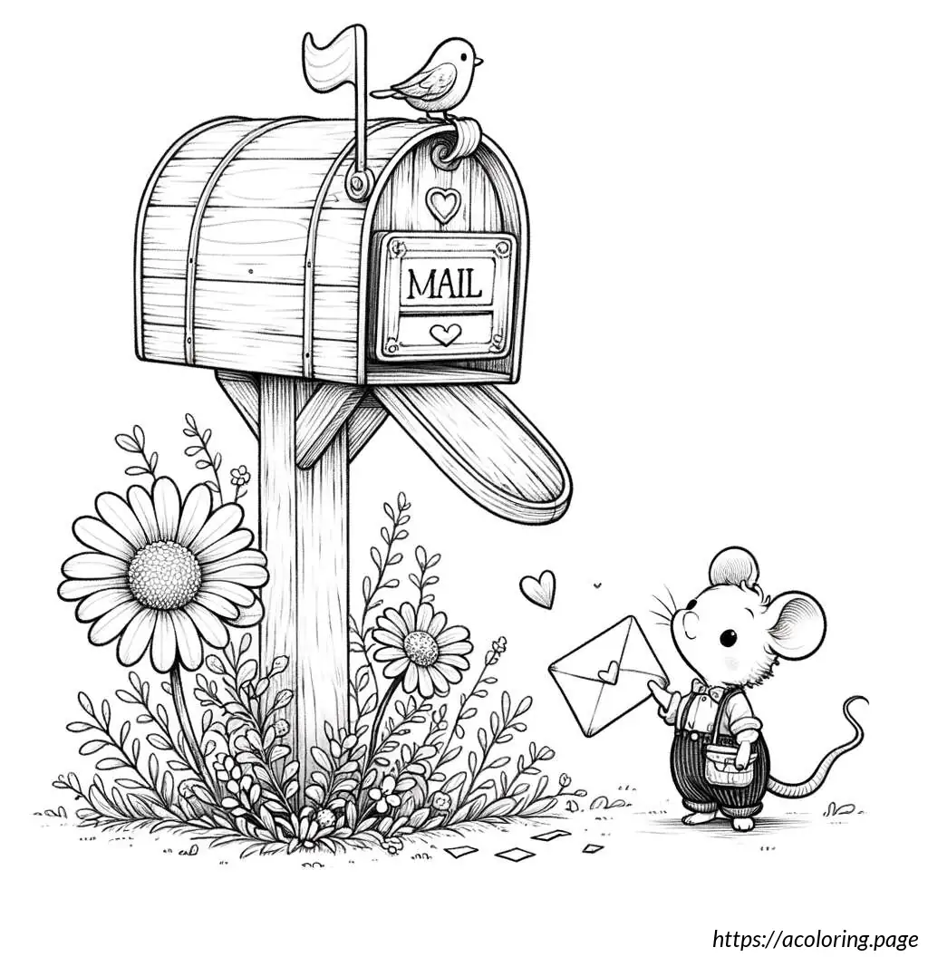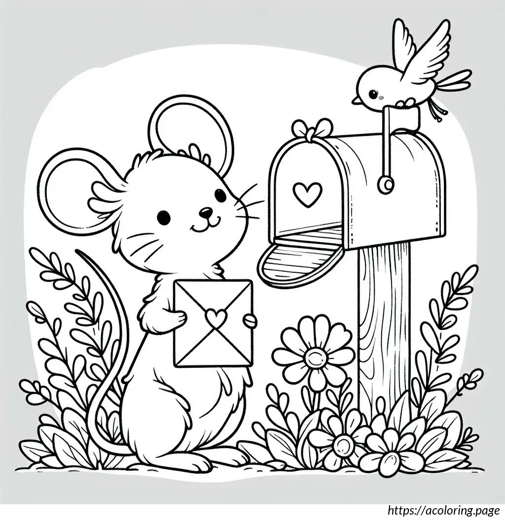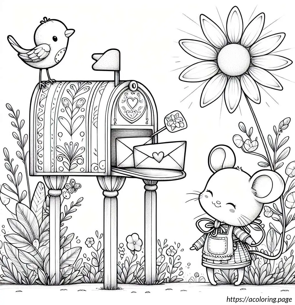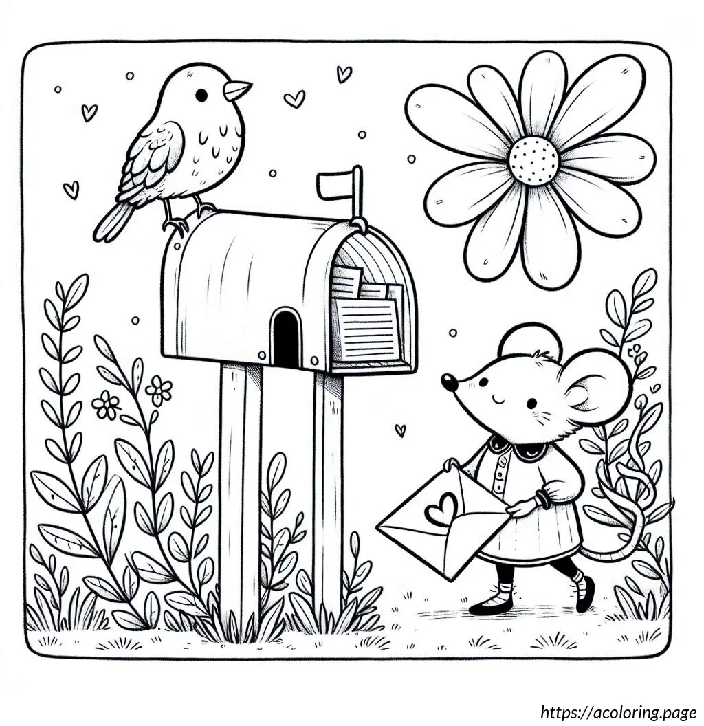 This image depicts a whimsical cartoon scene featuring a mouse and a bird. The bird is sitting atop a mailbox that has a letter poking out from its mail slot. Next to the mailbox is a simple flower with five petals and a dotted center. To the right, a mouse, dressed in a shirtdress with a rounded collar, is walking on its hind legs and lovingly holding an envelope with a heart shape on it, suggesting that it might contain a love letter or valentine. The overall scene is drawn in a simple, outline style without any shading or colors, giving it a light and cheerful feel. The background is plain, emphasizing the characters and the mailbox.