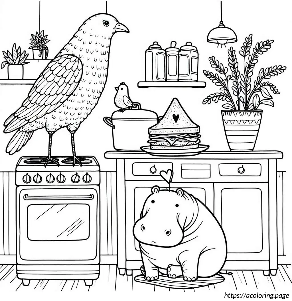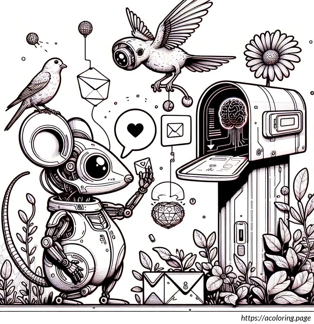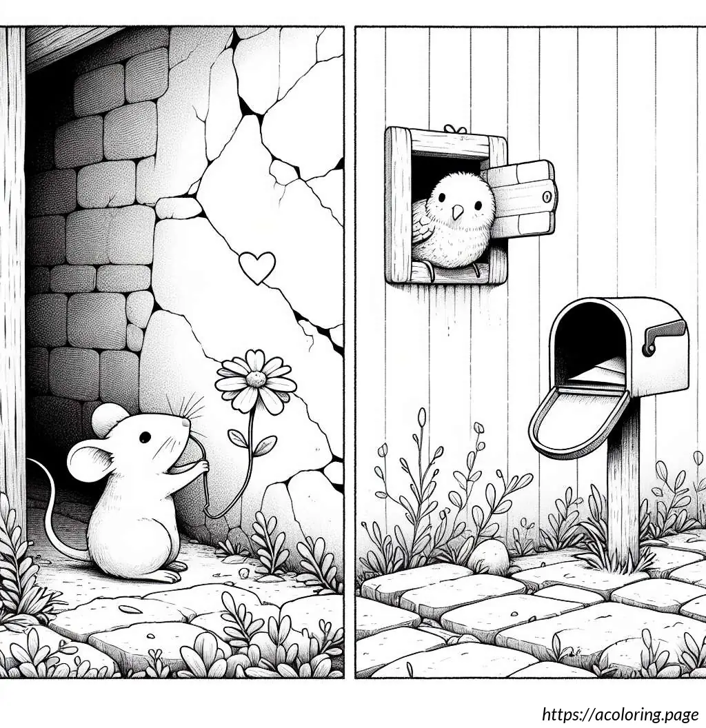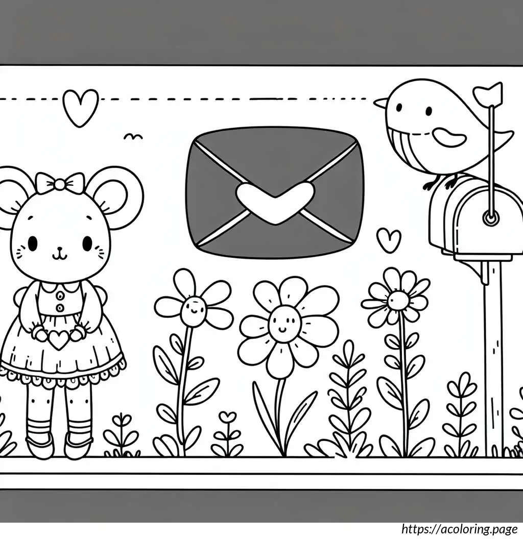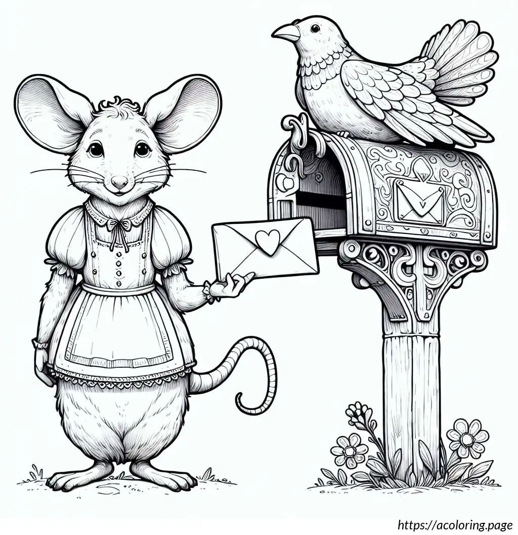 This image depicts a whimsical cartoon scene featuring a mouse and a bird. The bird is sitting atop a mailbox that has a letter poking out from its mail slot. Next to the mailbox is a simple flower with five petals and a dotted center. To the right, a mouse, dressed in a shirtdress with a rounded collar, is walking on its hind legs and lovingly holding an envelope with a heart shape on it, suggesting that it might contain a love letter or valentine. The overall scene is drawn in a simple, outline style without any shading or colors, giving it a light and cheerful feel. The background is plain, emphasizing the characters and the mailbox.