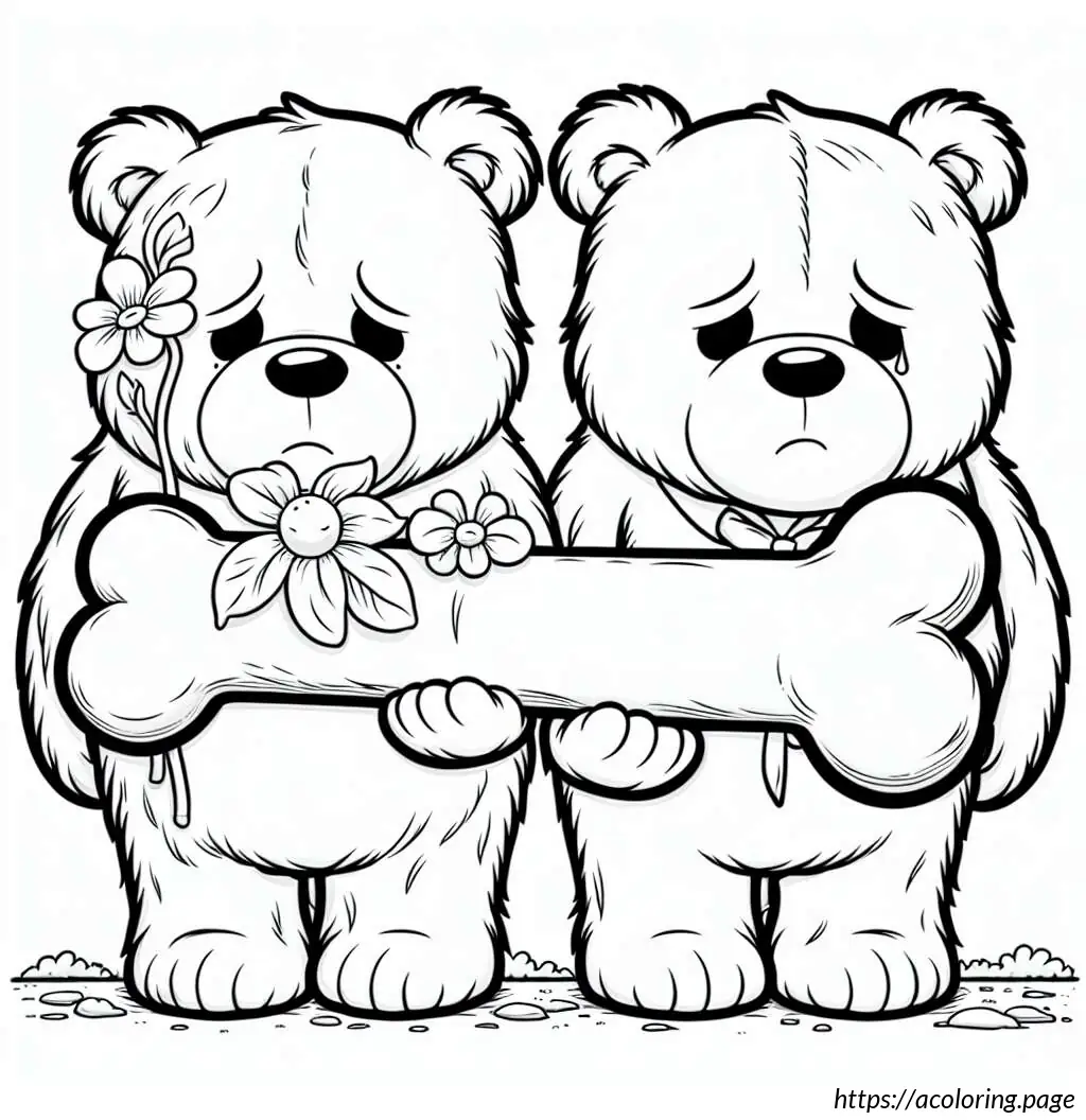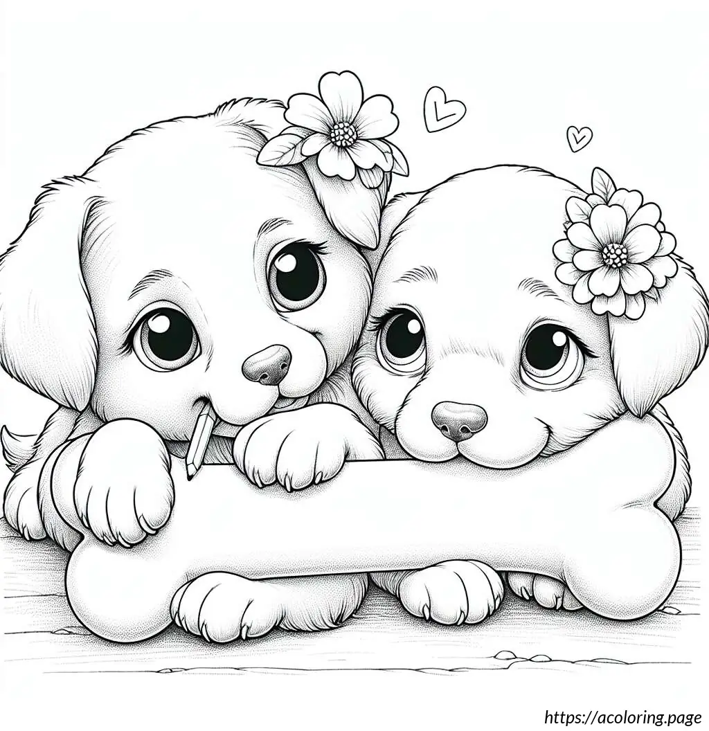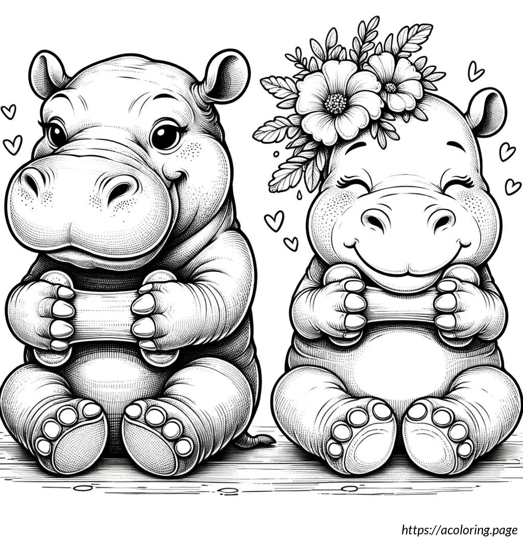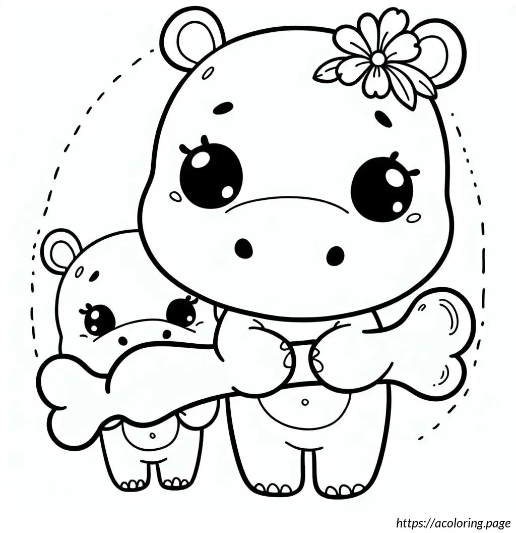 The image shows two cartoon style hippos, one on the left and one on the right, holding a large bone between them. Both hippos are depicted in a simple, black and white line drawing suitable for coloring. The hippo on the left has small ears and eyes, giving it a curious and surprised expression, while the hippo on the right has similar facial features but includes a flower on its right ear, suggesting it might be female. The illustration seems playful and intended for children, likely as part of a coloring book or educational activity.
