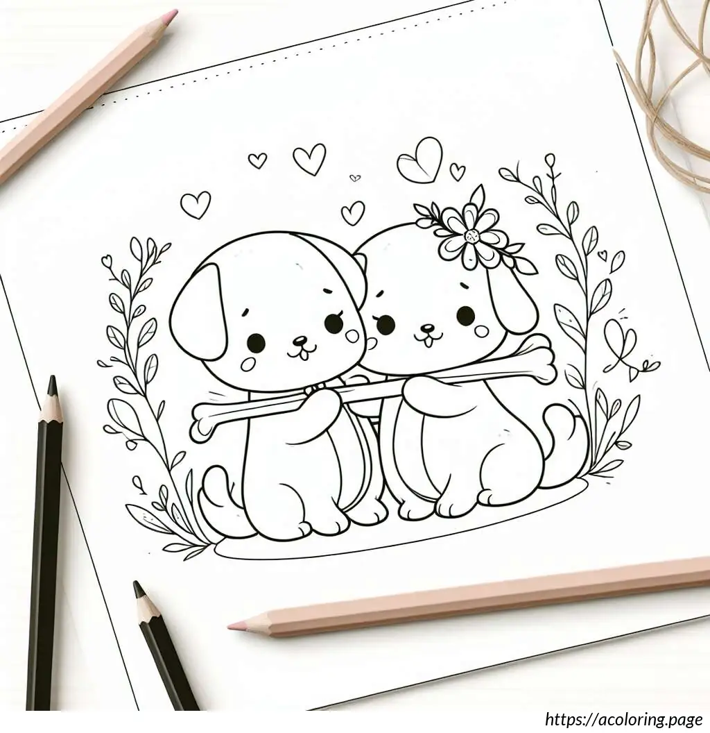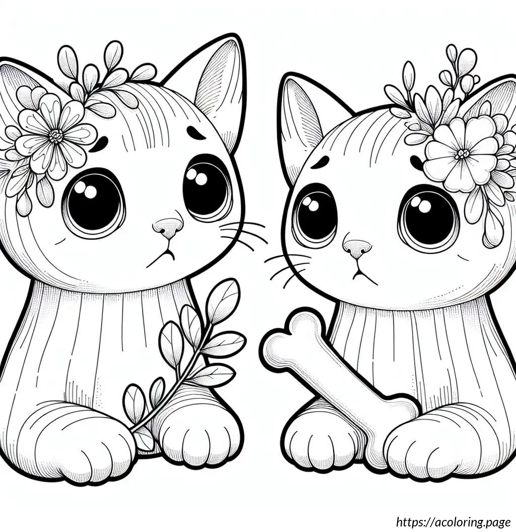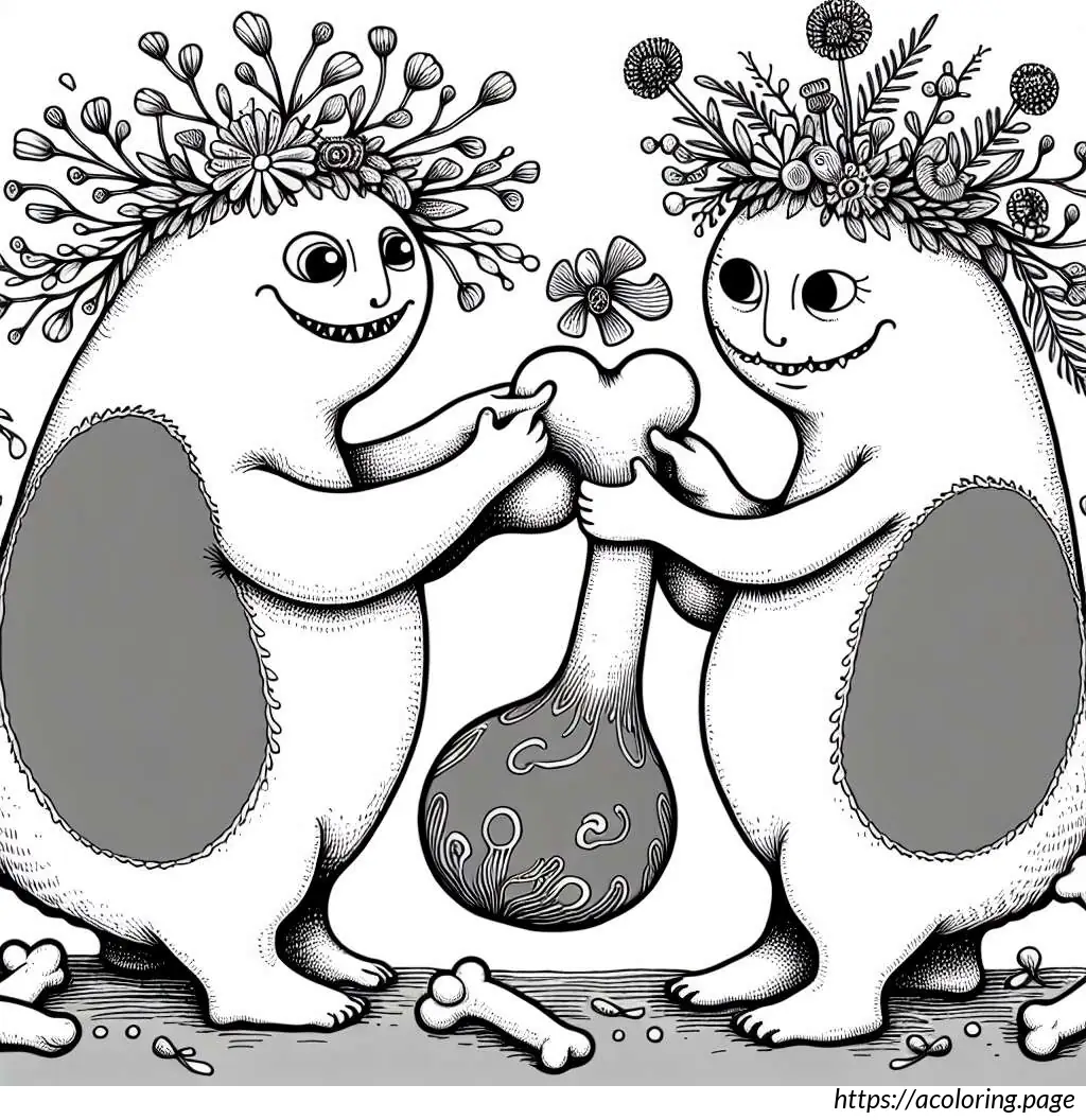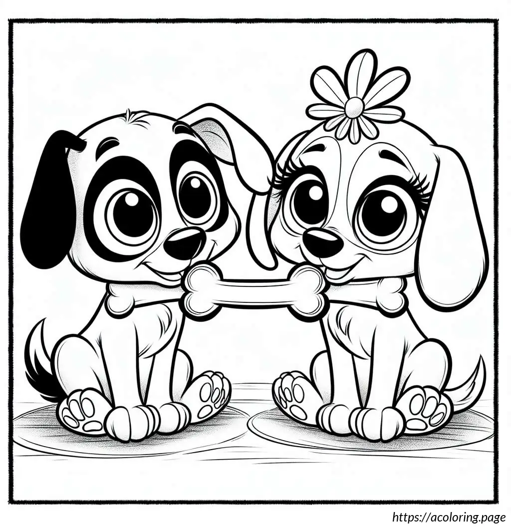 The image shows two cartoon style hippos, one on the left and one on the right, holding a large bone between them. Both hippos are depicted in a simple, black and white line drawing suitable for coloring. The hippo on the left has small ears and eyes, giving it a curious and surprised expression, while the hippo on the right has similar facial features but includes a flower on its right ear, suggesting it might be female. The illustration seems playful and intended for children, likely as part of a coloring book or educational activity.