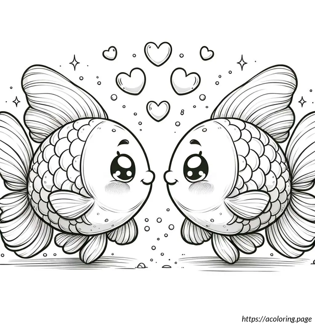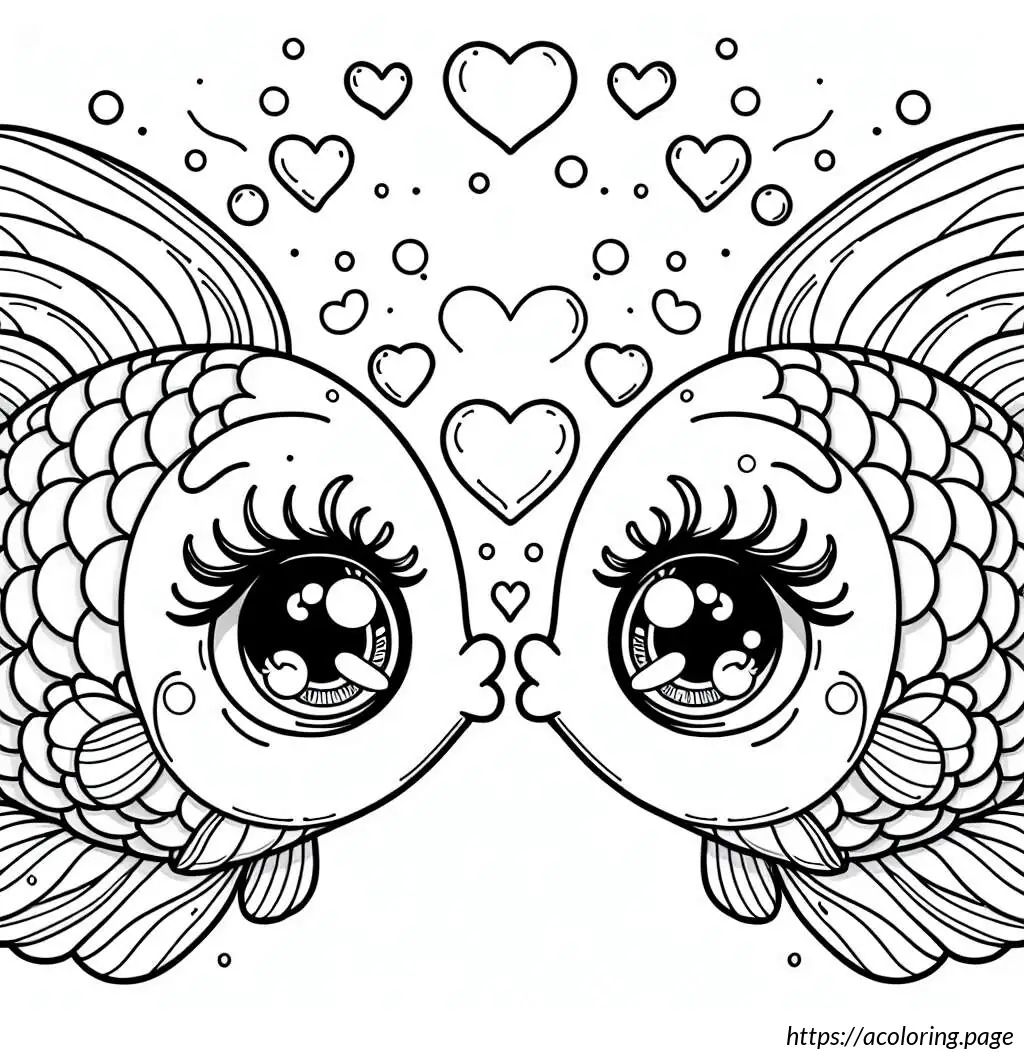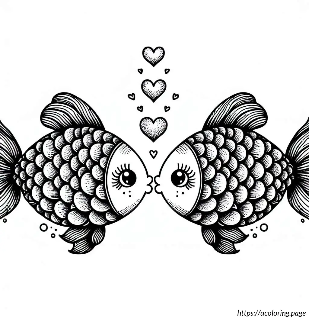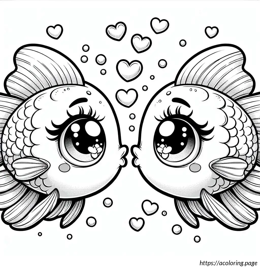 This image is an adorable black and white line drawing of two cartoon-style fish facing each other. They appear to be kissing or very close to kissing, with small hearts floating above their heads, indicating an affectionate or romantic interaction. Both fish have large, expressive eyes, each uniquely stylized with lashes on one fish, suggesting a feminine characteristic, while the other has simpler eyes, possibly suggesting a masculine characteristic. The bodies of the fish are rounded, each covered with neatly arranged scales and their tail fins and dorsal fins are clearly defined with simple lines. The simplicity of the drawing and the use of hearts suggest that the image might be designed for children or as a cute representation of love or friendship suitable for various age groups.