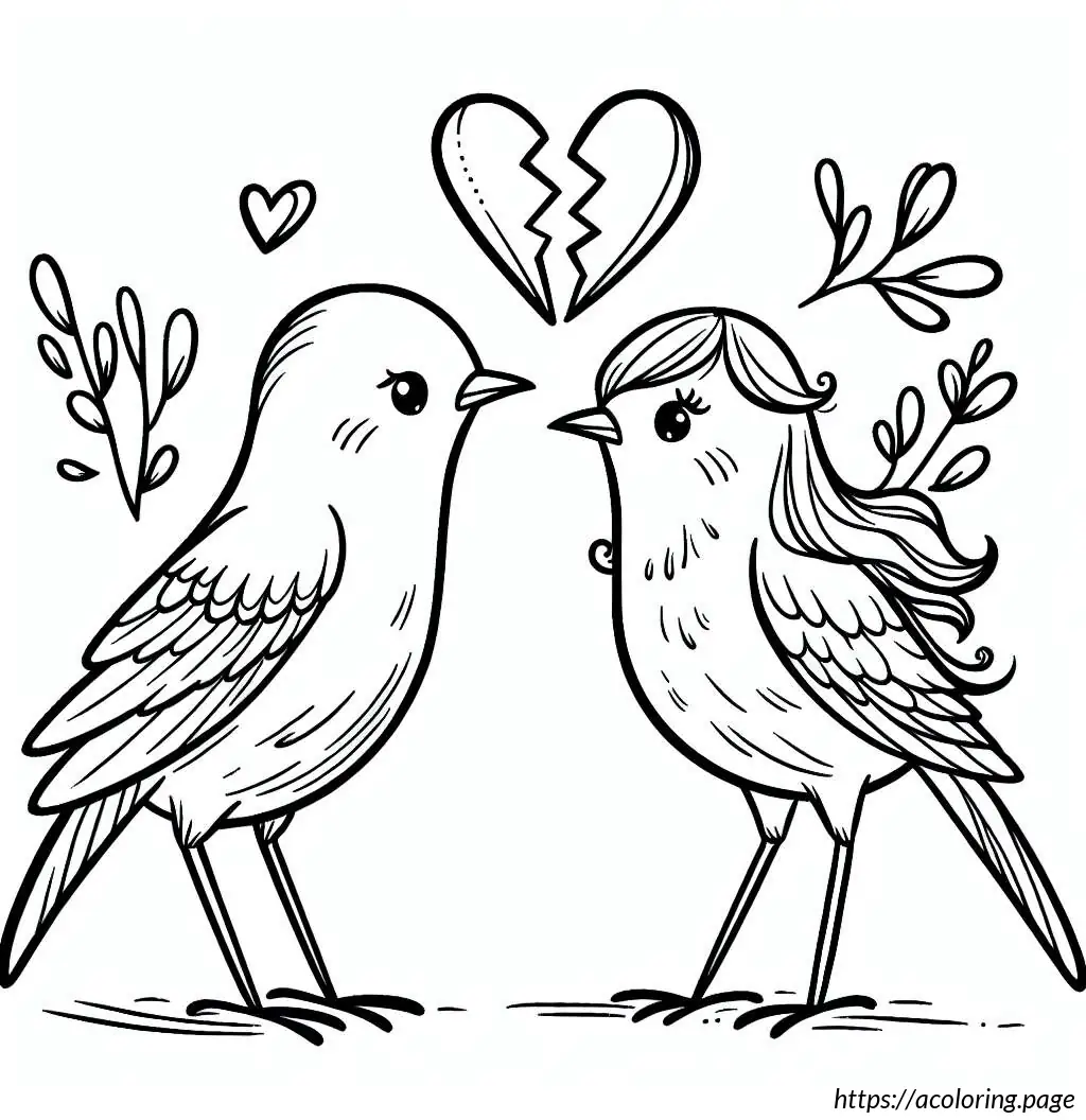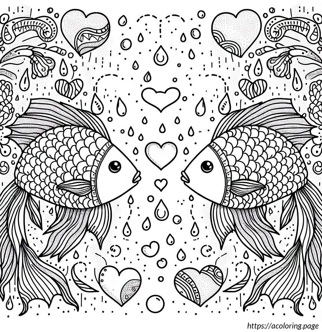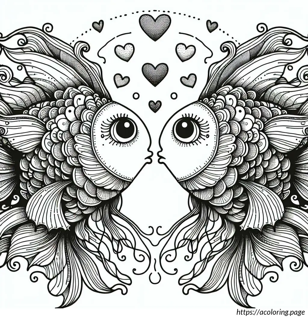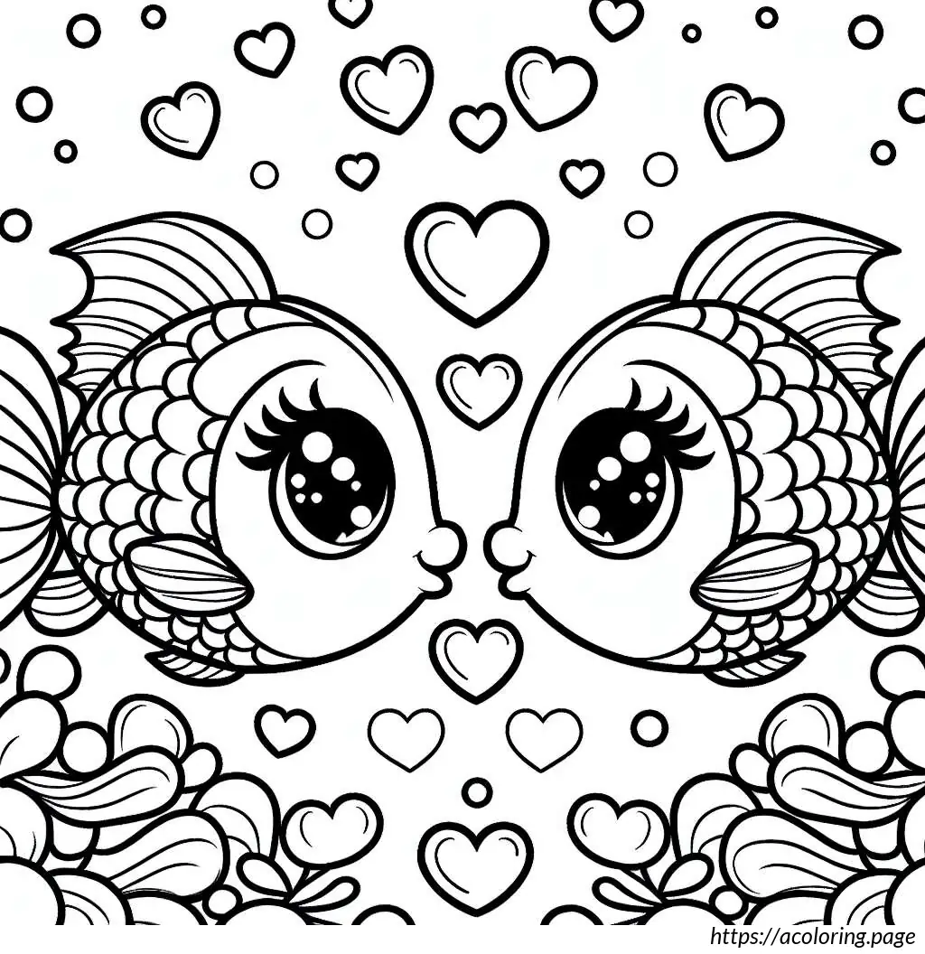 This image is an adorable black and white line drawing of two cartoon-style fish facing each other. They appear to be kissing or very close to kissing, with small hearts floating above their heads, indicating an affectionate or romantic interaction. Both fish have large, expressive eyes, each uniquely stylized with lashes on one fish, suggesting a feminine characteristic, while the other has simpler eyes, possibly suggesting a masculine characteristic. The bodies of the fish are rounded, each covered with neatly arranged scales and their tail fins and dorsal fins are clearly defined with simple lines. The simplicity of the drawing and the use of hearts suggest that the image might be designed for children or as a cute representation of love or friendship suitable for various age groups.