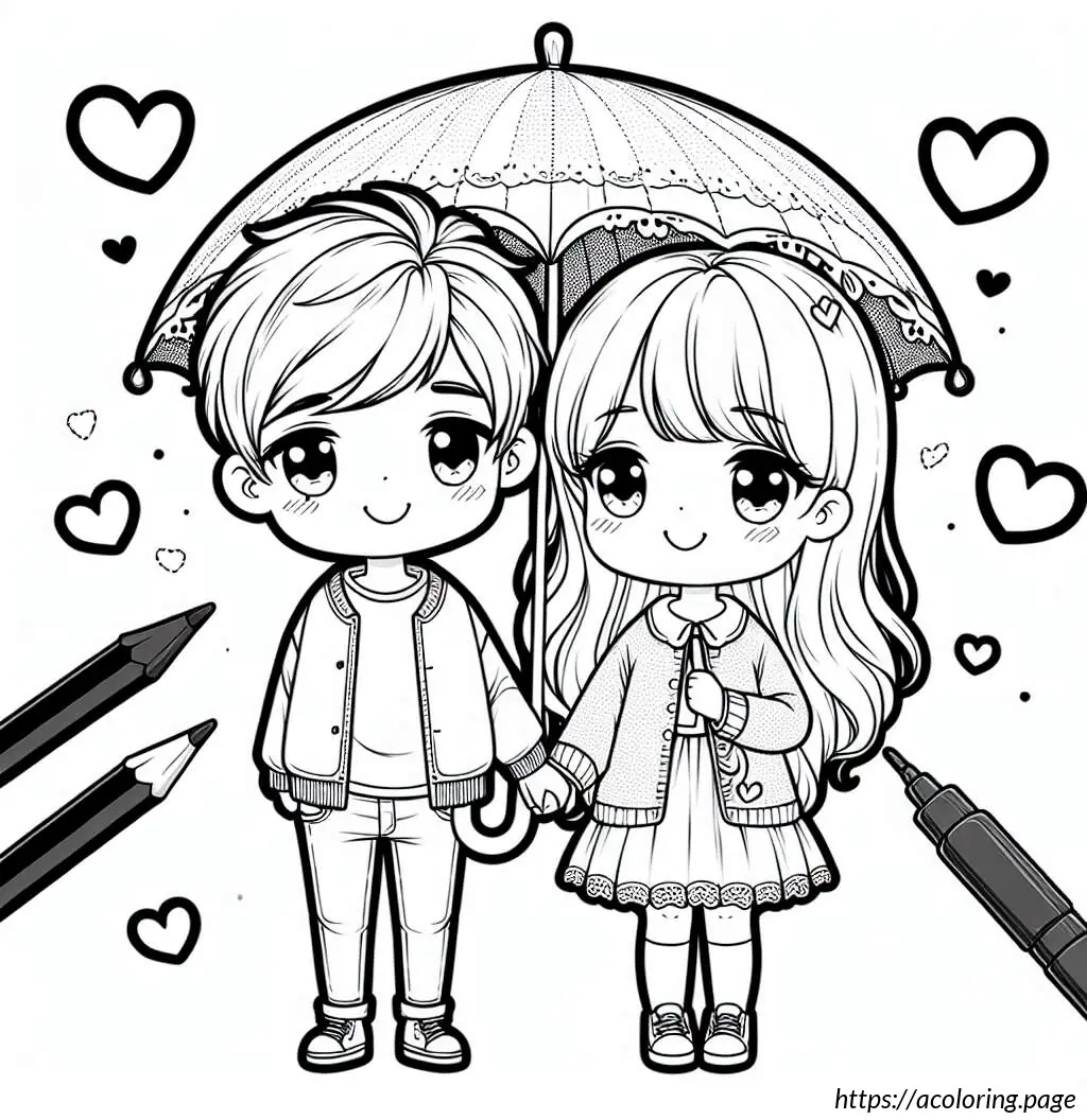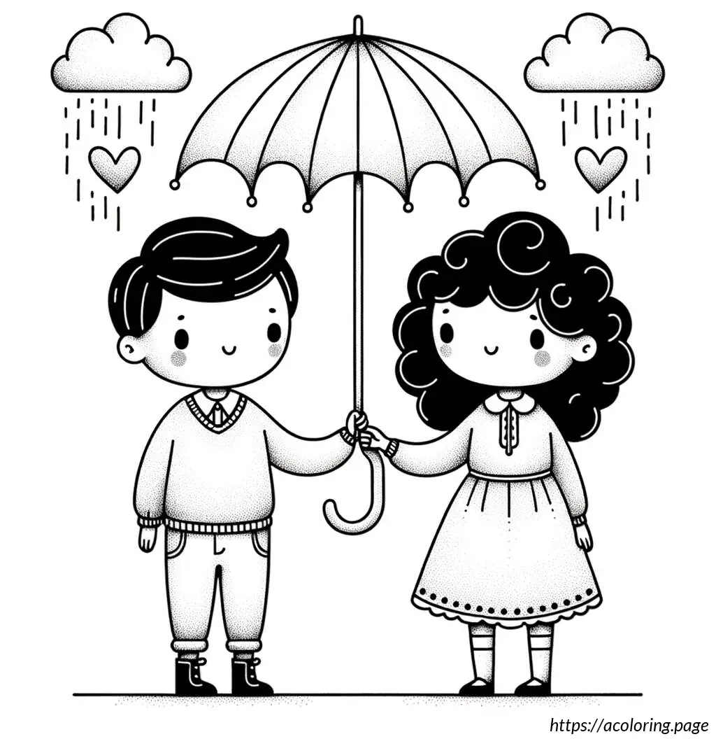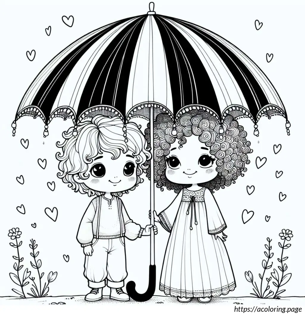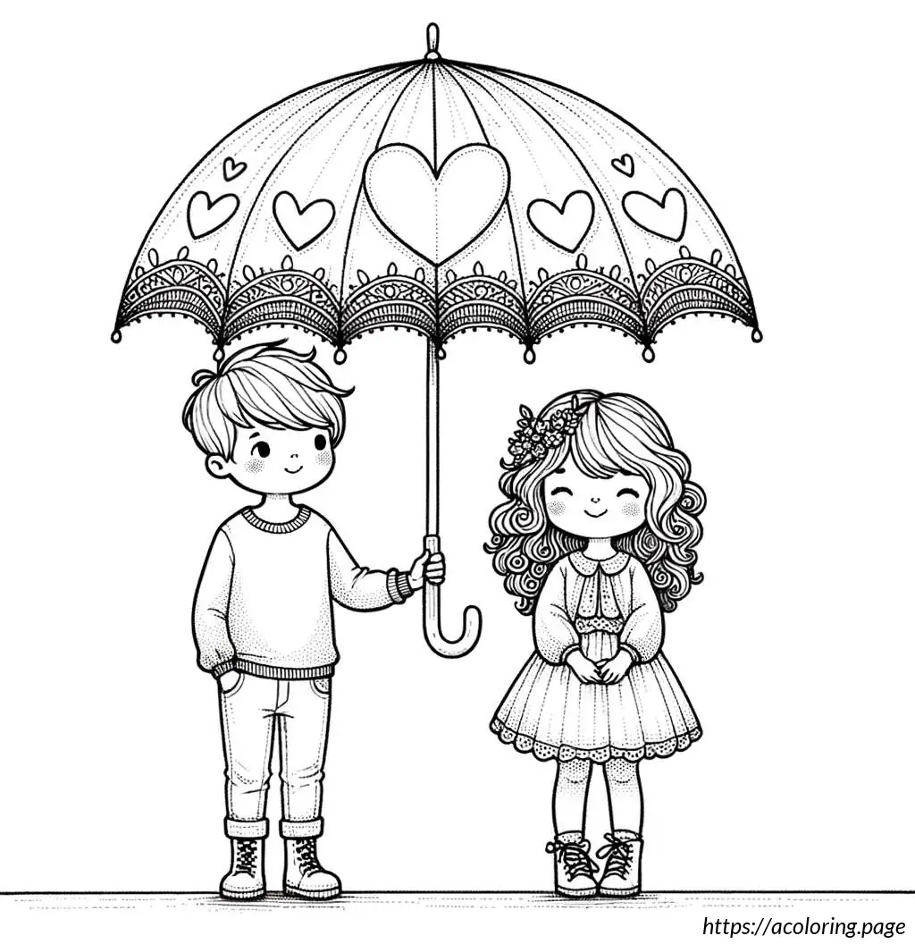 This image is a black and white line drawing that depicts two stylized characters, a boy and a girl, standing under an umbrella. The umbrella is large and has its upper side decorated with three hearts. Both children are facing each other and smiling. The boy, on the left, has short hair and is wearing a long-sleeve shirt and pants. He is holding the handle of the umbrella. The girl, on the right, has curly hair and is wearing a dress with shoes. The image has a simple and innocent look, likely aimed at children, and could be used for coloring activities.