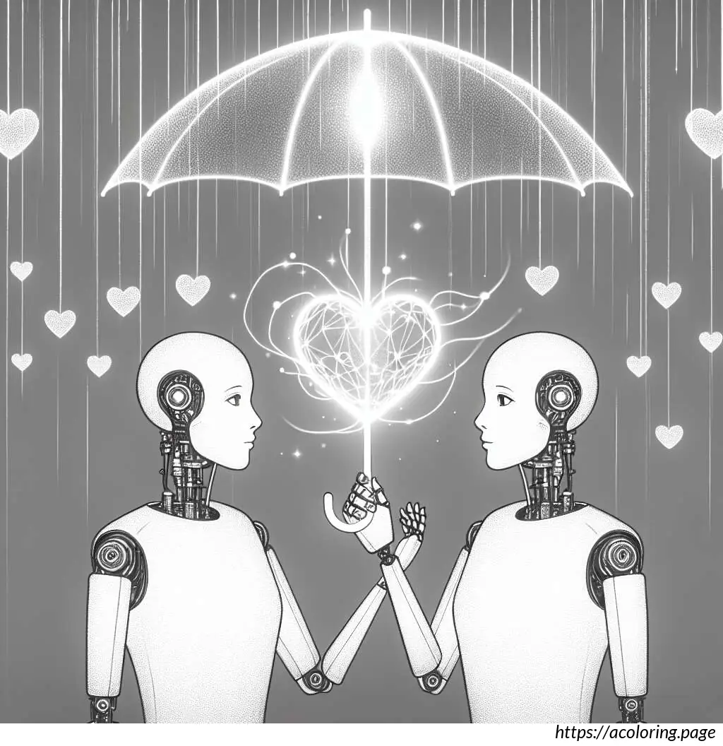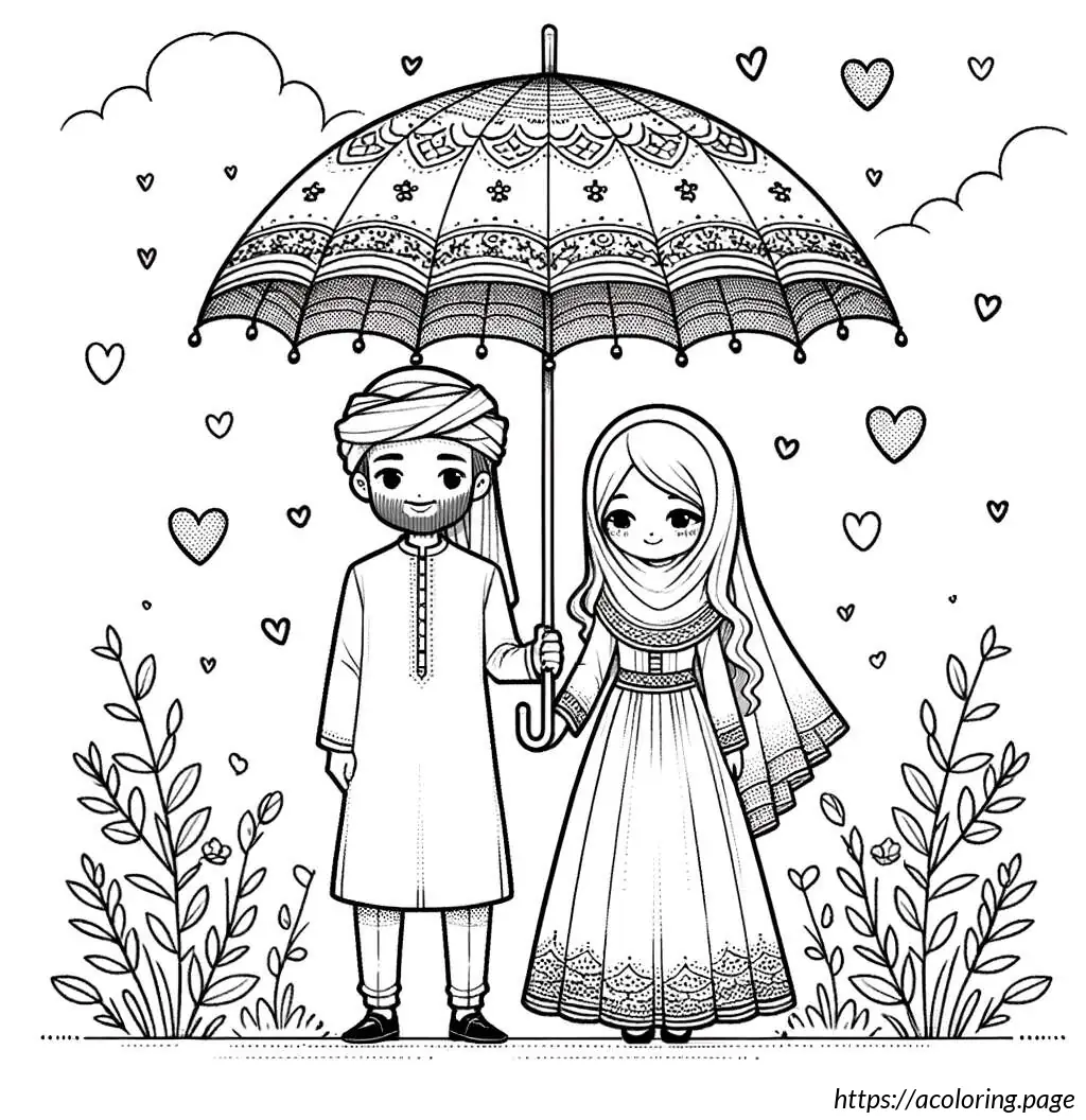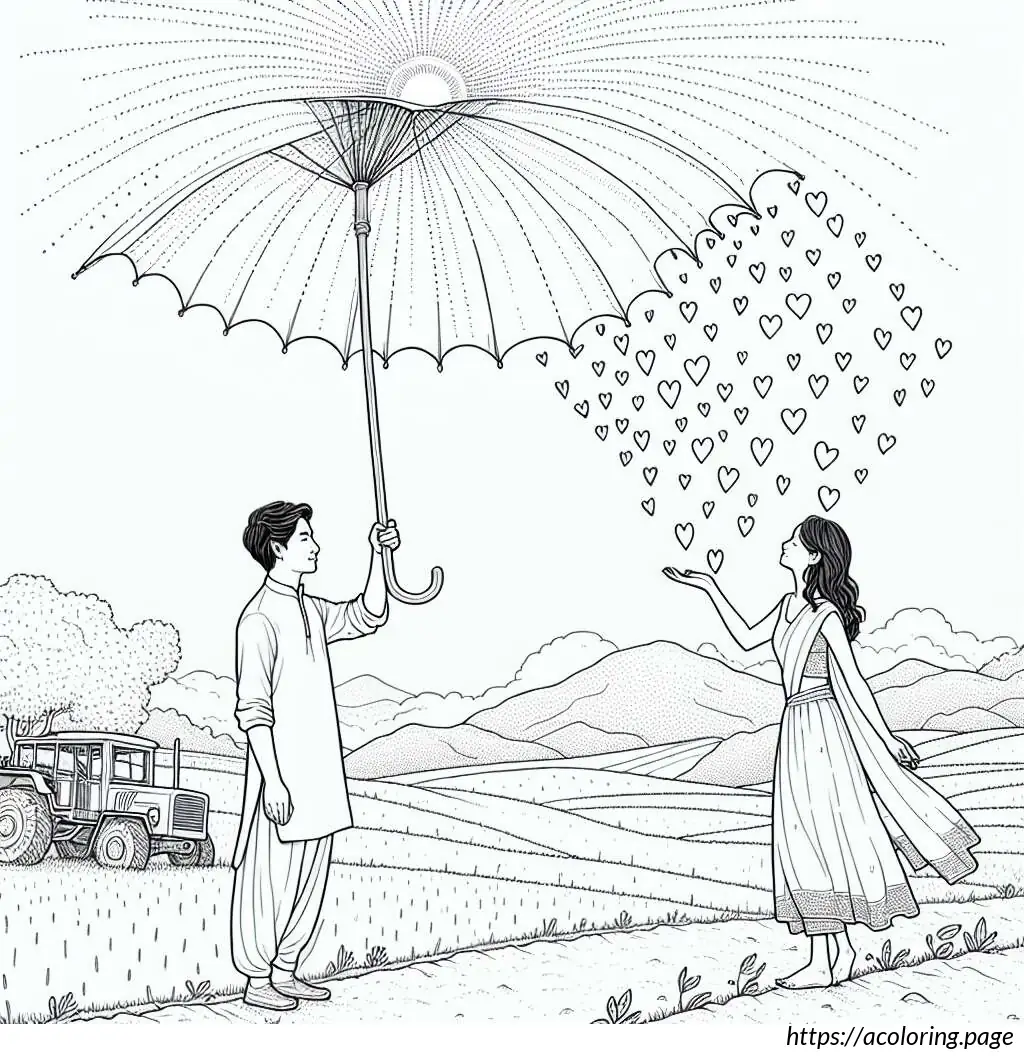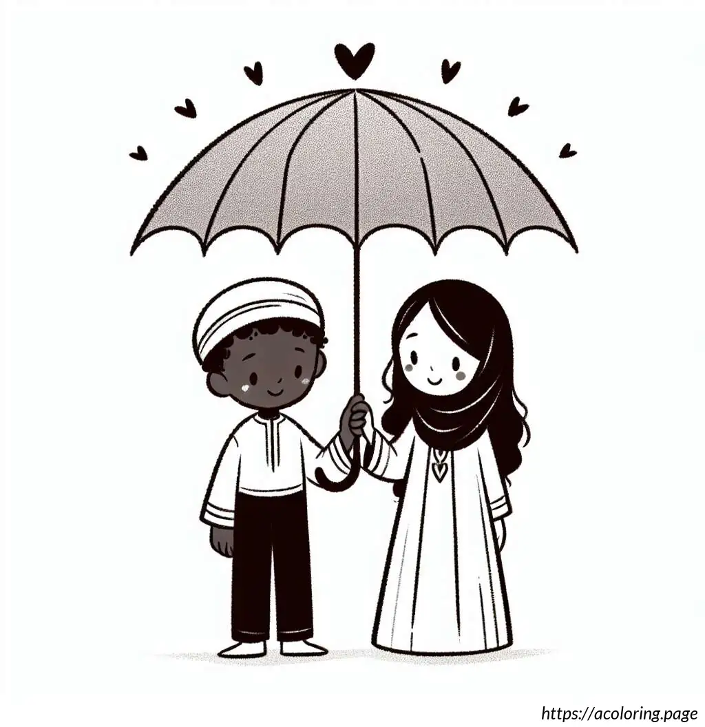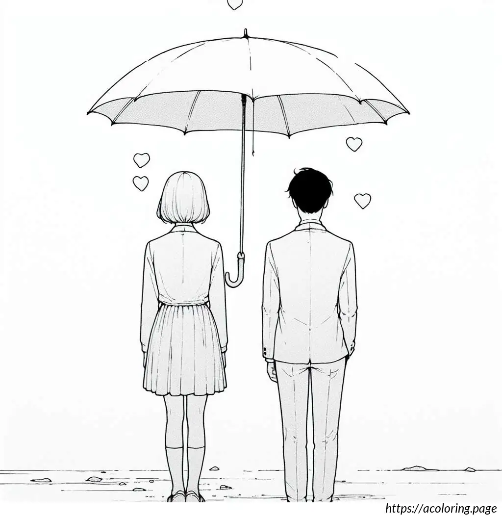 This image is a black and white line drawing that depicts two stylized characters, a boy and a girl, standing under an umbrella. The umbrella is large and has its upper side decorated with three hearts. Both children are facing each other and smiling. The boy, on the left, has short hair and is wearing a long-sleeve shirt and pants. He is holding the handle of the umbrella. The girl, on the right, has curly hair and is wearing a dress with shoes. The image has a simple and innocent look, likely aimed at children, and could be used for coloring activities.