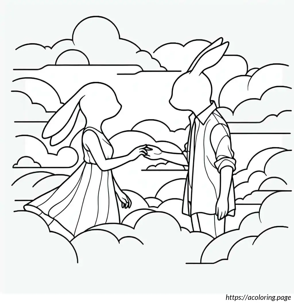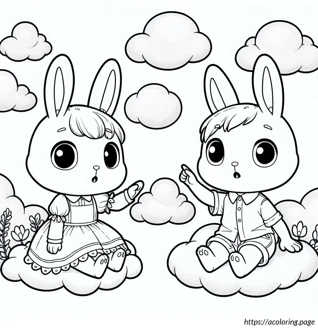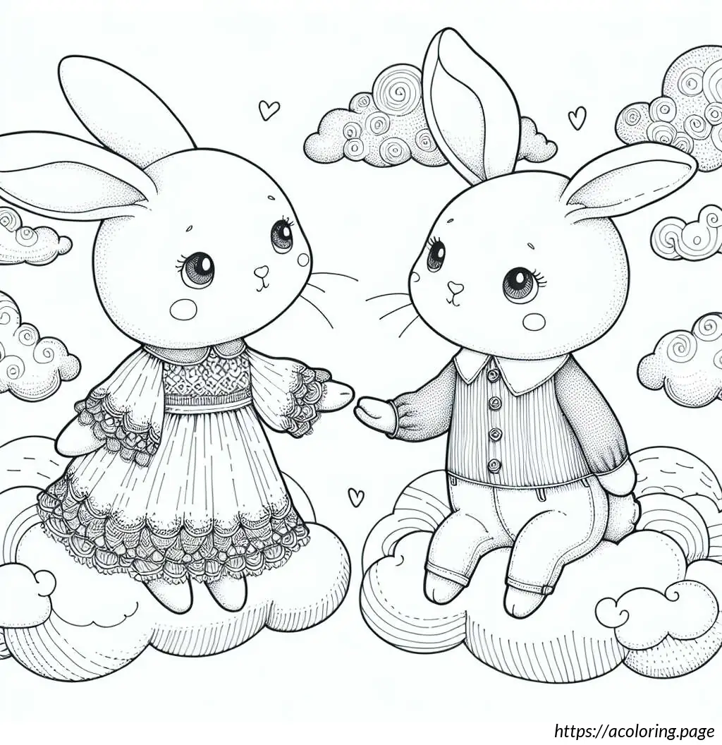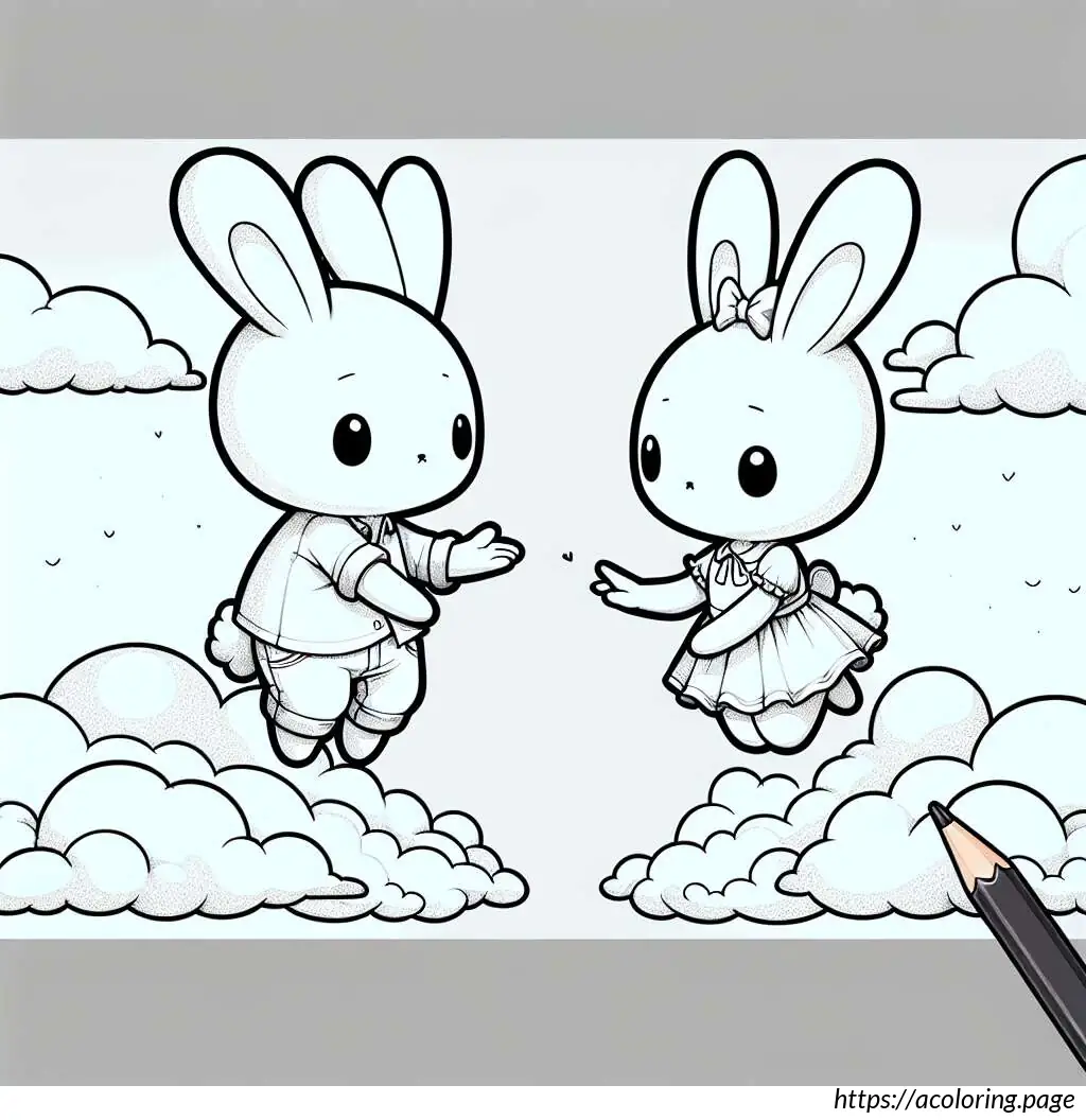 Both rabbits have simple features—big eyes, whiskers, a small mouth, and long ears that stand upright. The background includes fluffy cloud outlines and a couple of abstract cloud shapes, giving a gentle and whimsical ambiance to the scene. The entire image is in black and white with a cartoon-style line art depiction.