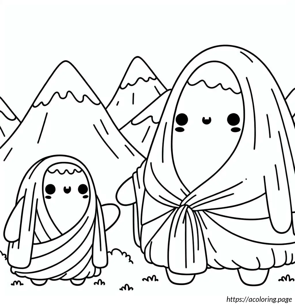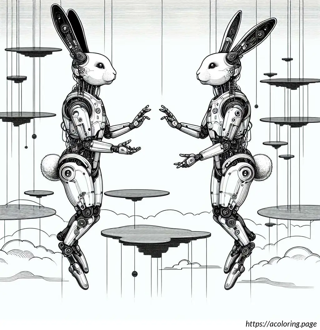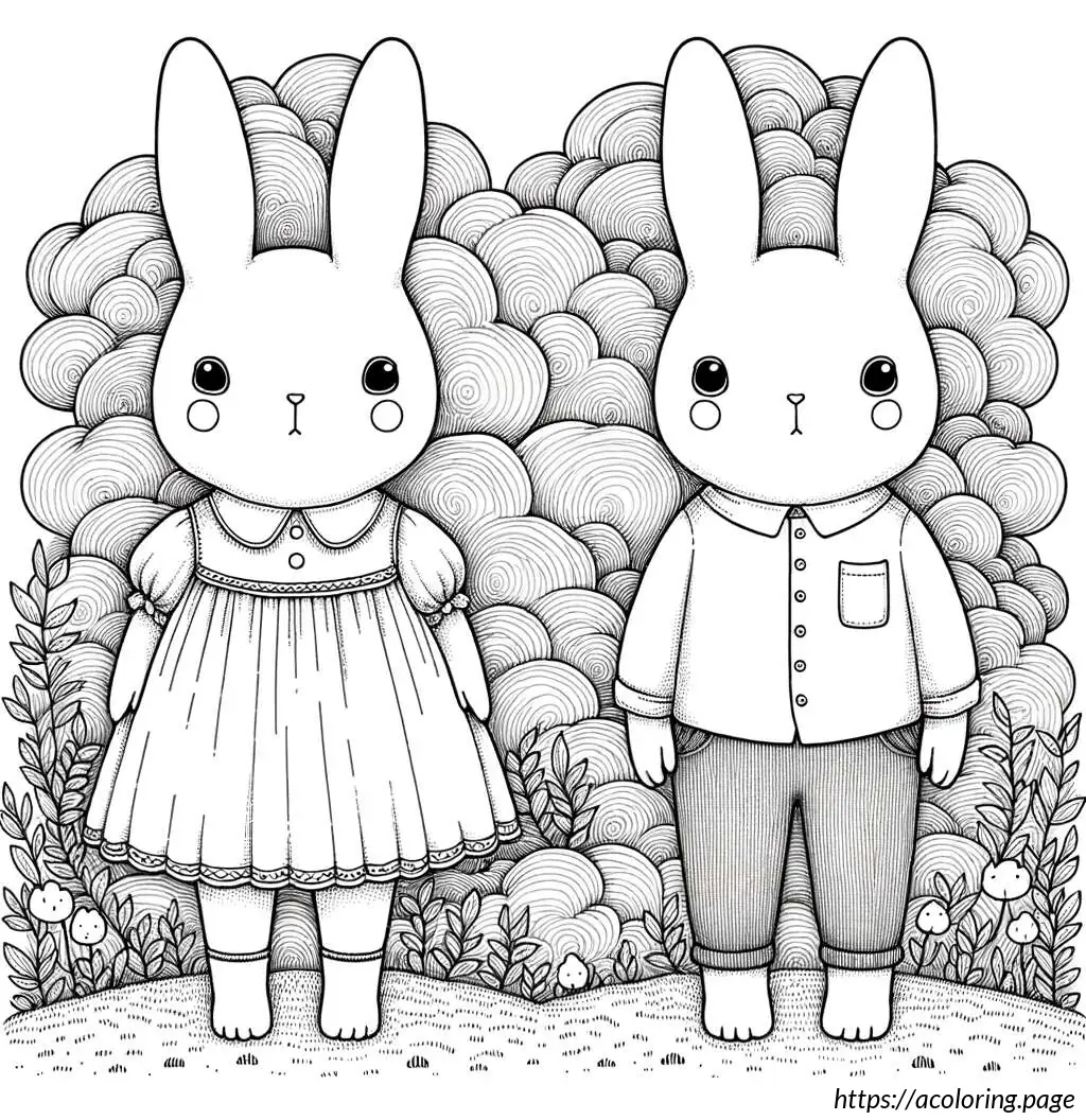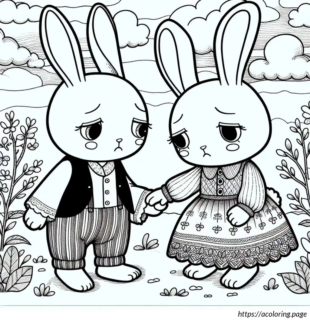 Both rabbits have simple features—big eyes, whiskers, a small mouth, and long ears that stand upright. The background includes fluffy cloud outlines and a couple of abstract cloud shapes, giving a gentle and whimsical ambiance to the scene. The entire image is in black and white with a cartoon-style line art depiction.