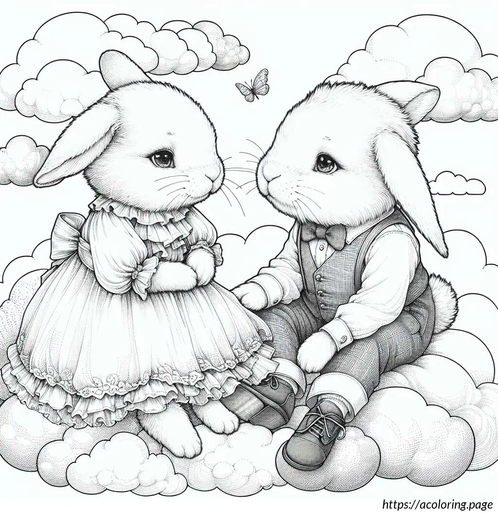 The image depicts two cartoon rabbits sitting on clouds and interacting with each other. The rabbit on the left is wearing a dress with lace trim at the hem. It has frills at the bottom, and the sleeves of the dress are visible with a simple line decoration. The rabbit also has a simple, relaxed expression.