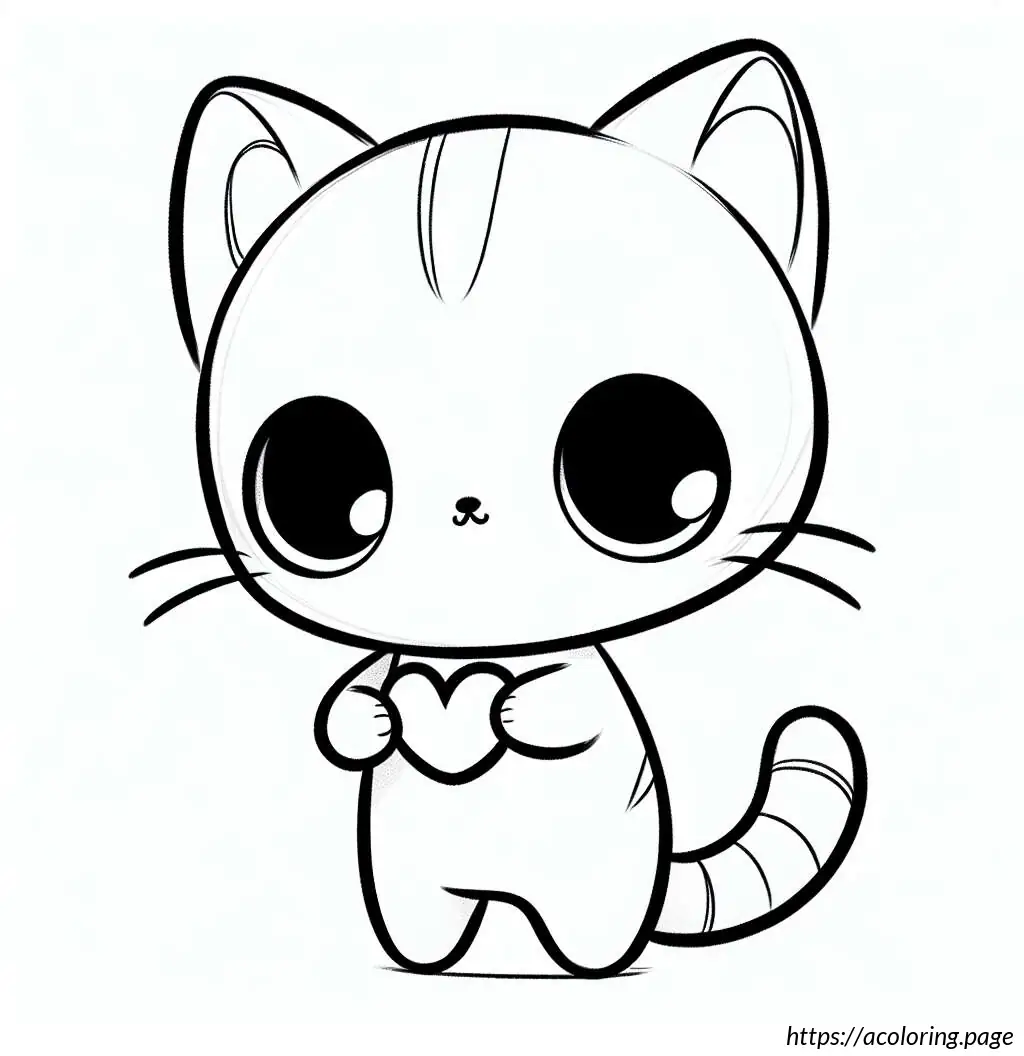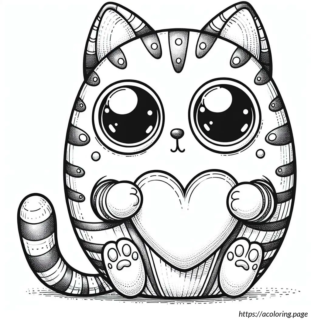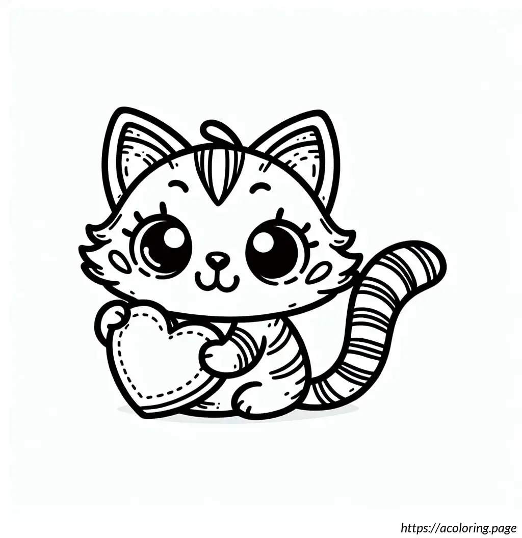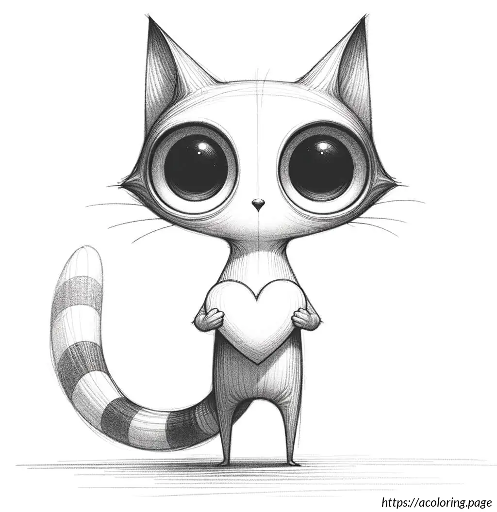 The image features a simple, cartoon-style drawing of a character that resembles a cat. The character is standing upright and has a large, heart-shaped torso. It is holding a heart shape with its hands, suggesting a theme of love or affection. The character has large, round eyes, giving it a surprised or innocent expression, and prominent whiskers. Its ears are pointy and positioned high on its head, and it has a striped tail that curls slightly at the end. The drawing is outlined in black with no colors filled in, giving it a clean, minimalistic look suitable for coloring.