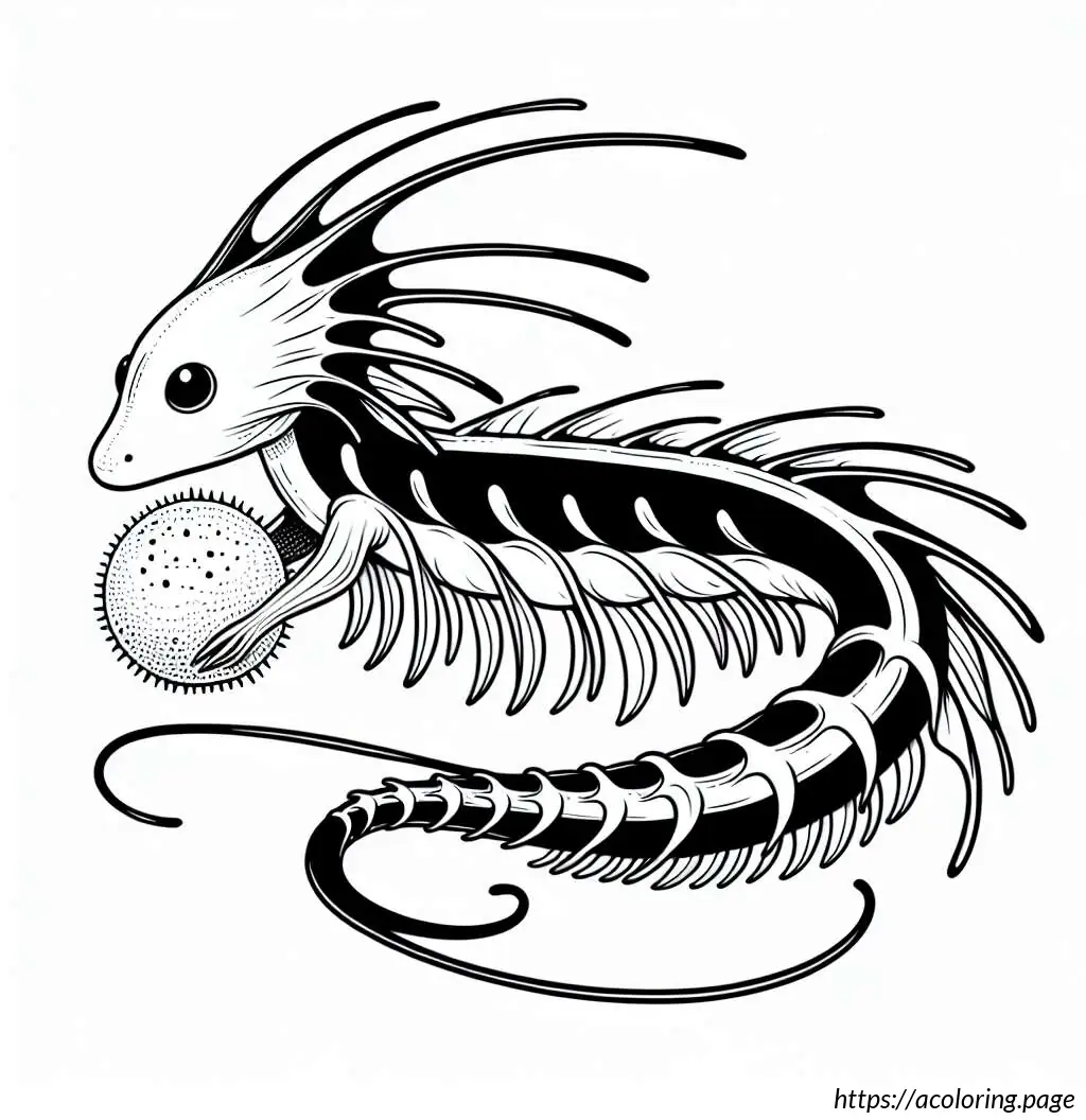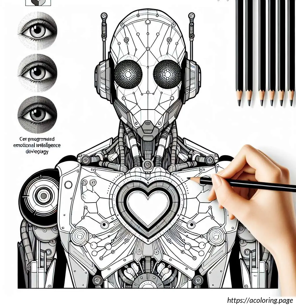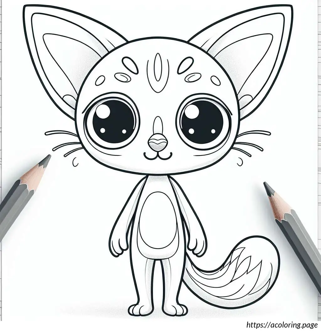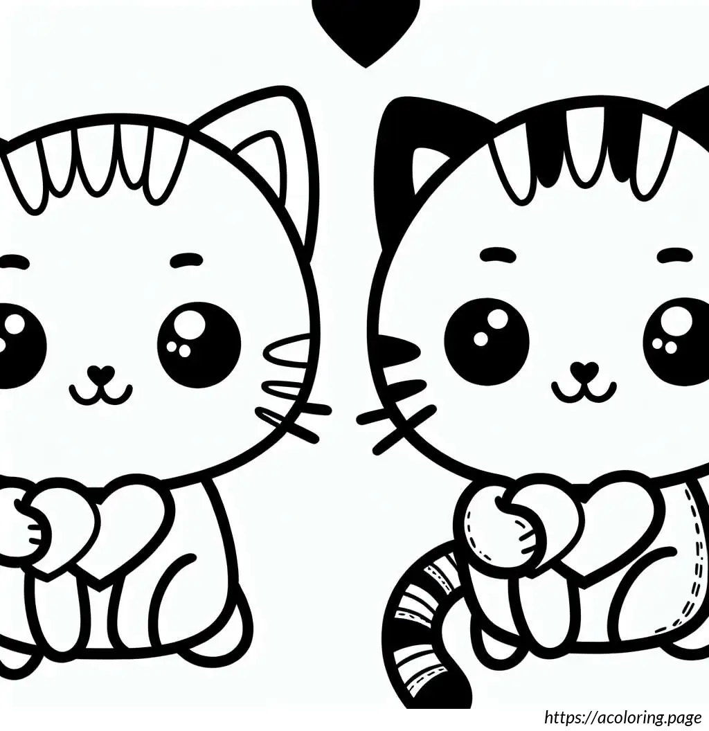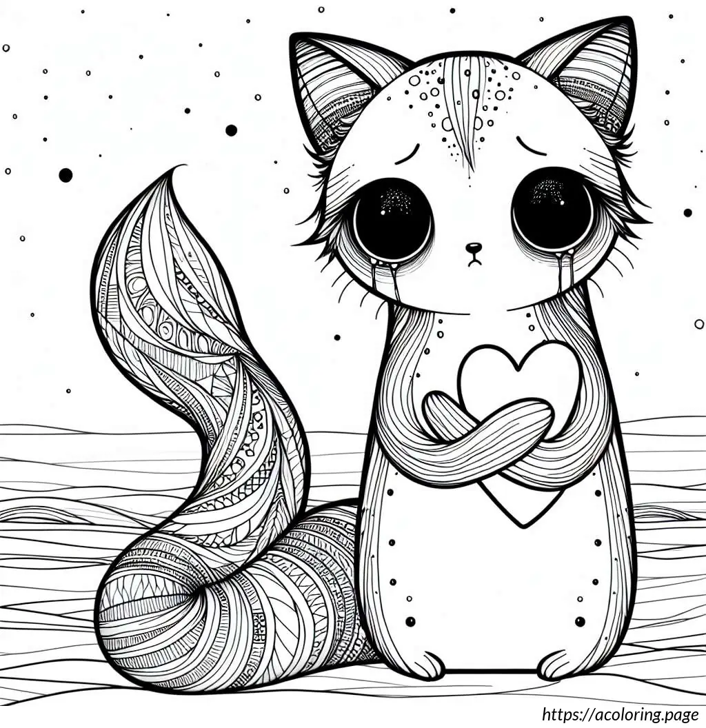 The image features a simple, cartoon-style drawing of a character that resembles a cat. The character is standing upright and has a large, heart-shaped torso. It is holding a heart shape with its hands, suggesting a theme of love or affection. The character has large, round eyes, giving it a surprised or innocent expression, and prominent whiskers. Its ears are pointy and positioned high on its head, and it has a striped tail that curls slightly at the end. The drawing is outlined in black with no colors filled in, giving it a clean, minimalistic look suitable for coloring.