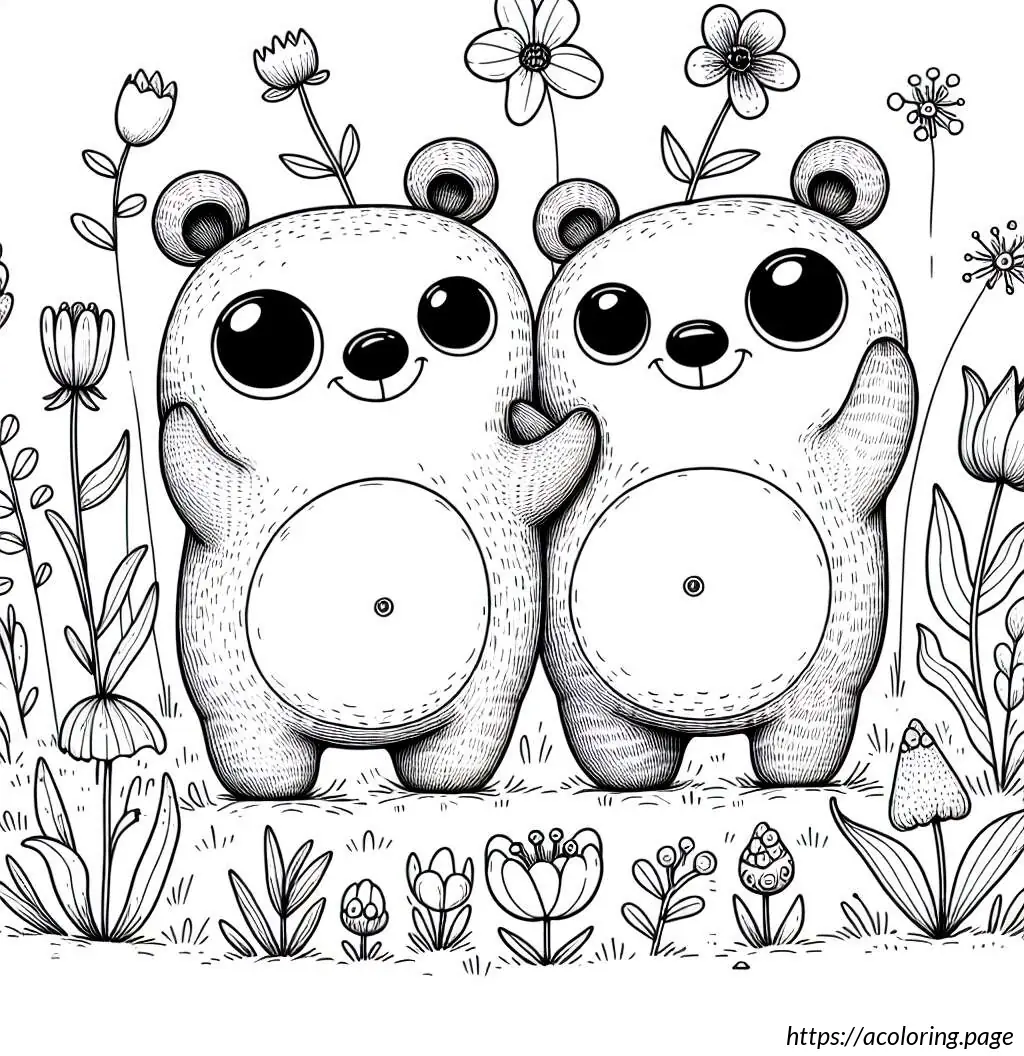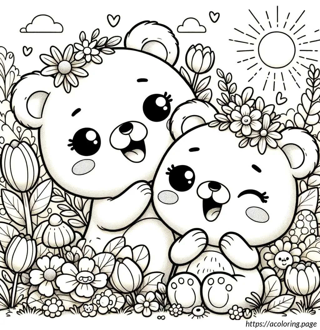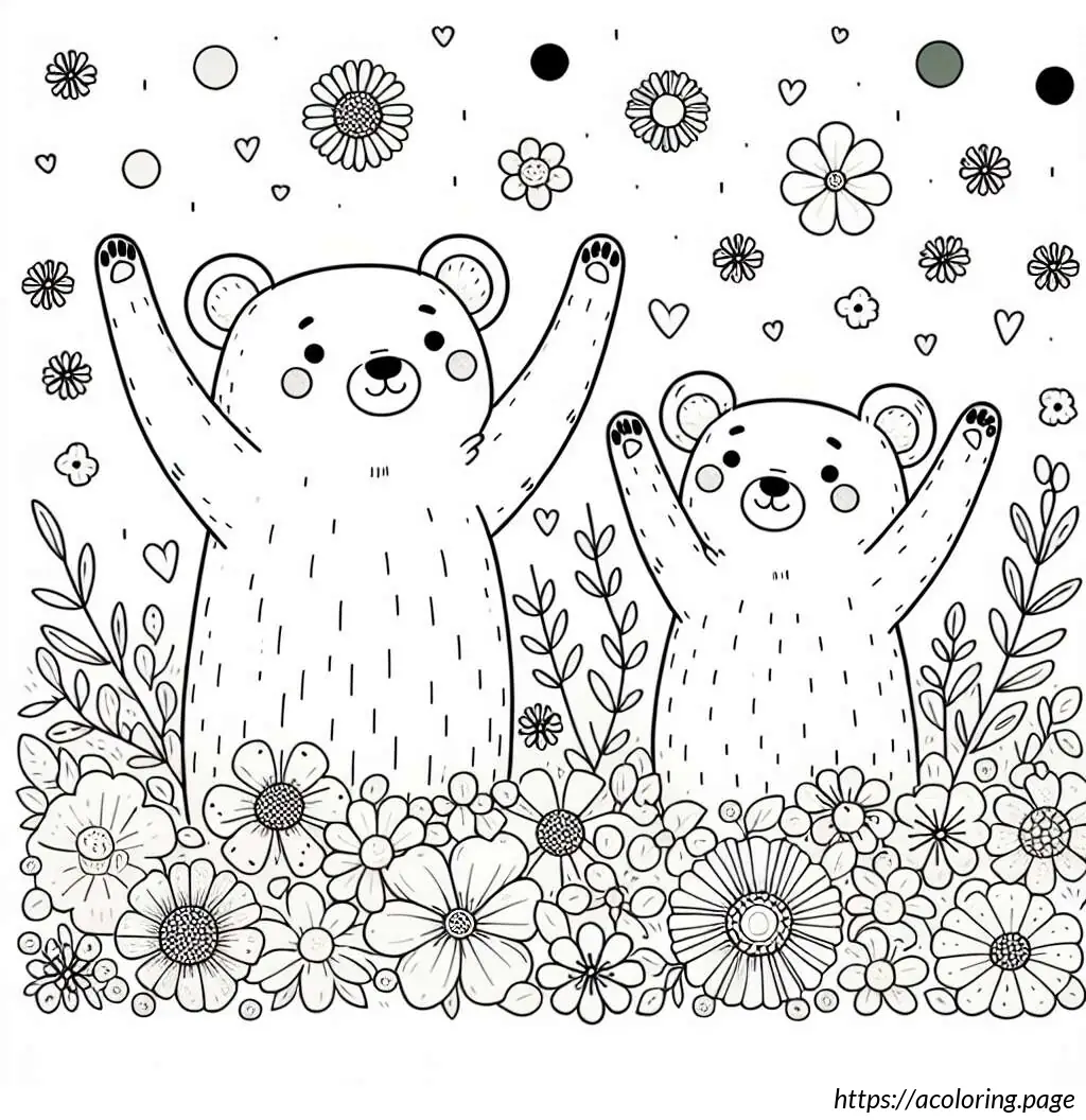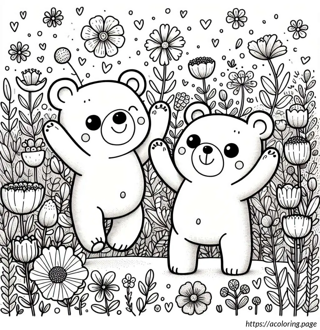 The bears appear joyful; the one on the left is waving its arms upwards, perhaps in a greeting or in excitement, while the one on the right has one arm raised and the other extended outwards as if waving. The setting includes various types of flowers and foliage around them. The flowers are stylized and simple in design, featuring tulip-like and daisy-like shapes. There are no other elements or colors, keeping the focus on the playful expressions and the charming simplicity of the design.
