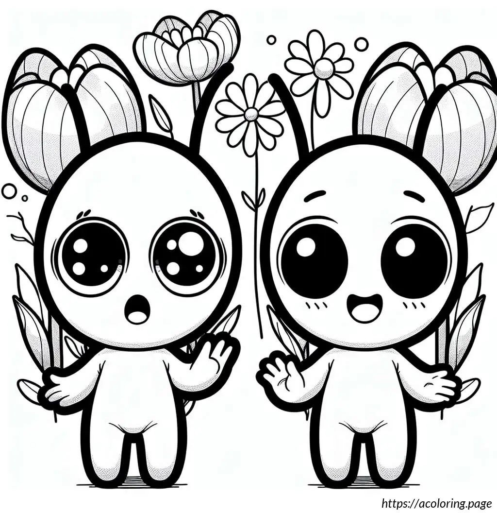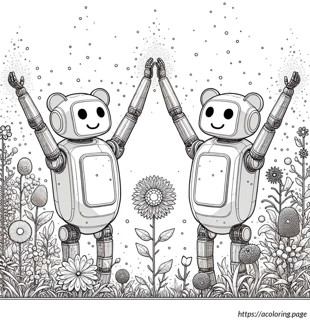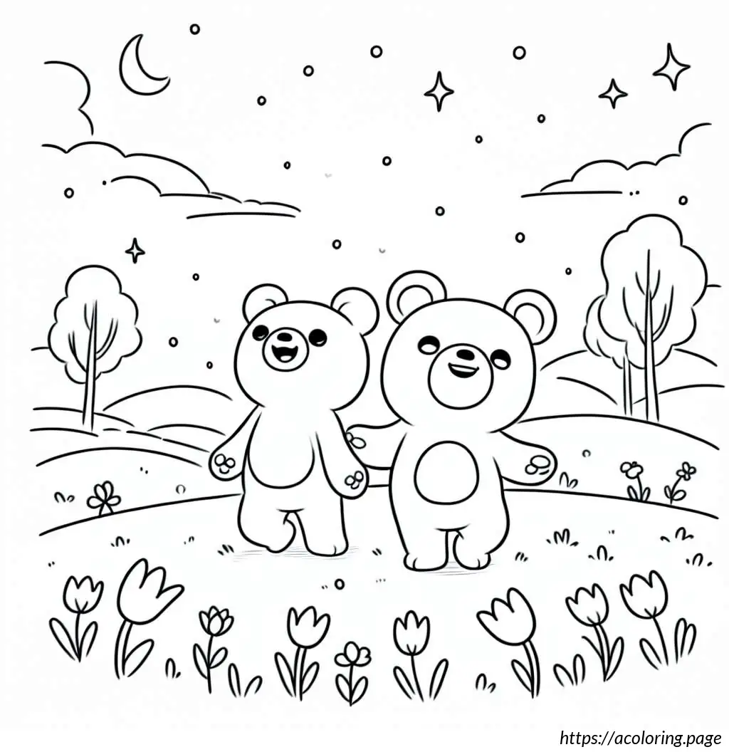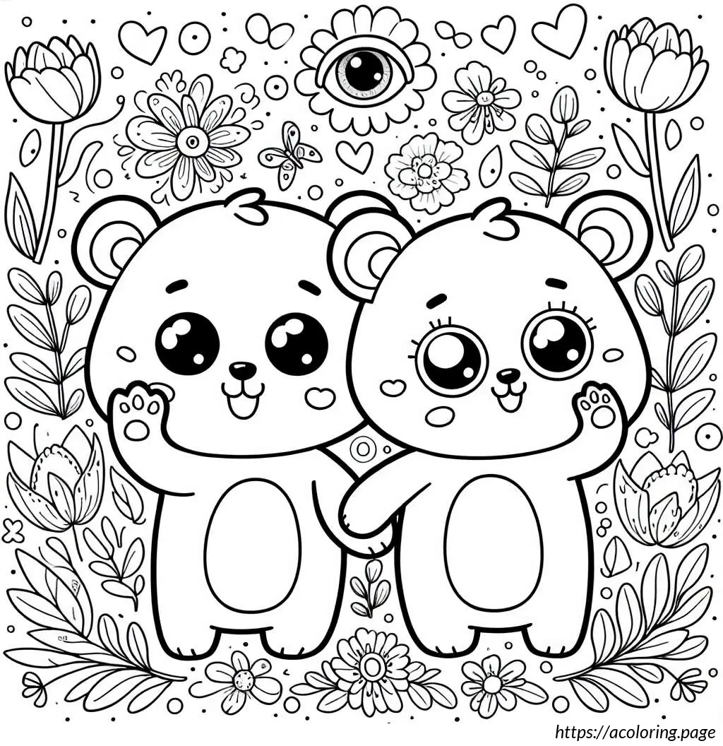 The bears appear joyful; the one on the left is waving its arms upwards, perhaps in a greeting or in excitement, while the one on the right has one arm raised and the other extended outwards as if waving. The setting includes various types of flowers and foliage around them. The flowers are stylized and simple in design, featuring tulip-like and daisy-like shapes. There are no other elements or colors, keeping the focus on the playful expressions and the charming simplicity of the design.