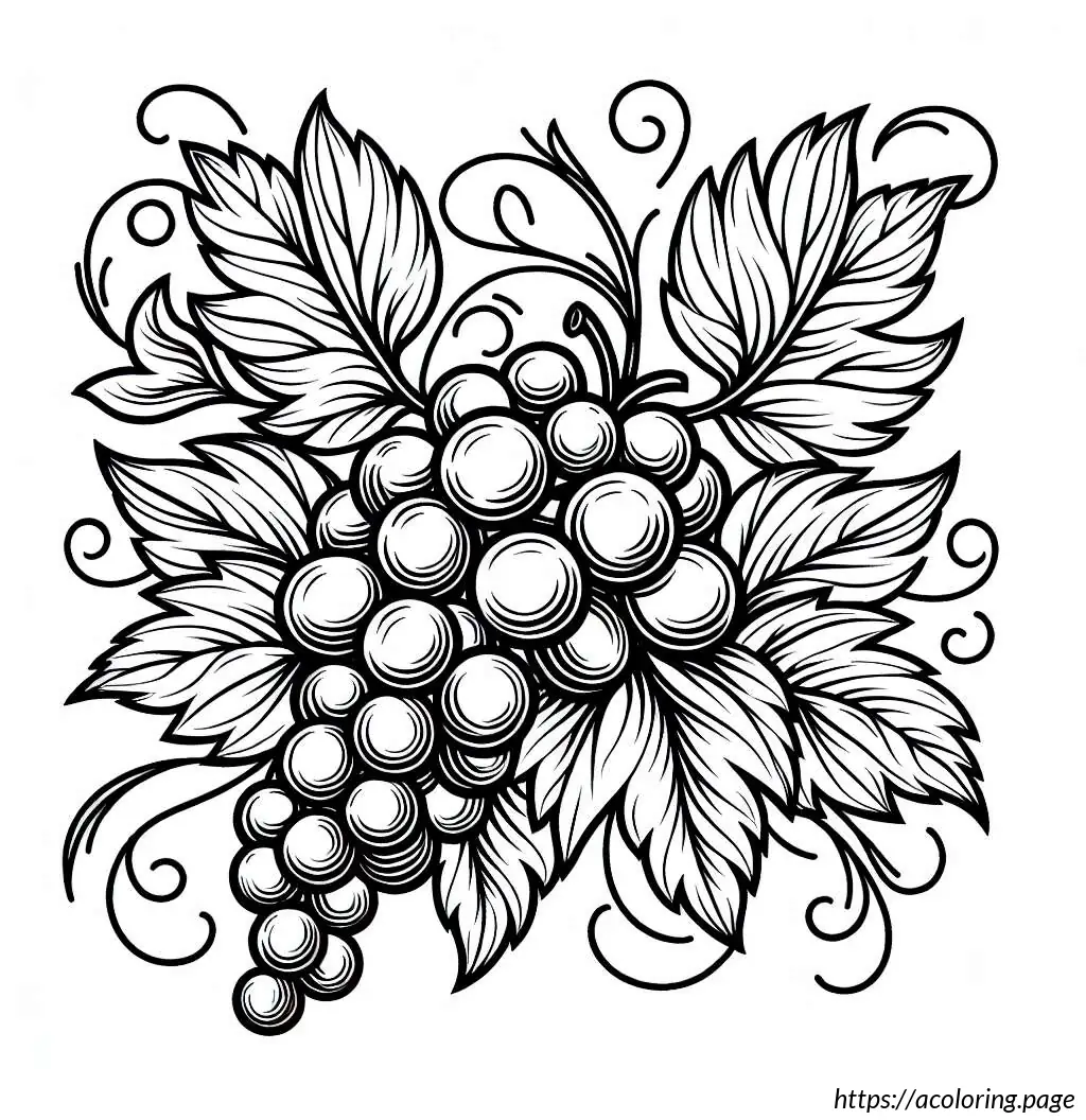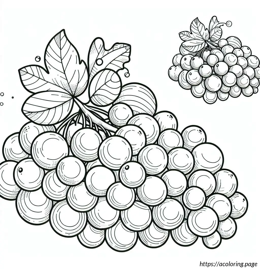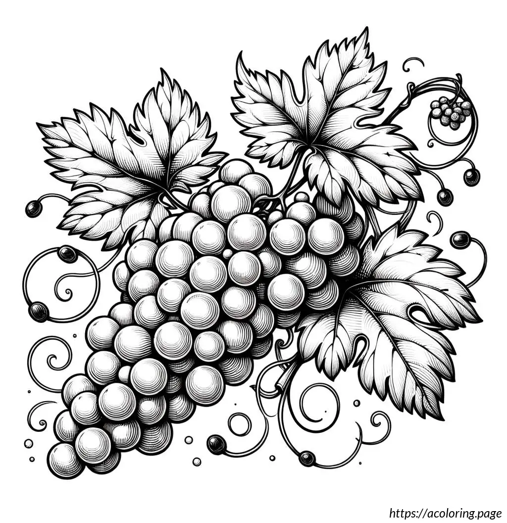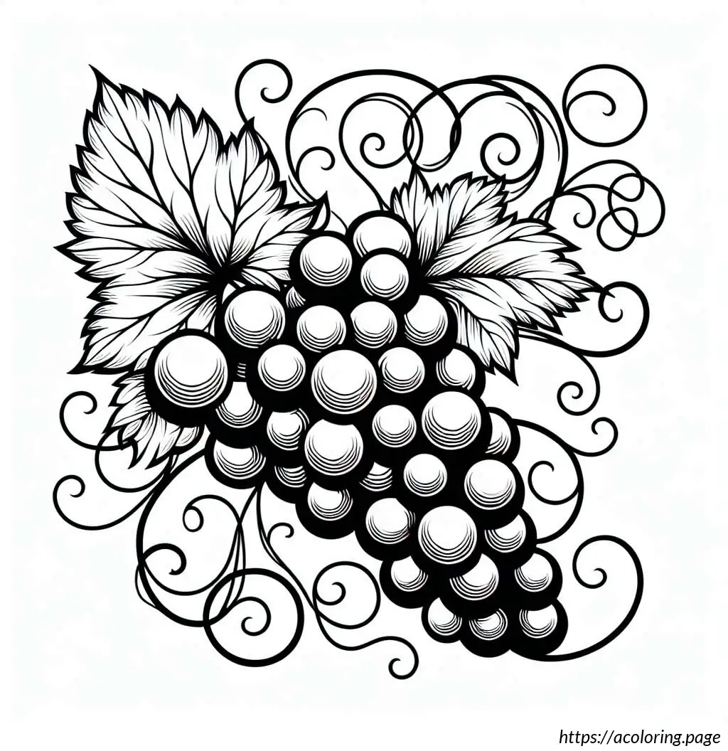 The image shows a stylized, black and white illustration of a cluster of grapes. The grapes are depicted by various overlapping circles of different sizes, suggesting the volume and shape of each grape. There are two leaves and a curly vine attached to the cluster. The leaves have pointed edges and one appears to be slightly behind the grapes, while the other is in front. The vine curls elegantly at the top. The illustration uses bold, clear lines to define each component, creating a graphic that is suitable for logos, decorative elements, or simple print designs.