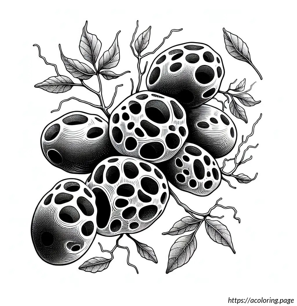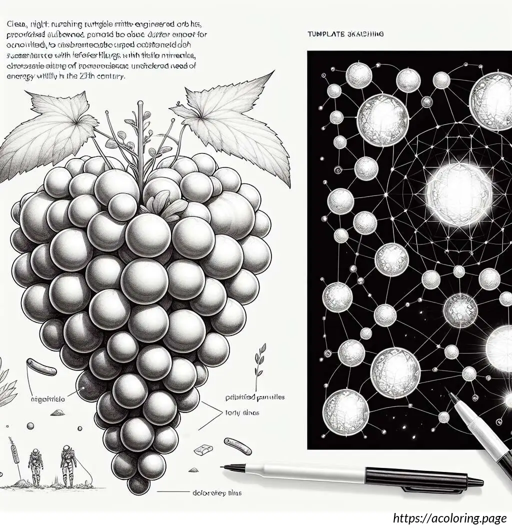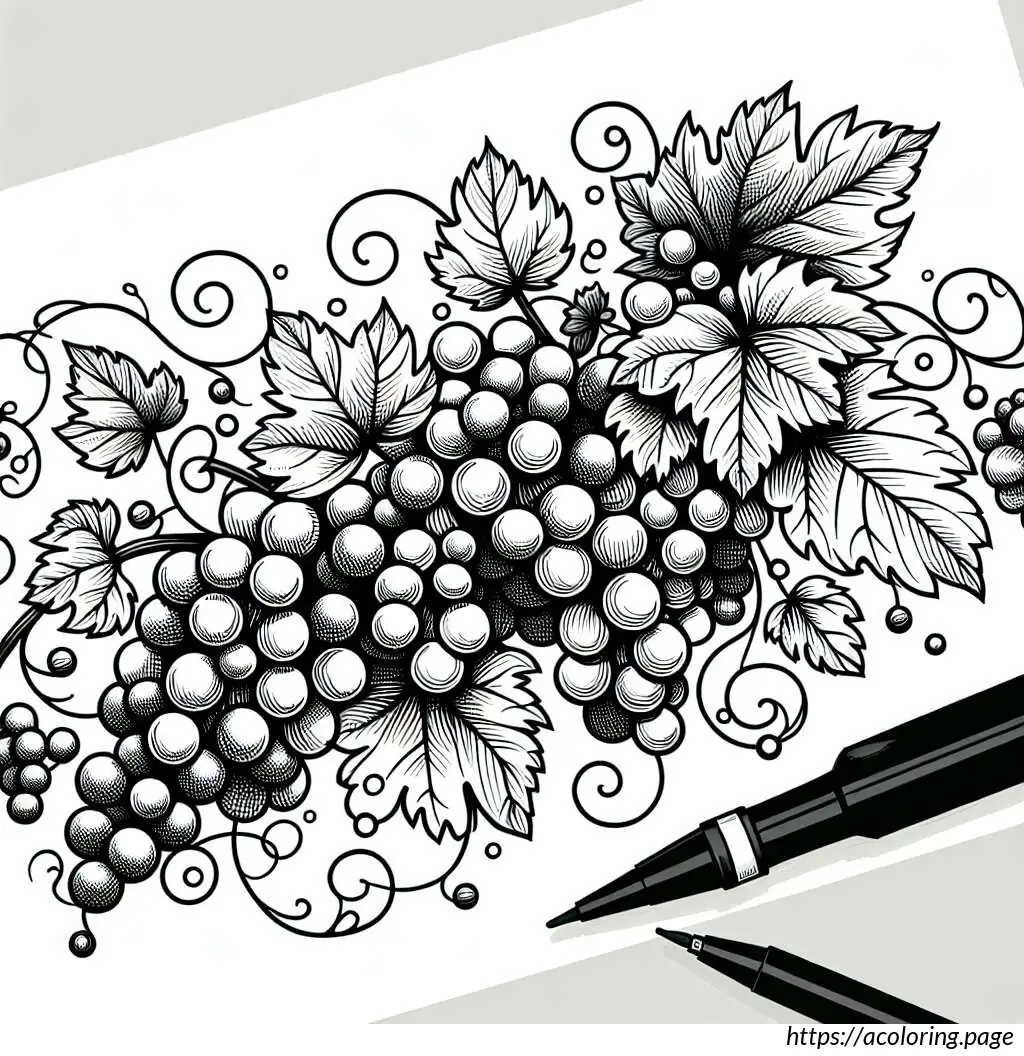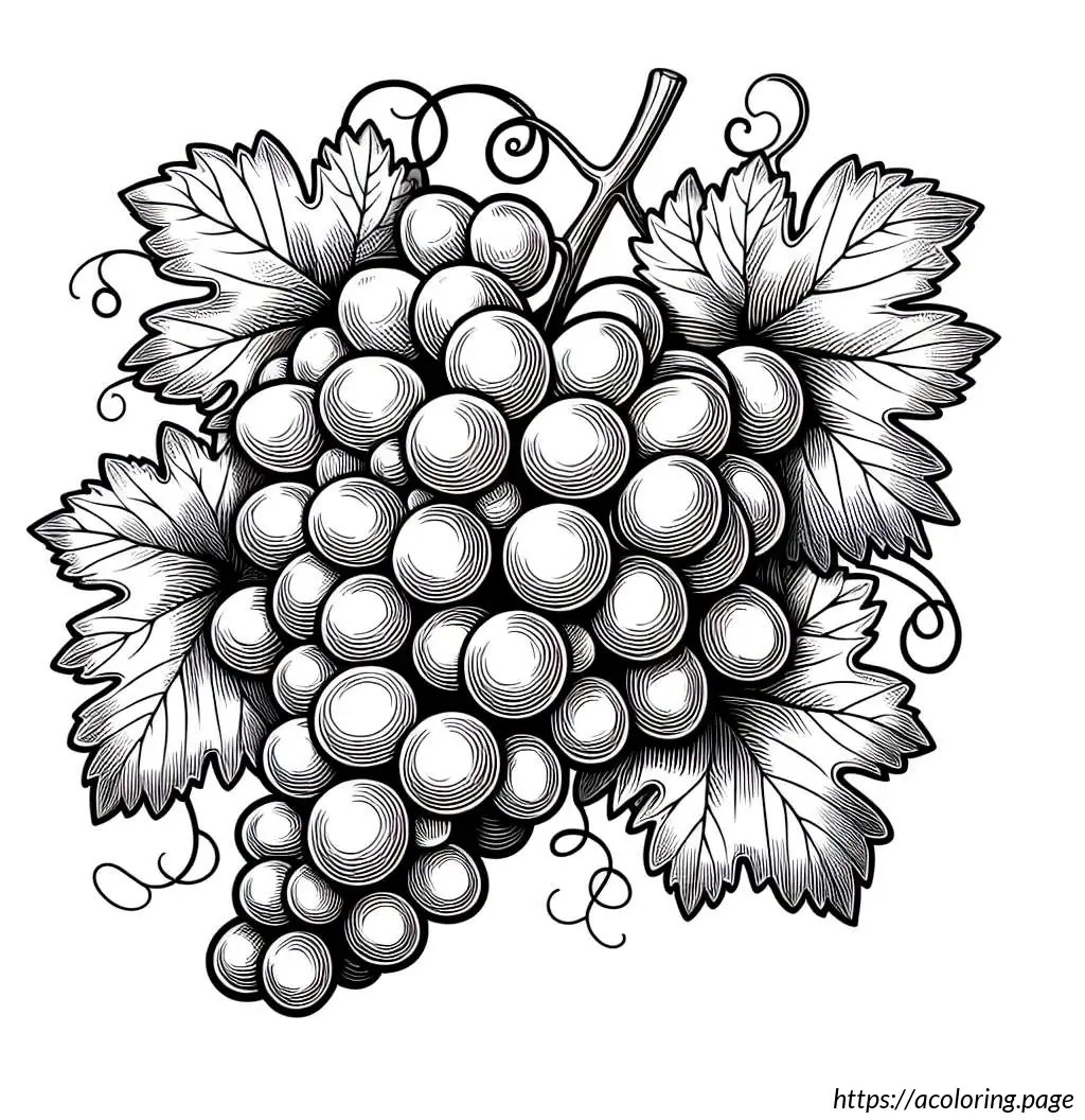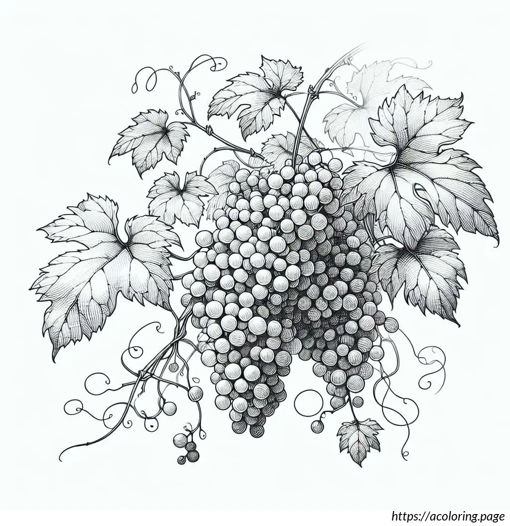 The image shows a stylized, black and white illustration of a cluster of grapes. The grapes are depicted by various overlapping circles of different sizes, suggesting the volume and shape of each grape. There are two leaves and a curly vine attached to the cluster. The leaves have pointed edges and one appears to be slightly behind the grapes, while the other is in front. The vine curls elegantly at the top. The illustration uses bold, clear lines to define each component, creating a graphic that is suitable for logos, decorative elements, or simple print designs.