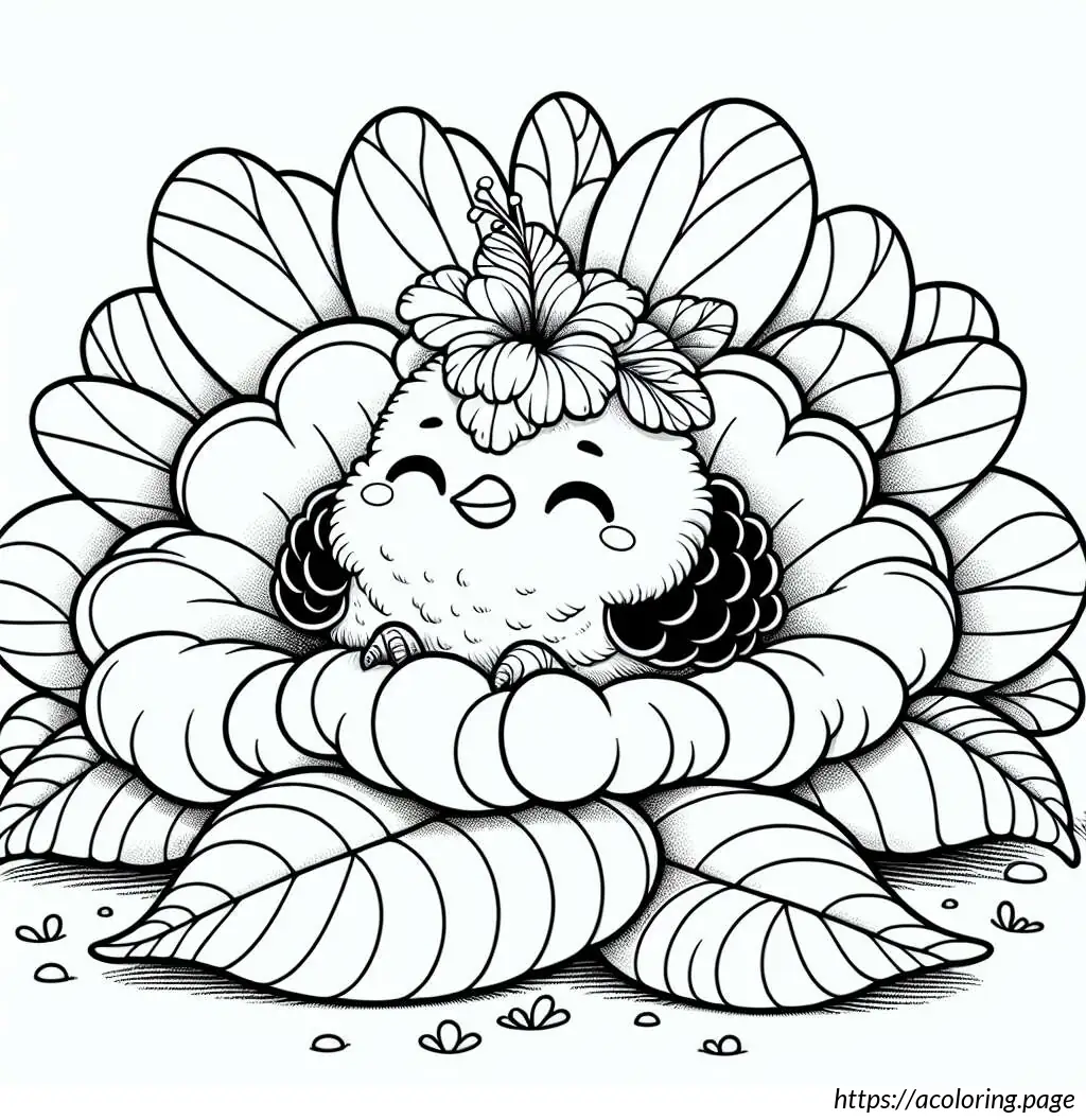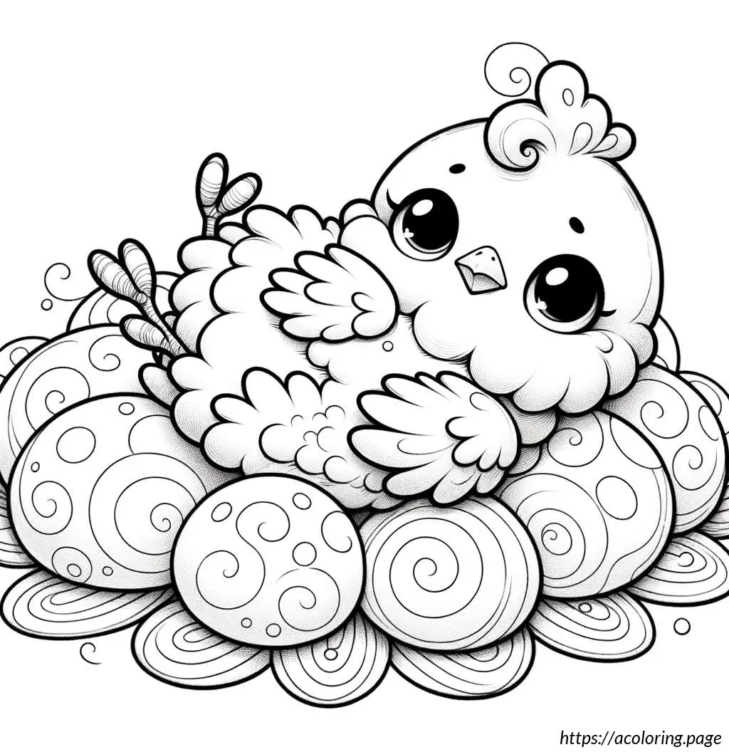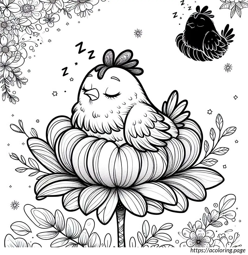 The image depicts a cartoon-style drawing of a baby chick. The chick is lying on its back, resting on what appears to be a fantastical representation of a flower or a cloud. The outlines of the image are bold and simple, suitable for coloring purposes.