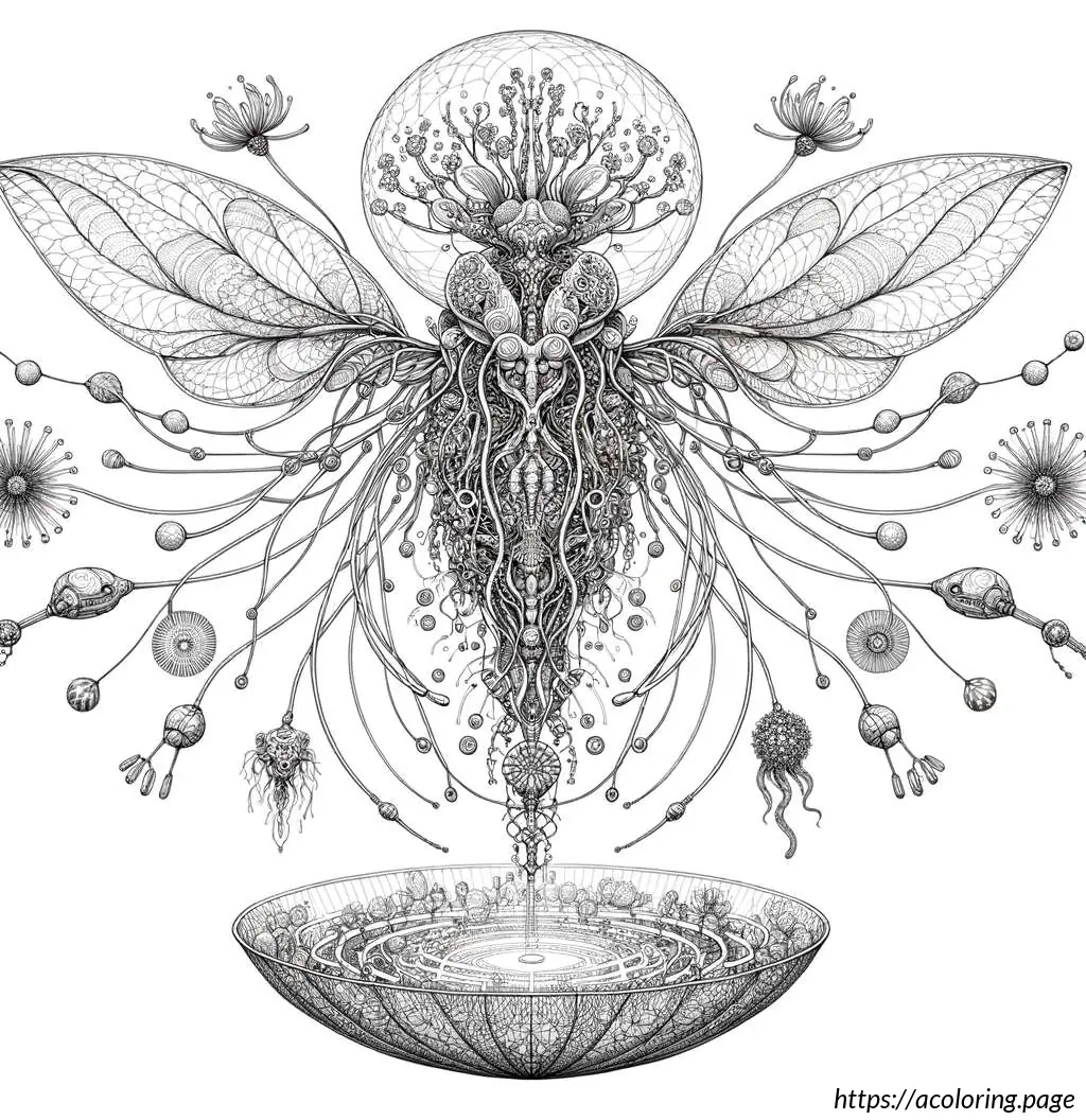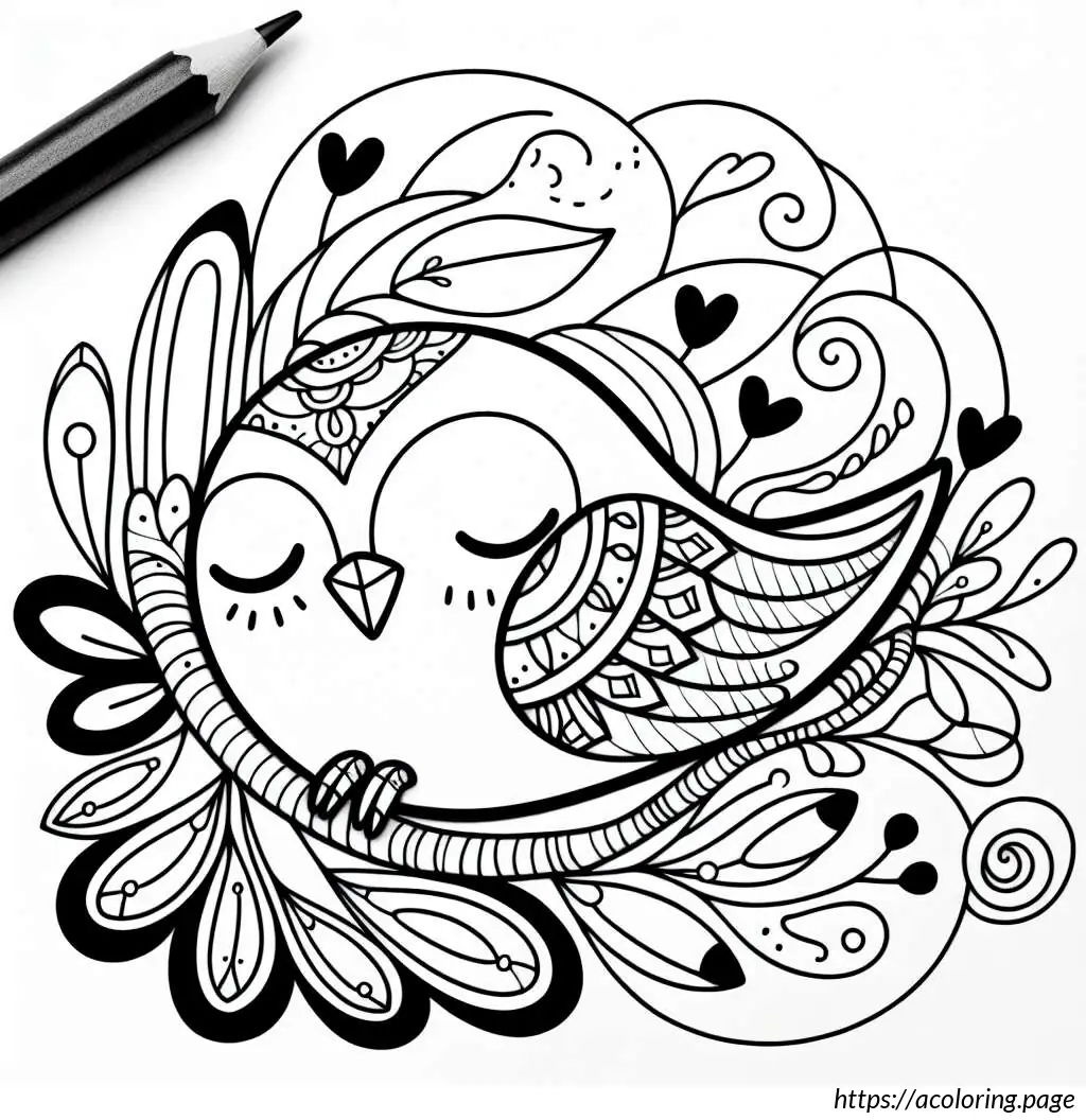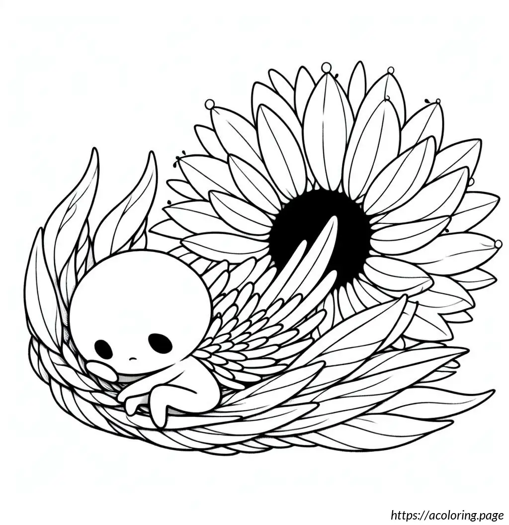 The image depicts a cartoon-style drawing of a baby chick. The chick is lying on its back, resting on what appears to be a fantastical representation of a flower or a cloud. The outlines of the image are bold and simple, suitable for coloring purposes.