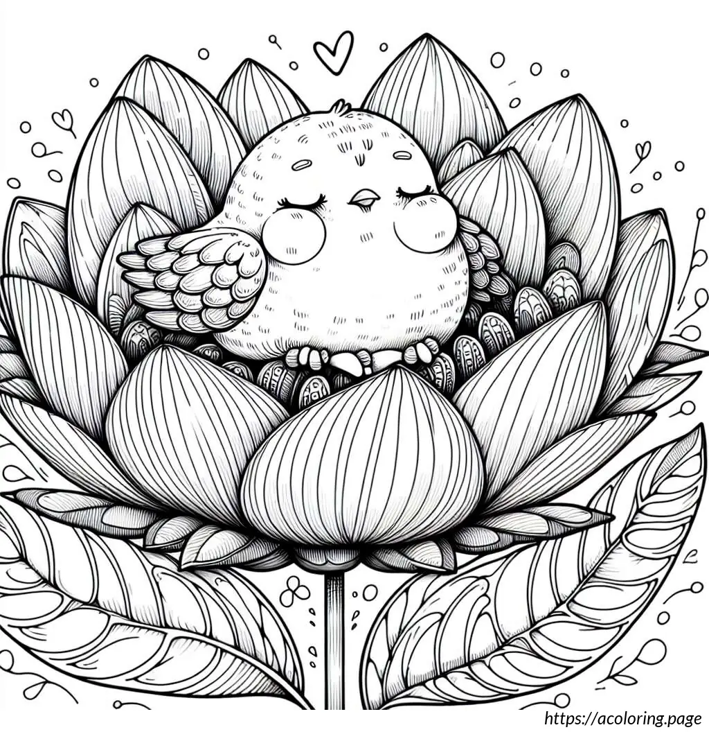 The flower/cloud base on which the chick rests consists of several rounded petals or puffs symmetrically arranged around a central stalk that supports the chick like a bed. Below this, there are additional rounded forms that might represent either additional petals or perhaps clouds, suggesting a soft, floating setting.