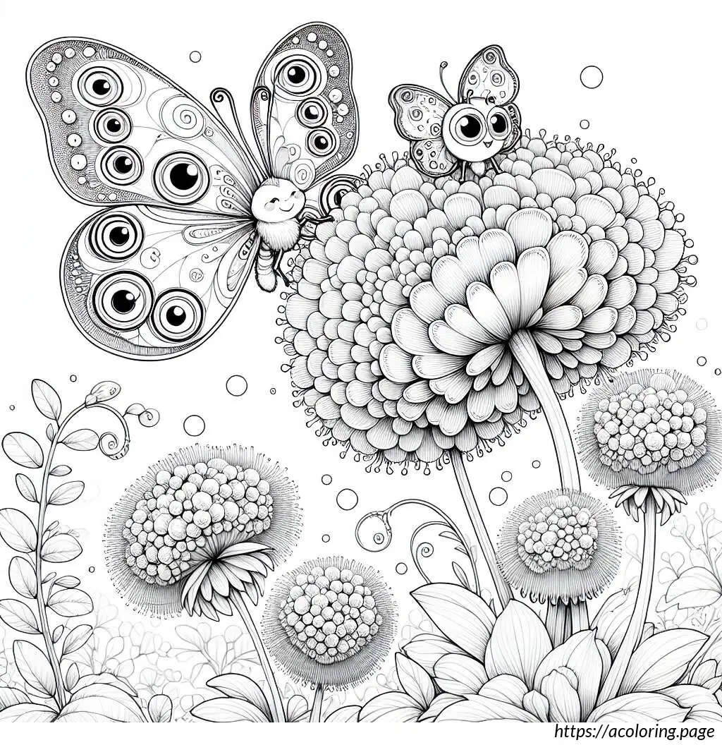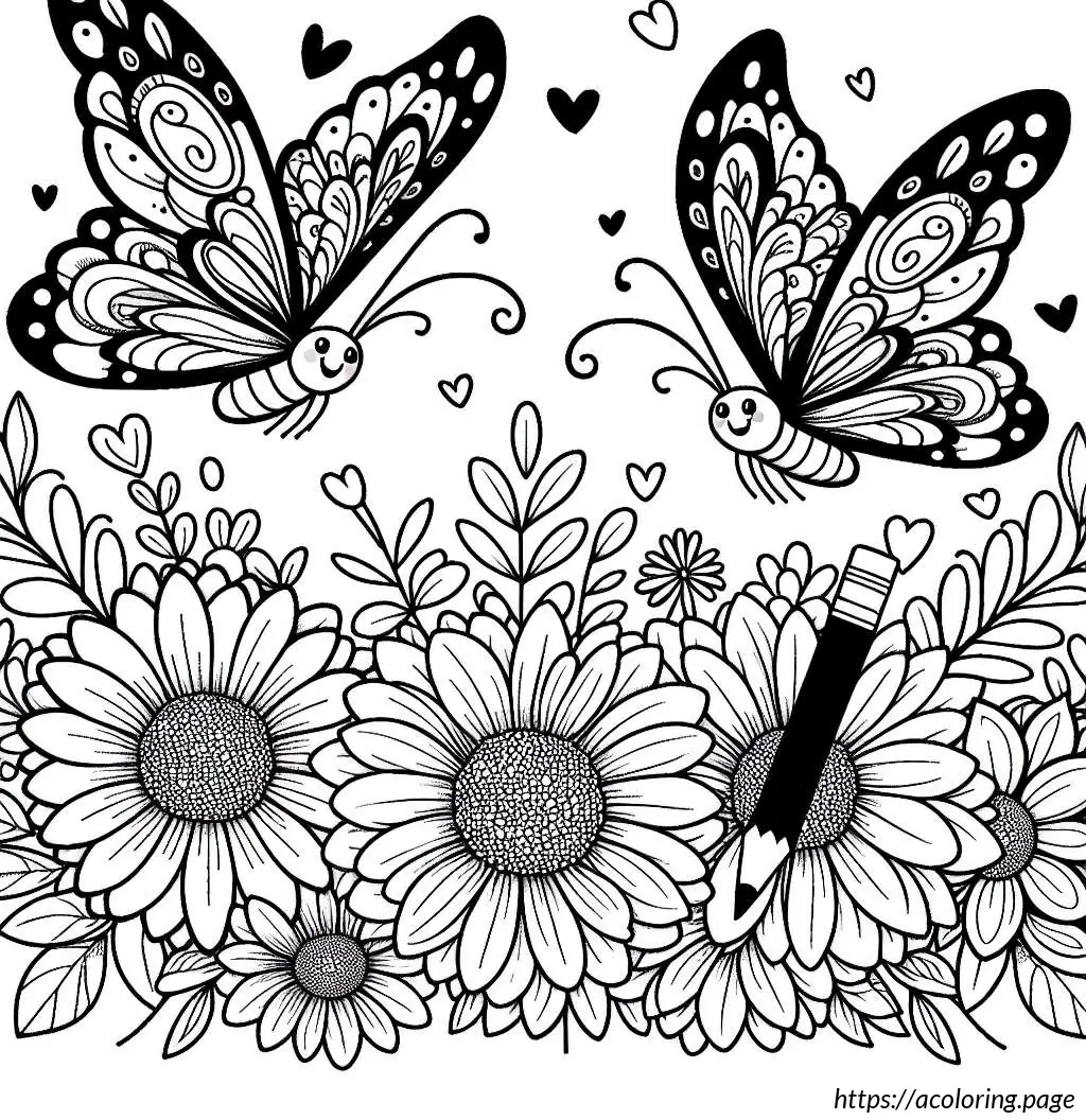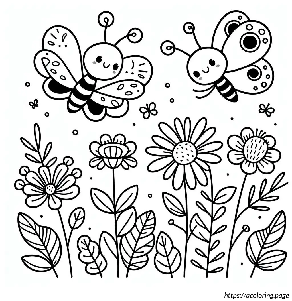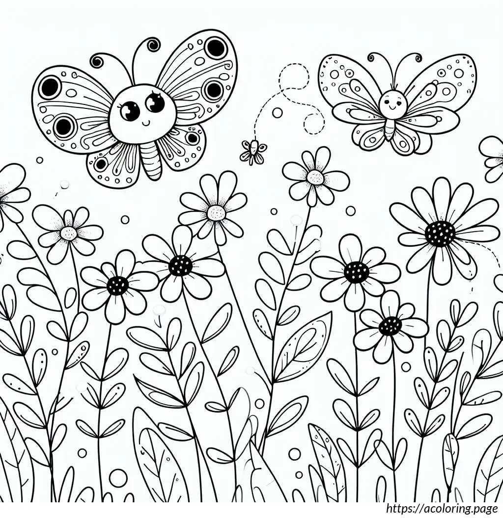 This is a black and white line drawing suitable for coloring. It features two whimsical, cartoonish butterflies above a field of tall flowers. The flowers have large, rounded leaves and the stems are tall and slender. The butterflies have playful expressions, big eyes, and their wings and bodies display simple, decorative markings akin to spots and stripes. The image is charming and designed to appeal to children, making it an ideal activity for coloring.