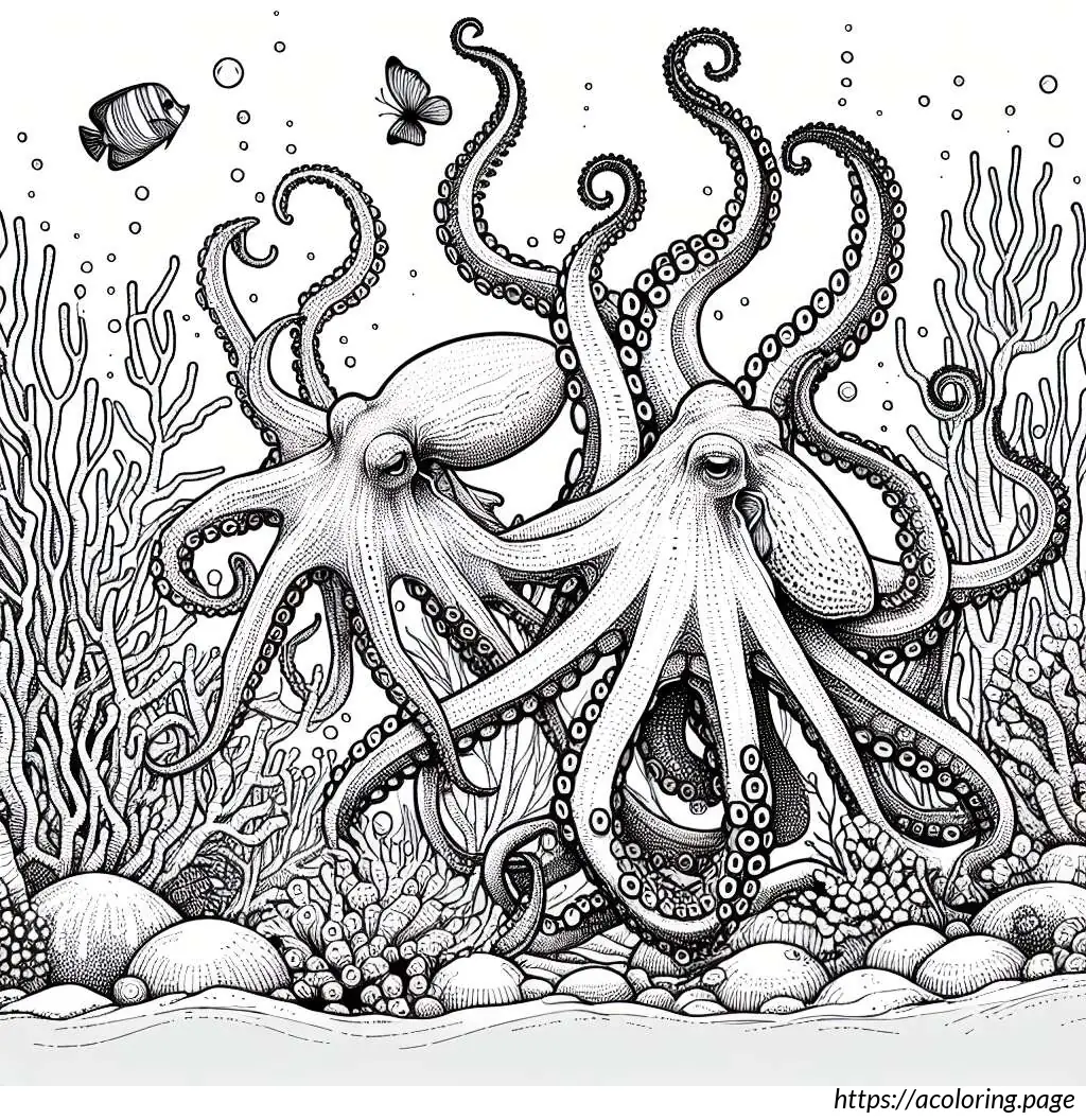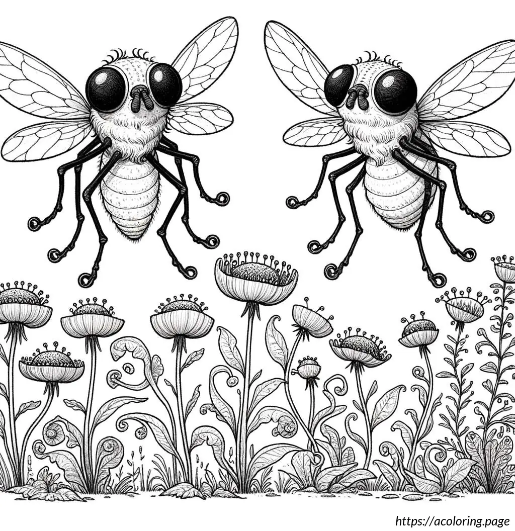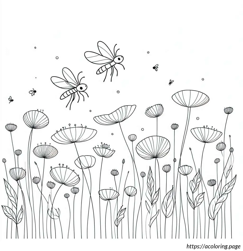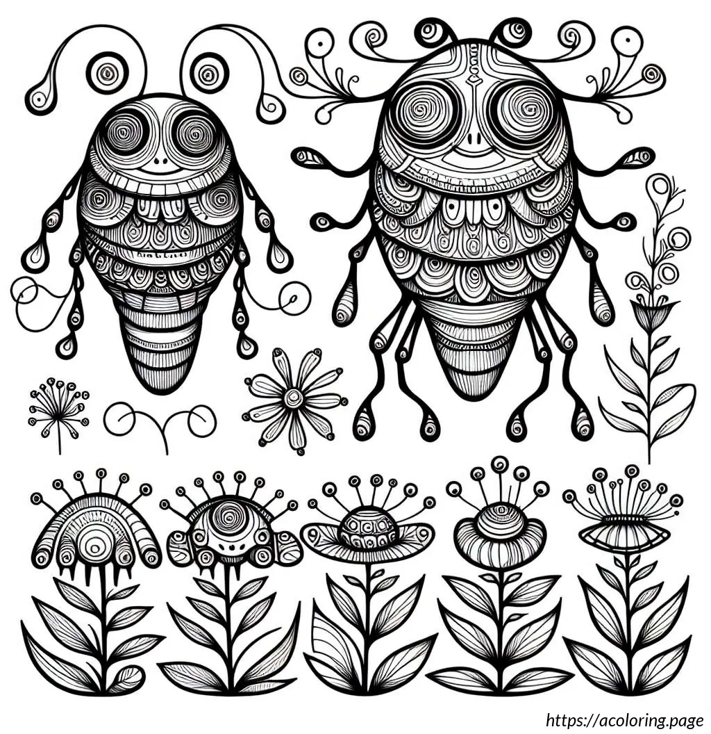 This is a black and white line drawing suitable for coloring. It features two whimsical, cartoonish butterflies above a field of tall flowers. The flowers have large, rounded leaves and the stems are tall and slender. The butterflies have playful expressions, big eyes, and their wings and bodies display simple, decorative markings akin to spots and stripes. The image is charming and designed to appeal to children, making it an ideal activity for coloring.