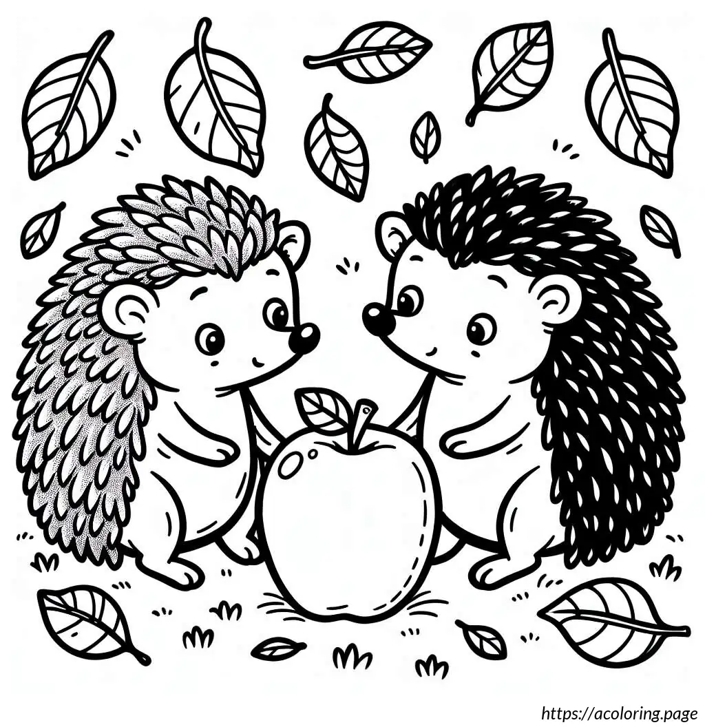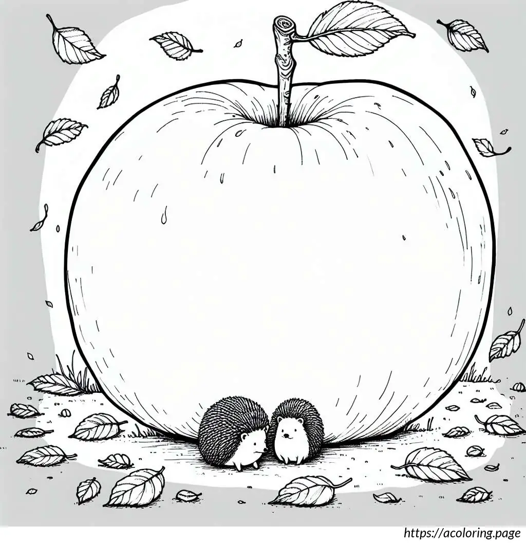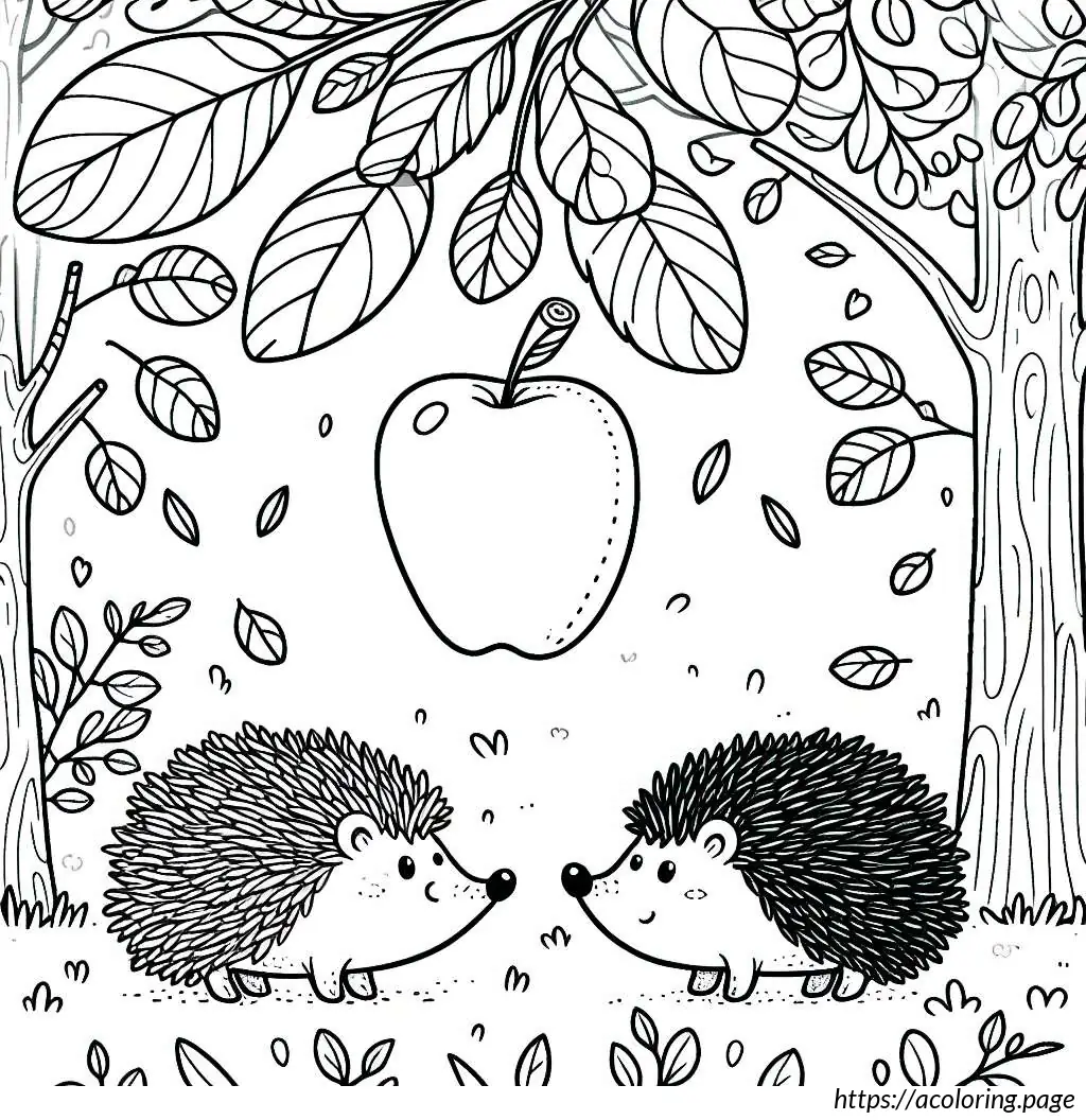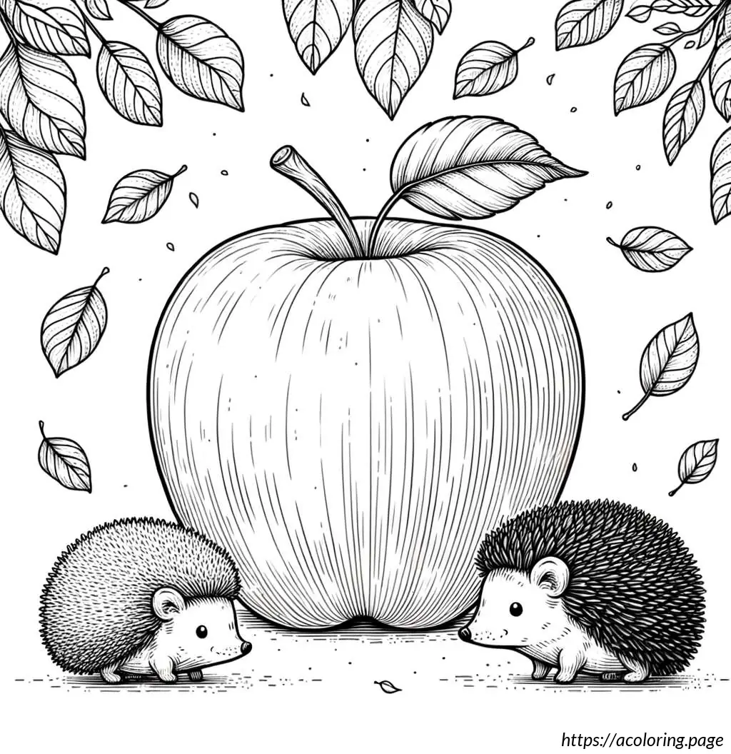 The image is a simple and cartoon-like line drawing featuring two hedgehogs and a large apple. The two hedgehogs are at the bottom of the image, facing each other, with spiky outlines suggesting their quills. Above them hangs a large apple, which is disproportionately bigger than the hedgehogs, suggesting it might be hanging from a tree, although the tree isn’t depicted in the image. A few leaves are floating around the scene, adding to the outdoor, autumnal feel of the drawing. The style is minimalistic with bold, clear lines and no colors or shading.