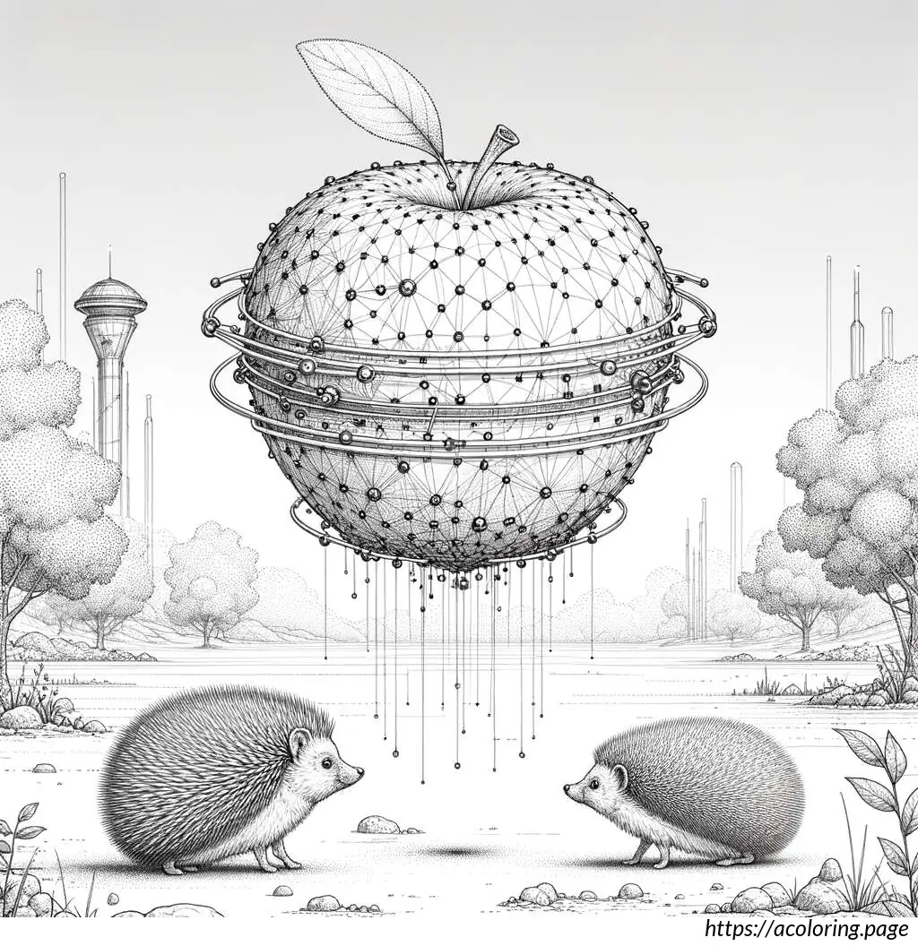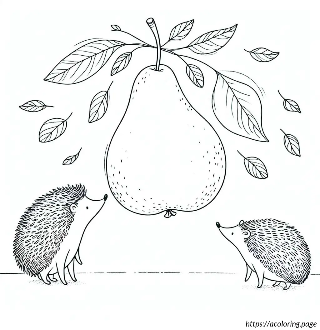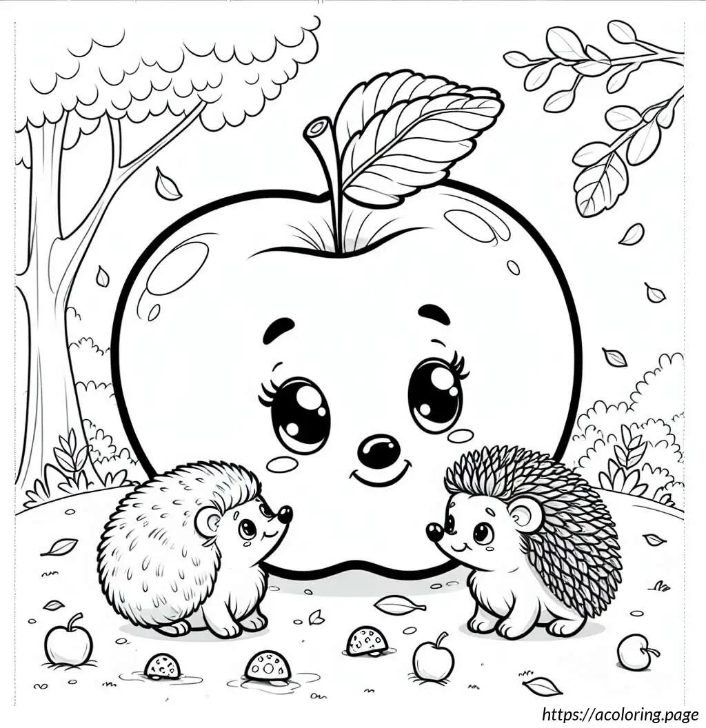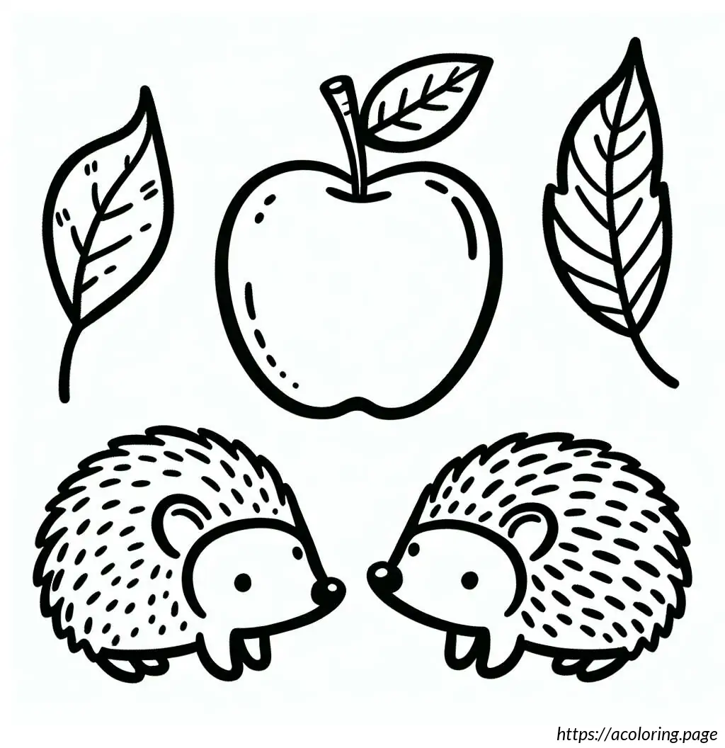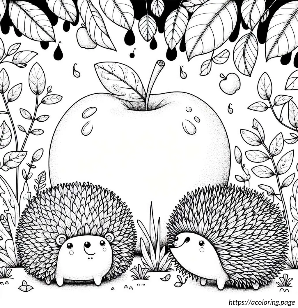 The image is a simple and cartoon-like line drawing featuring two hedgehogs and a large apple. The two hedgehogs are at the bottom of the image, facing each other, with spiky outlines suggesting their quills. Above them hangs a large apple, which is disproportionately bigger than the hedgehogs, suggesting it might be hanging from a tree, although the tree isn’t depicted in the image. A few leaves are floating around the scene, adding to the outdoor, autumnal feel of the drawing. The style is minimalistic with bold, clear lines and no colors or shading.