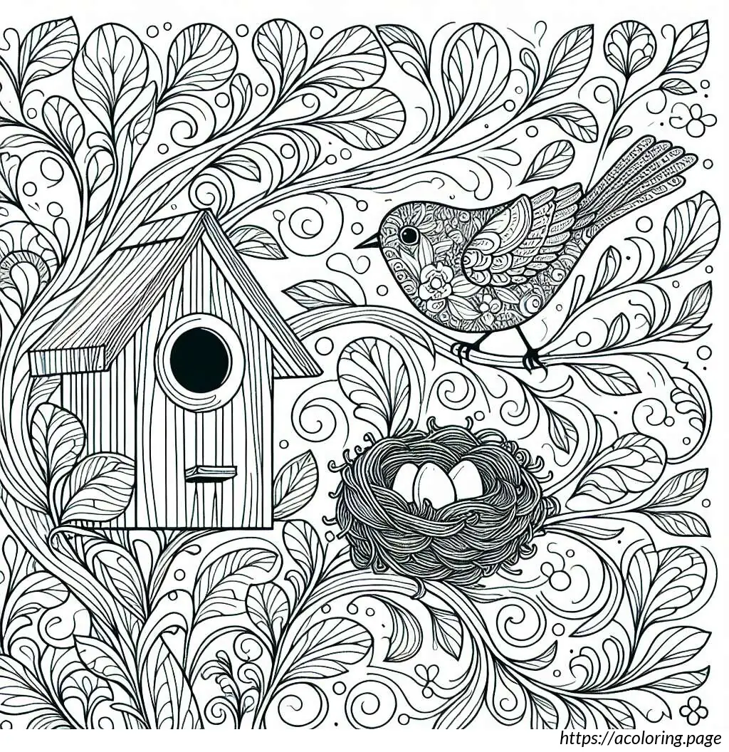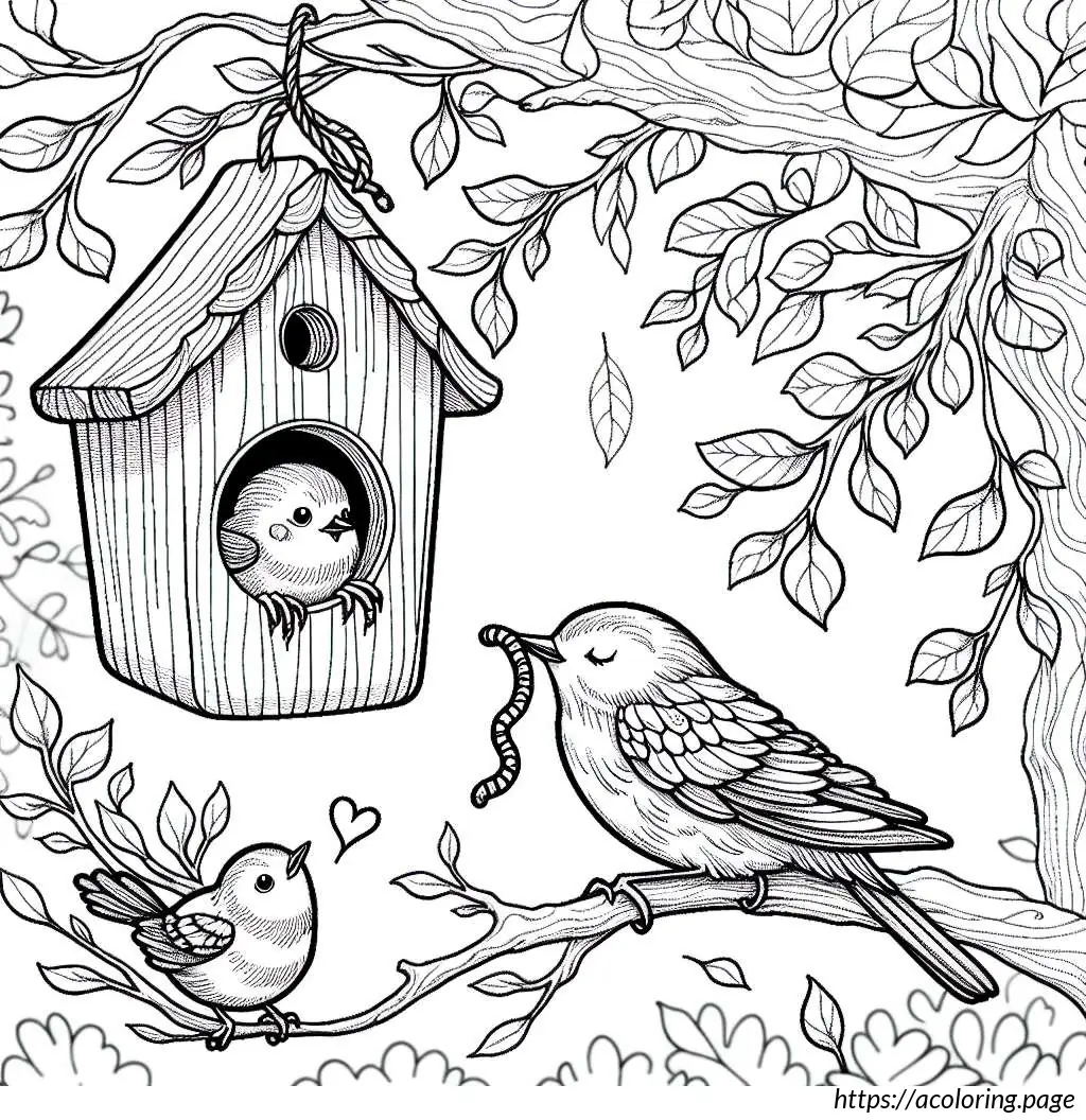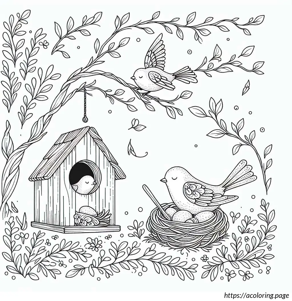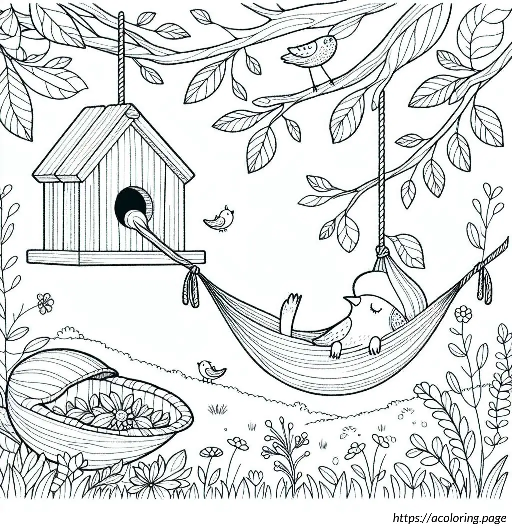 The image is a simple line drawing depicting a whimsical, nature-inspired scene. It shows a birdhouse attached to a branch at the left side. There is a bird inside the birdhouse peeking out. Above the birdhouse, on the same branch, there are two more birds. One is inside a half-open nutshell, using it as a hammock, and the other is sitting on the branch next to the hammock. There are a couple of leaves scattered around the scene, creating a natural and serene environment. This image has a playful and charming quality, using simple outlines to create a peaceful depiction of birds and their habitat.