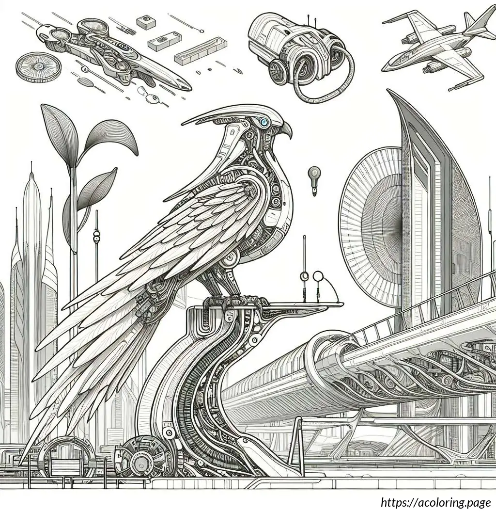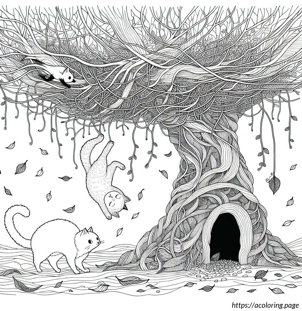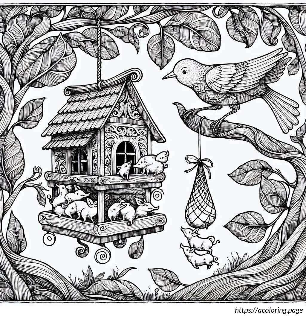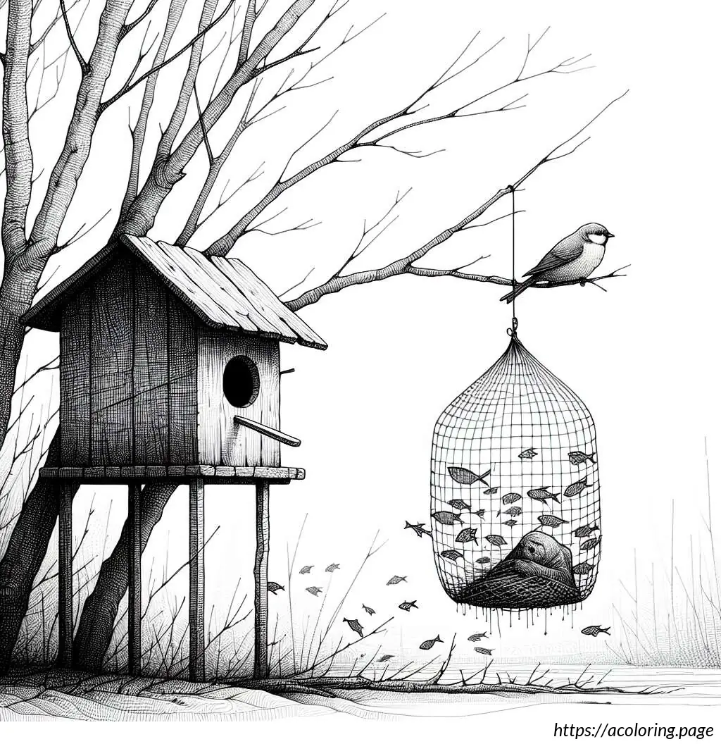 The image is a simple line drawing depicting a whimsical, nature-inspired scene. It shows a birdhouse attached to a branch at the left side. There is a bird inside the birdhouse peeking out. Above the birdhouse, on the same branch, there are two more birds. One is inside a half-open nutshell, using it as a hammock, and the other is sitting on the branch next to the hammock. There are a couple of leaves scattered around the scene, creating a natural and serene environment. This image has a playful and charming quality, using simple outlines to create a peaceful depiction of birds and their habitat.