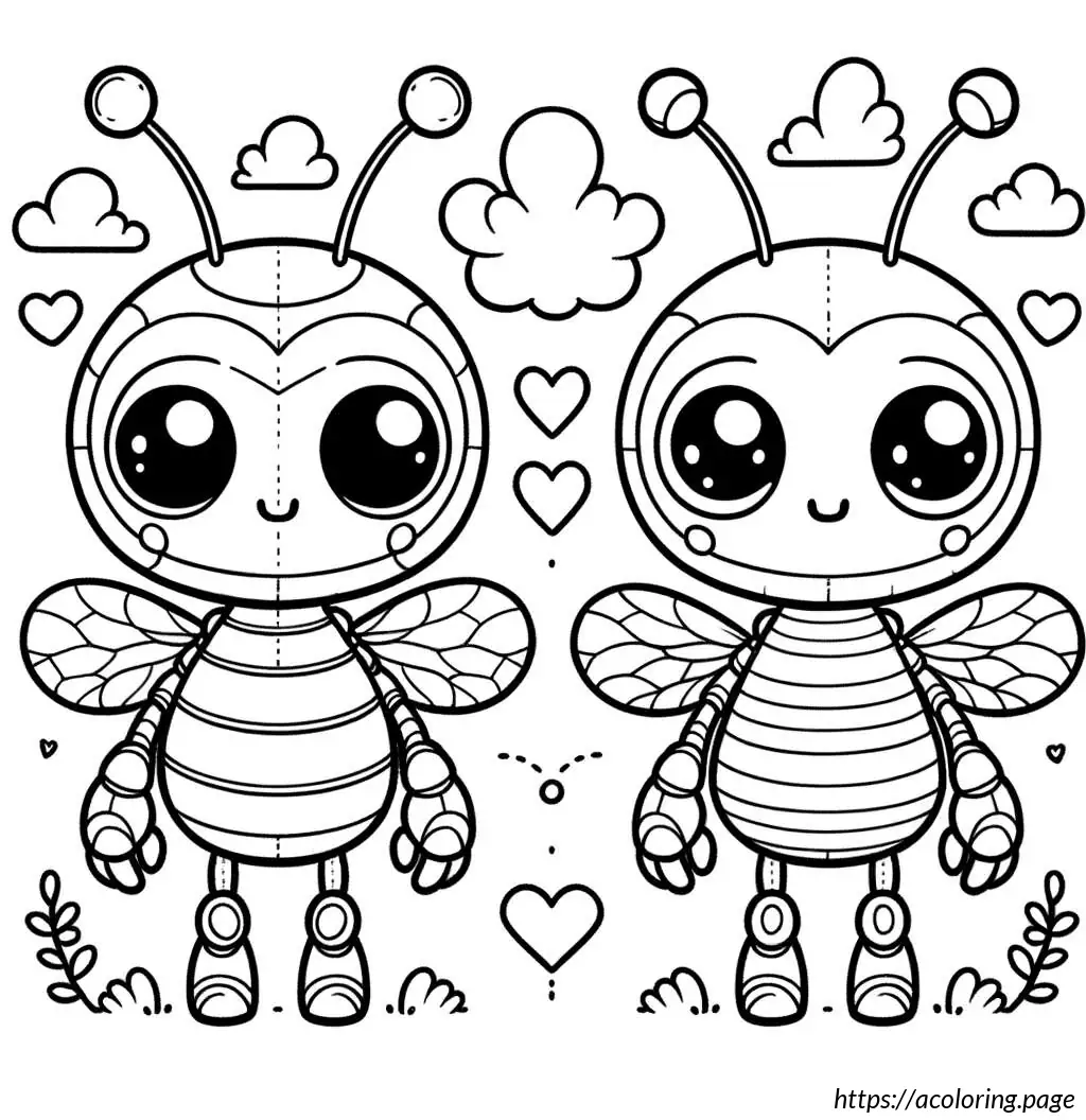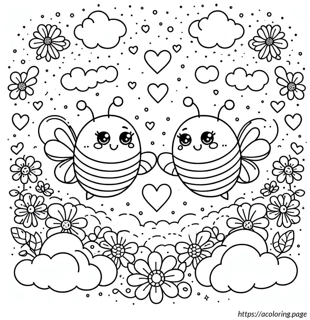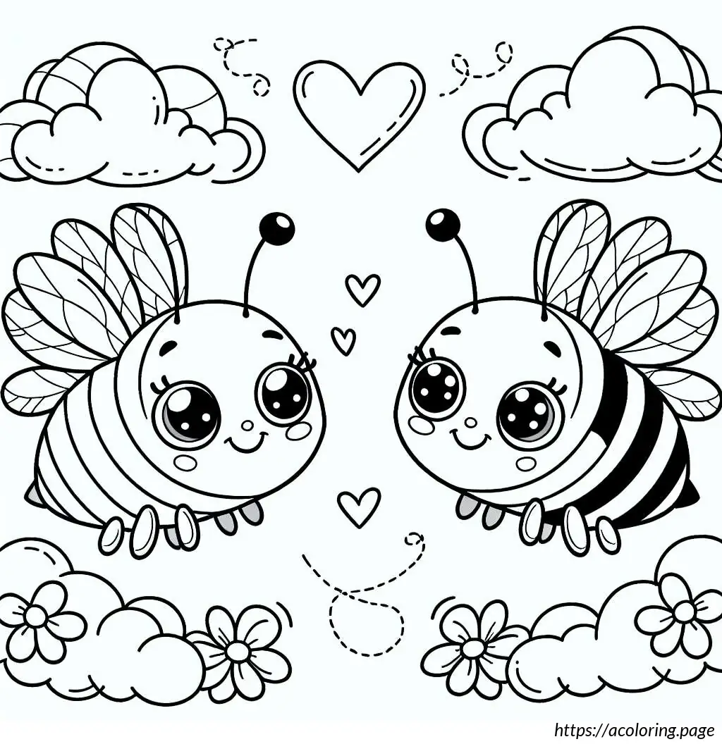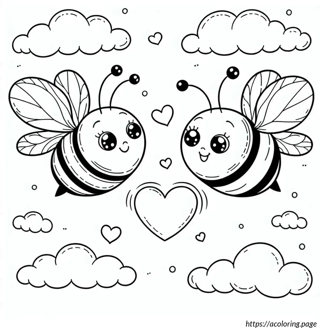 The image displays a cute, cartoon-style drawing of two bees in black and white. They both have large, friendly eyes and smiling faces. Each bee has two wings, two antennae, and their bodies are divided into sections, adorned with stripes. They are positioned floating among stylized clouds, and there is a heart shape floating between them, symbolizing affection or friendship. The overall style of the image is simple and seems designed for coloring activities, especially suitable for children.
