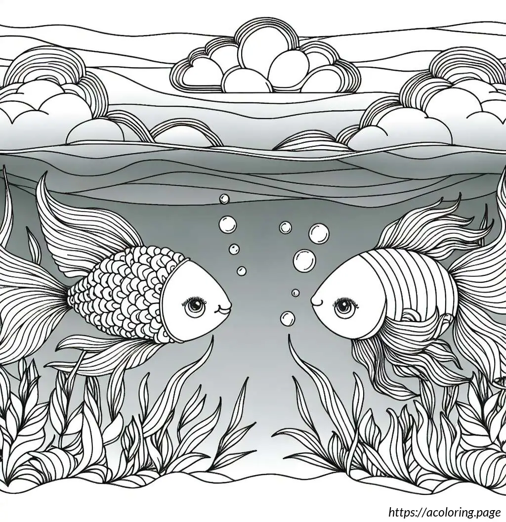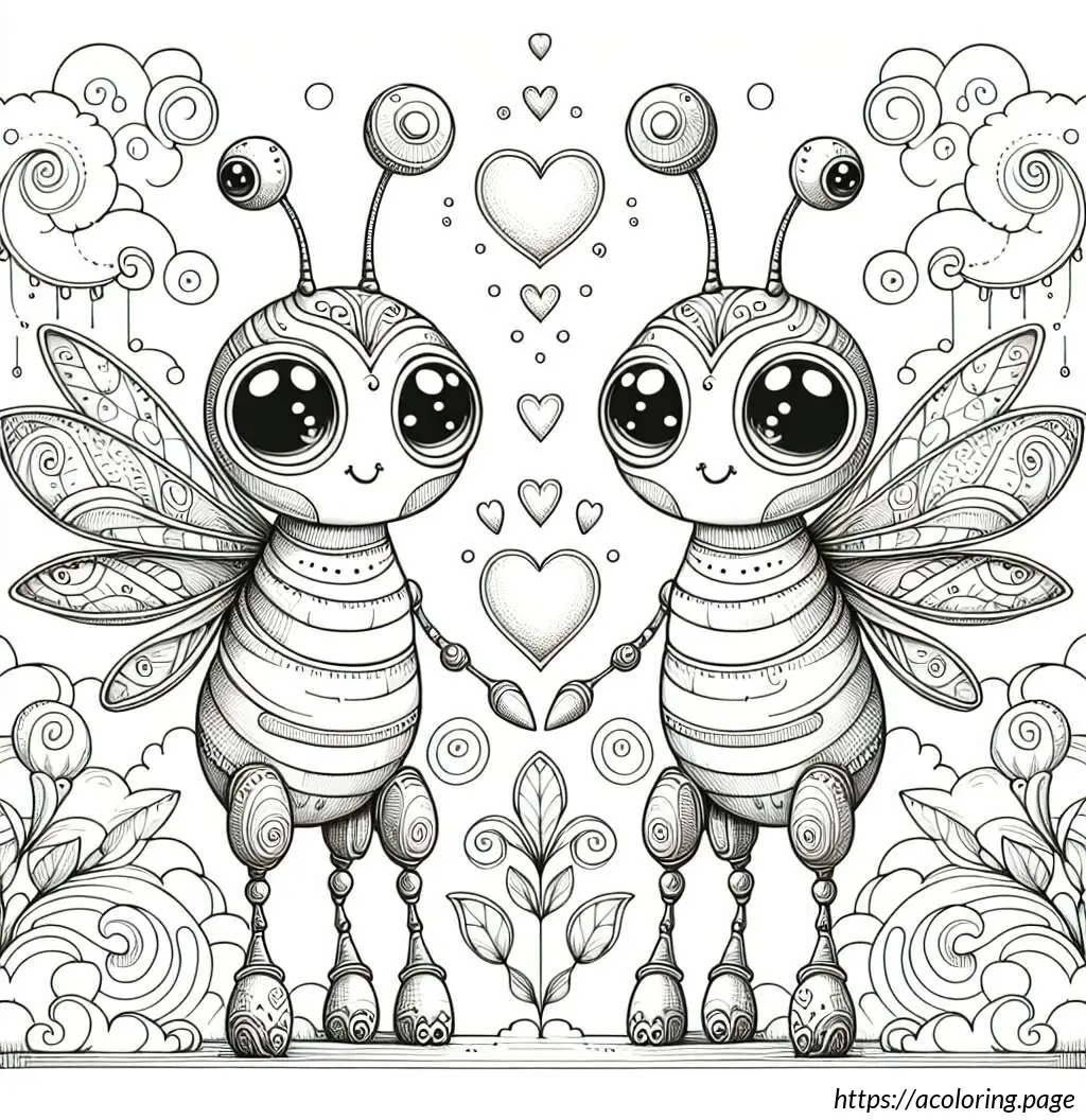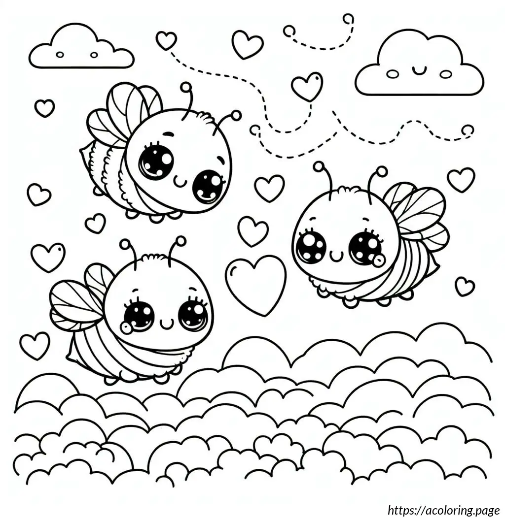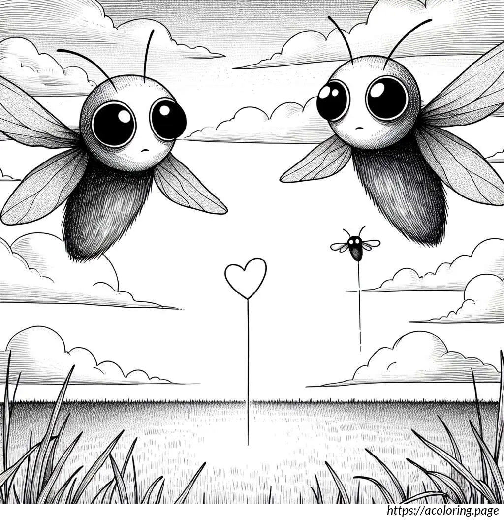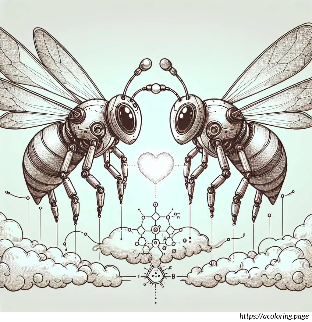 The image displays a cute, cartoon-style drawing of two bees in black and white. They both have large, friendly eyes and smiling faces. Each bee has two wings, two antennae, and their bodies are divided into sections, adorned with stripes. They are positioned floating among stylized clouds, and there is a heart shape floating between them, symbolizing affection or friendship. The overall style of the image is simple and seems designed for coloring activities, especially suitable for children.