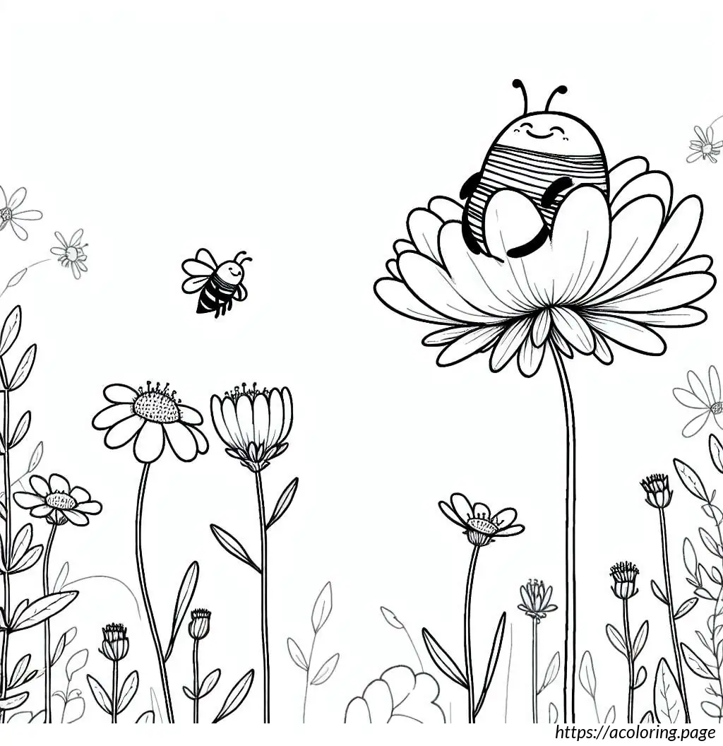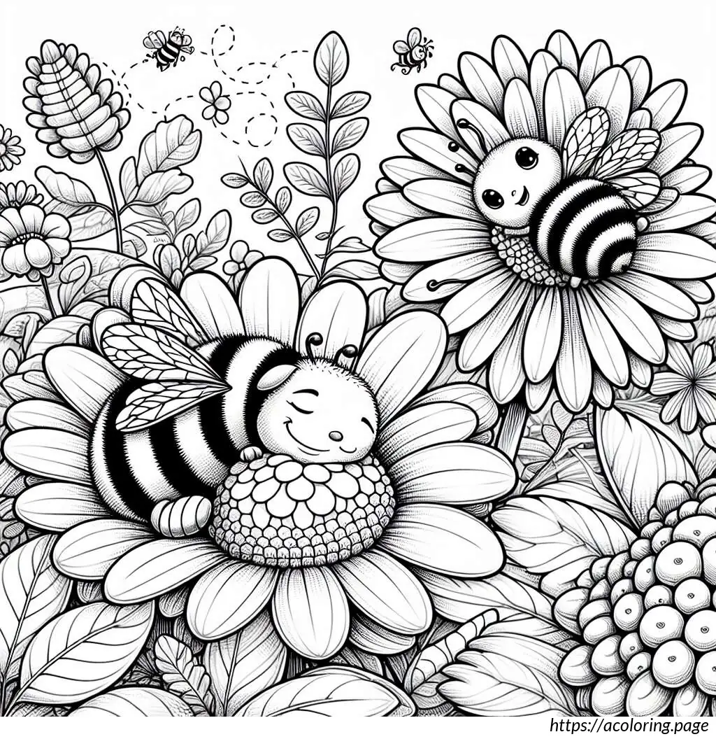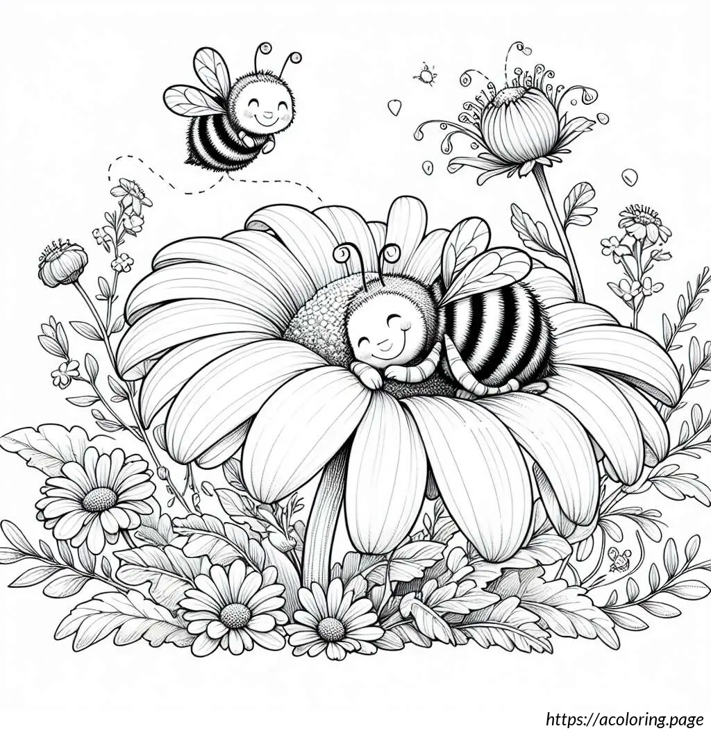 This image is a black and white line drawing, suitable for coloring. It features a playful scene with two cartoon bees in a garden setting. One bee is happily sleeping, curled up on a fluffy daisy-like flower. This bee has a contented smile and appears quite peaceful. The other bee is smaller and is depicted in flight with a joyful expression on its face. Both bees have typical features such as stripes, wings, and antennae.