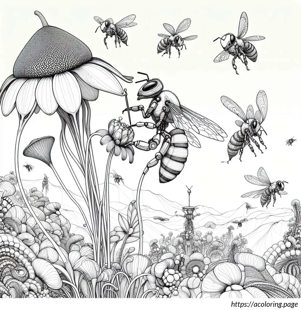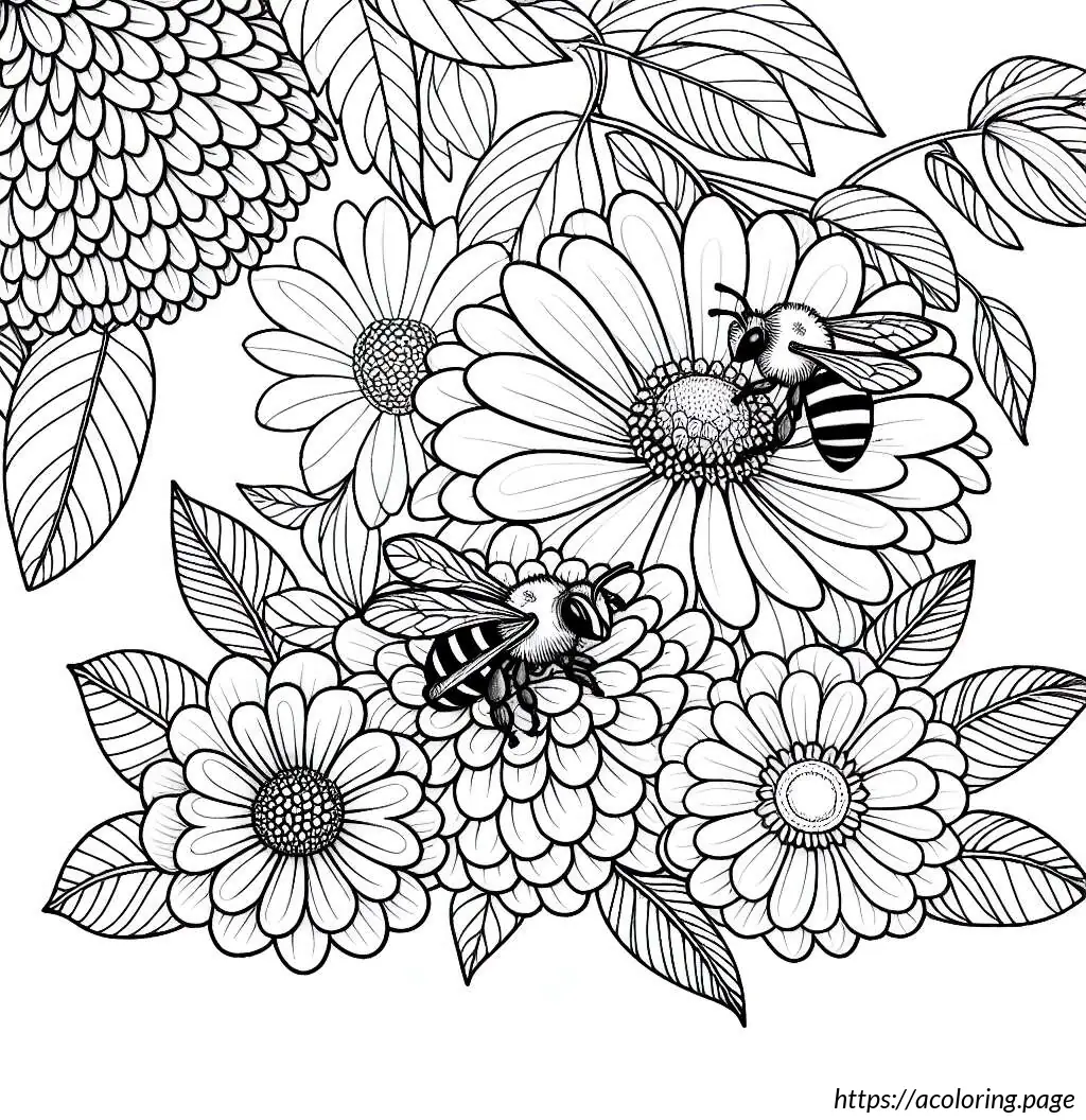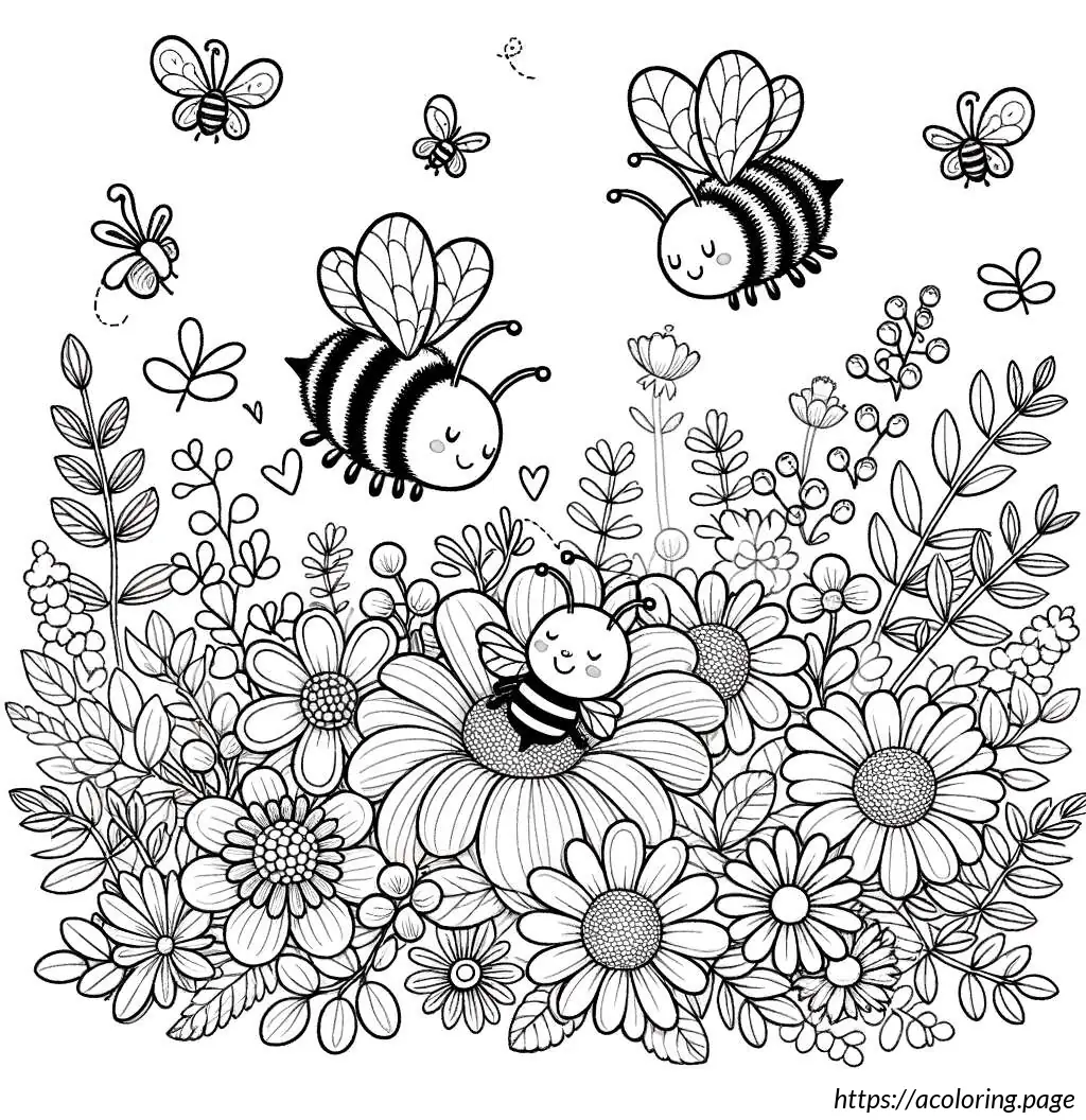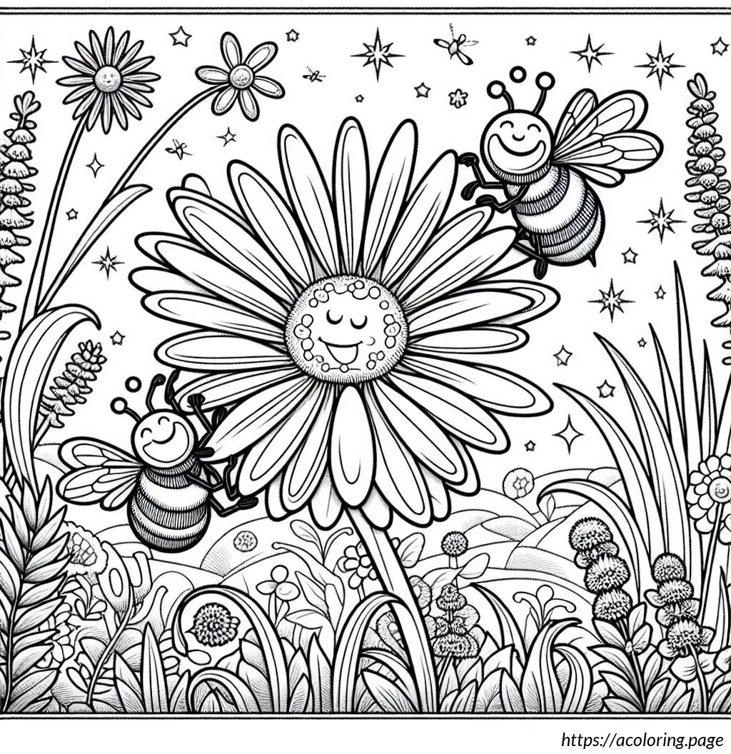 This image is a black and white line drawing, suitable for coloring. It features a playful scene with two cartoon bees in a garden setting. One bee is happily sleeping, curled up on a fluffy daisy-like flower. This bee has a contented smile and appears quite peaceful. The other bee is smaller and is depicted in flight with a joyful expression on its face. Both bees have typical features such as stripes, wings, and antennae.