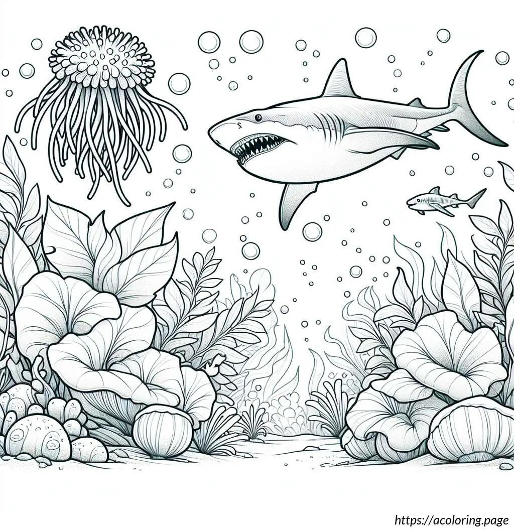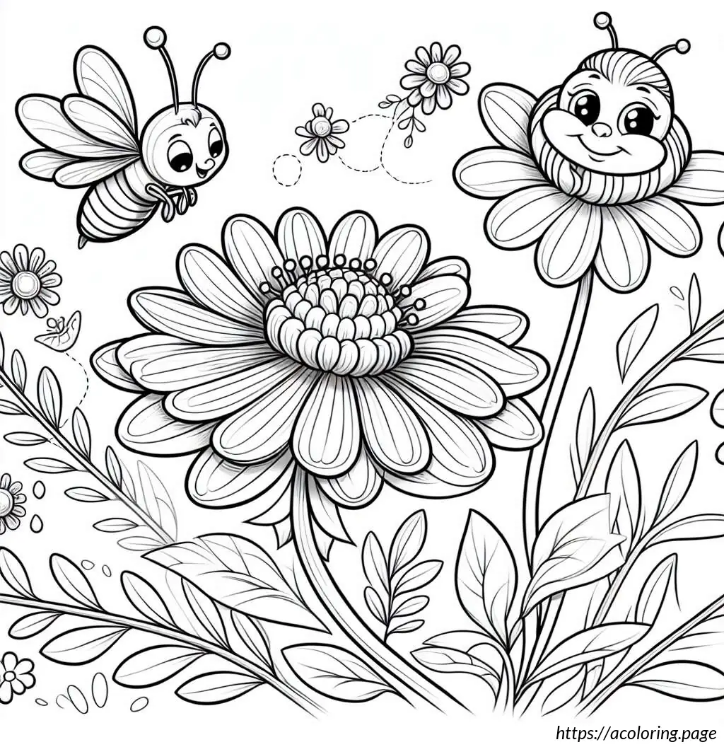 The garden setting includes large, detailed flowers and several leaves. In the background, there is a flower that resembles a burst of stamens and petals, adding to the lushness of the scene. The image uses simple, bold outlines which make it ideal for young children to color and enjoy.